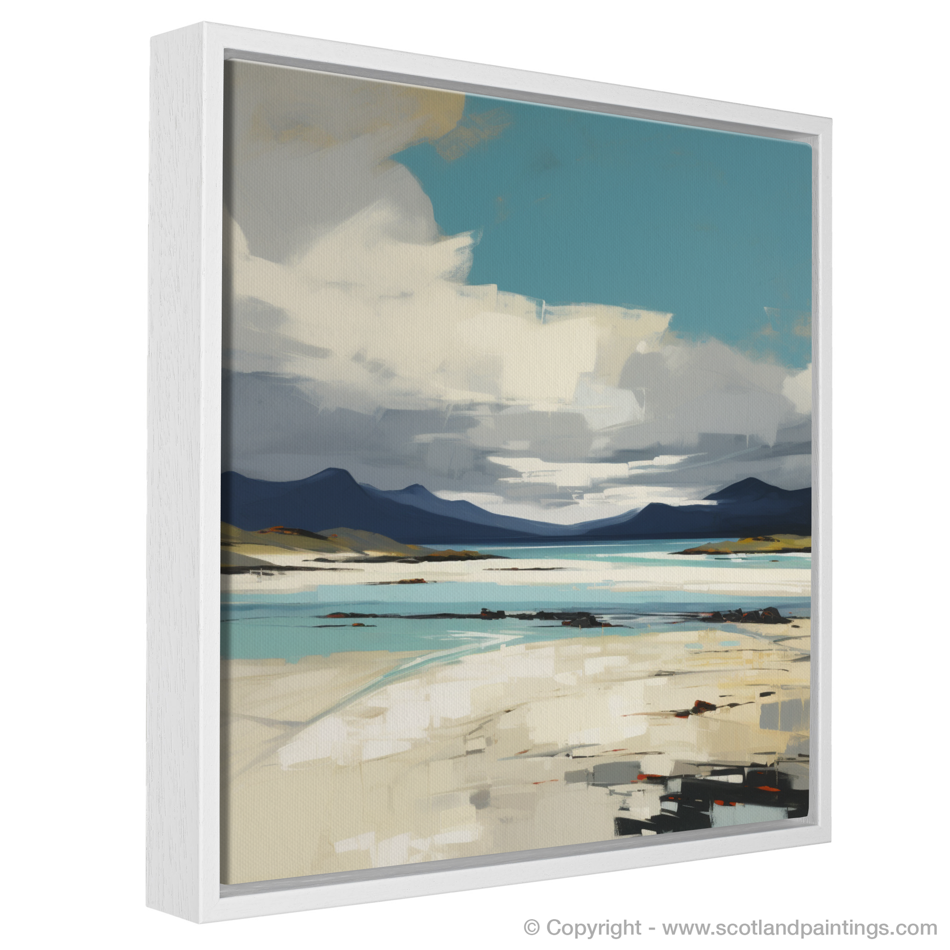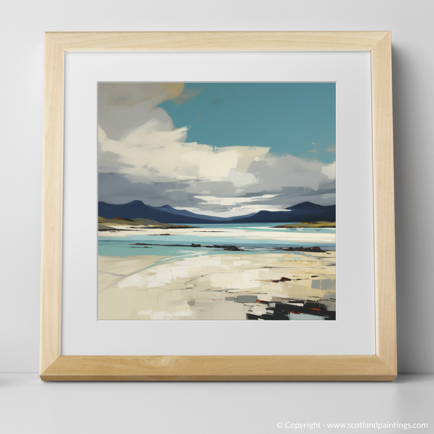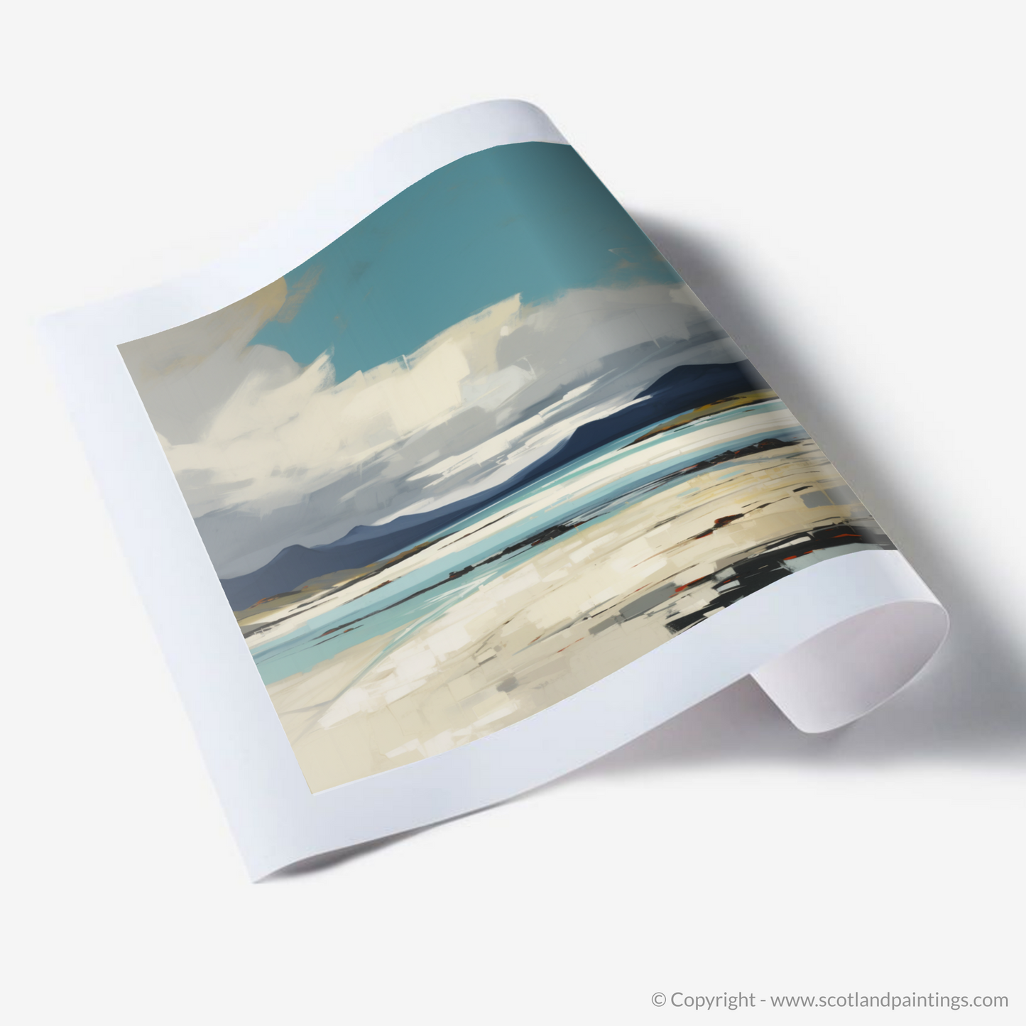 This captivating print exudes the raw beauty and dramatic allure of Luskentyre Sands, celebrated as one of Scotland's most breathtaking shores. Evoking the essence of the Outer Hebrides, the expressionist style brings a vigorous and emotional interpretation to the scene, characterised by bold brushwork and a dynamic use of colour.