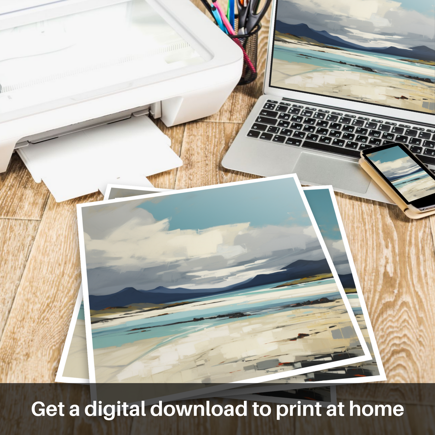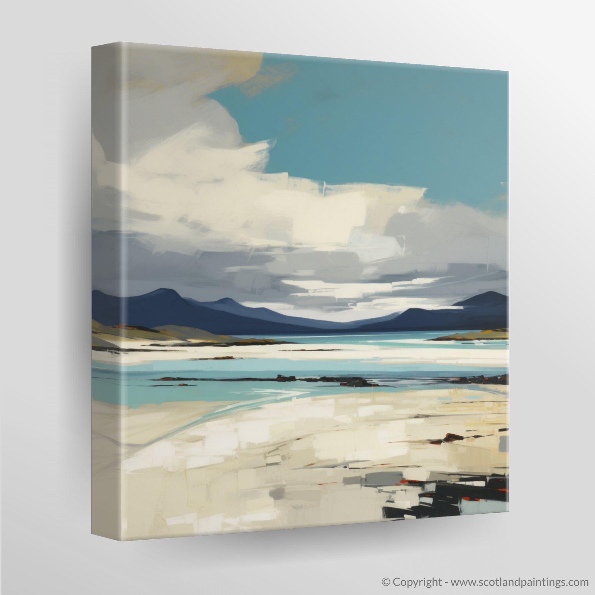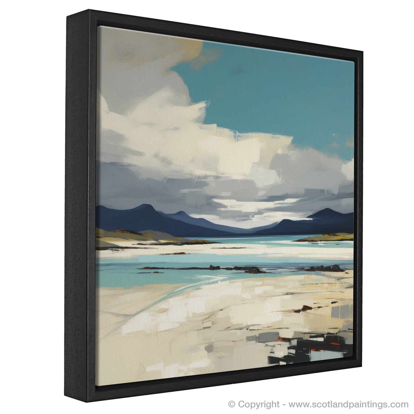 This captivating print exudes the raw beauty and dramatic allure of Luskentyre Sands, celebrated as one of Scotland's most breathtaking shores. Evoking the essence of the Outer Hebrides, the expressionist style brings a vigorous and emotional interpretation to the scene, characterised by bold brushwork and a dynamic use of colour.
