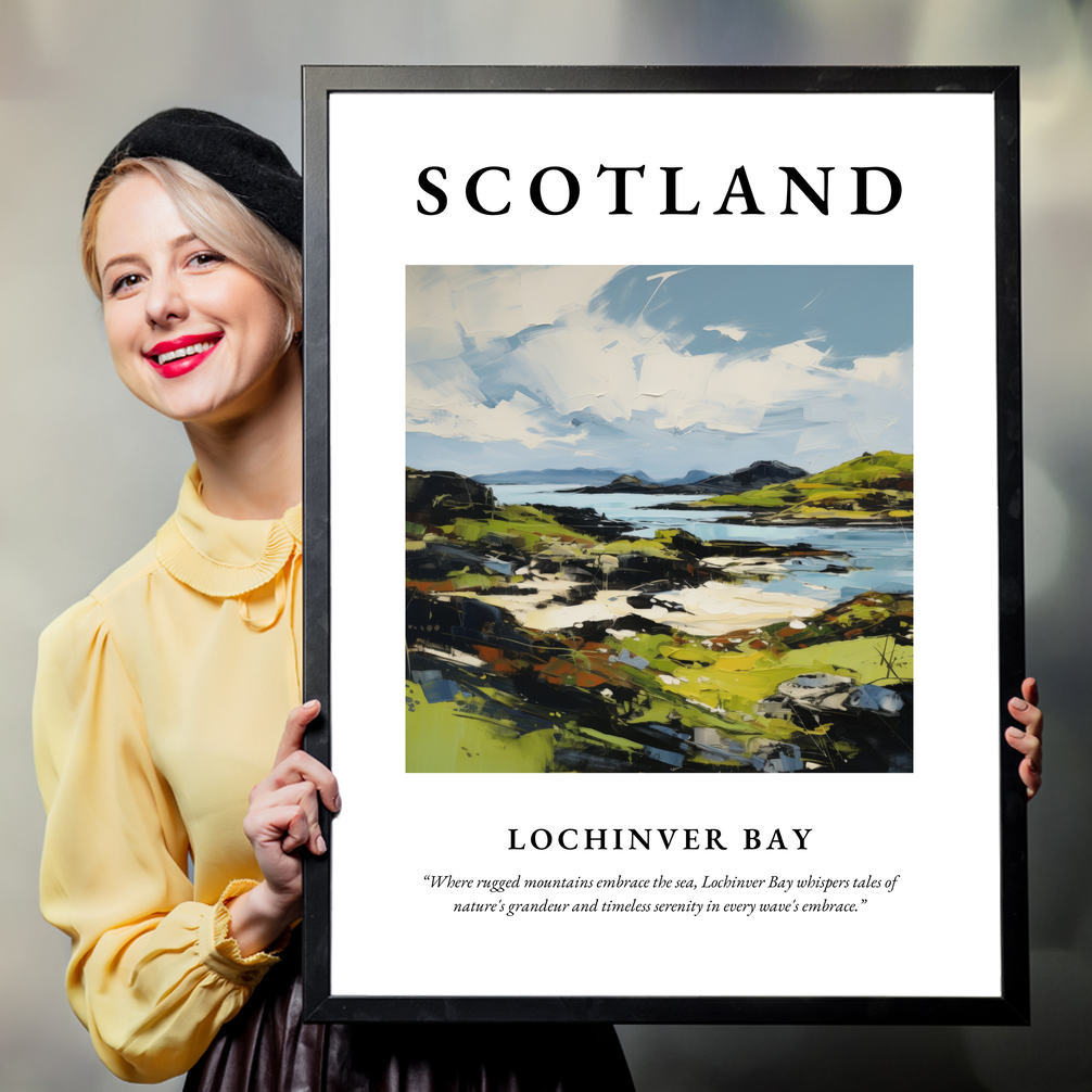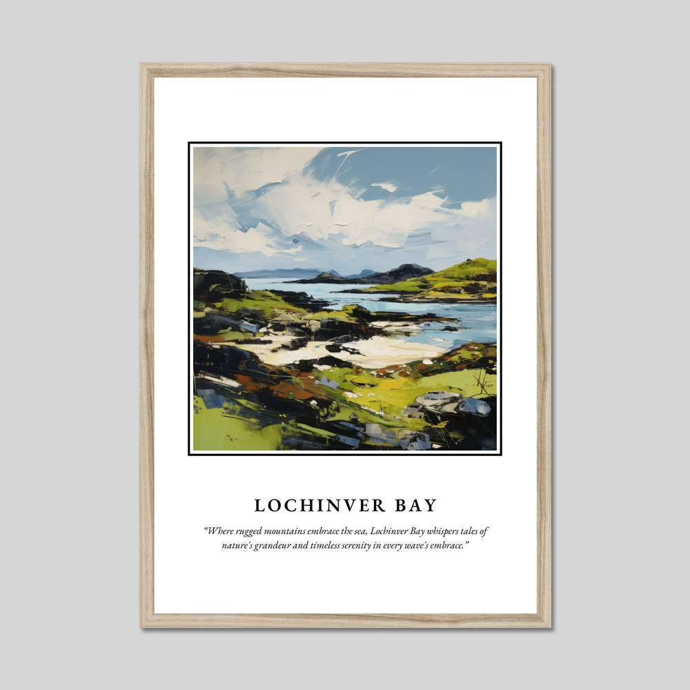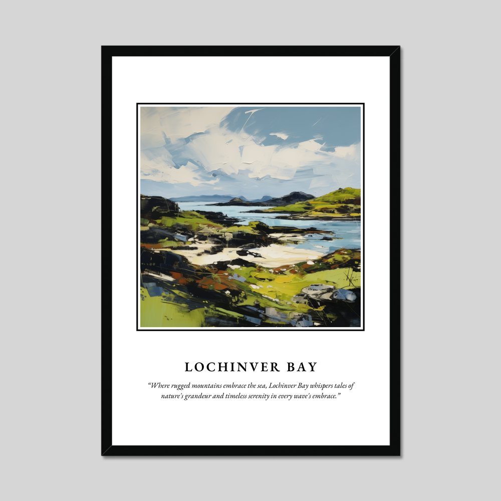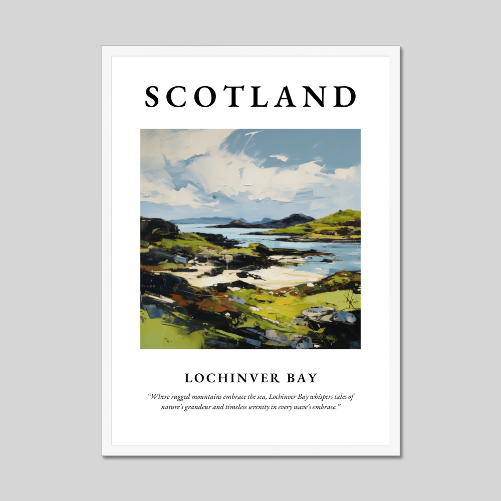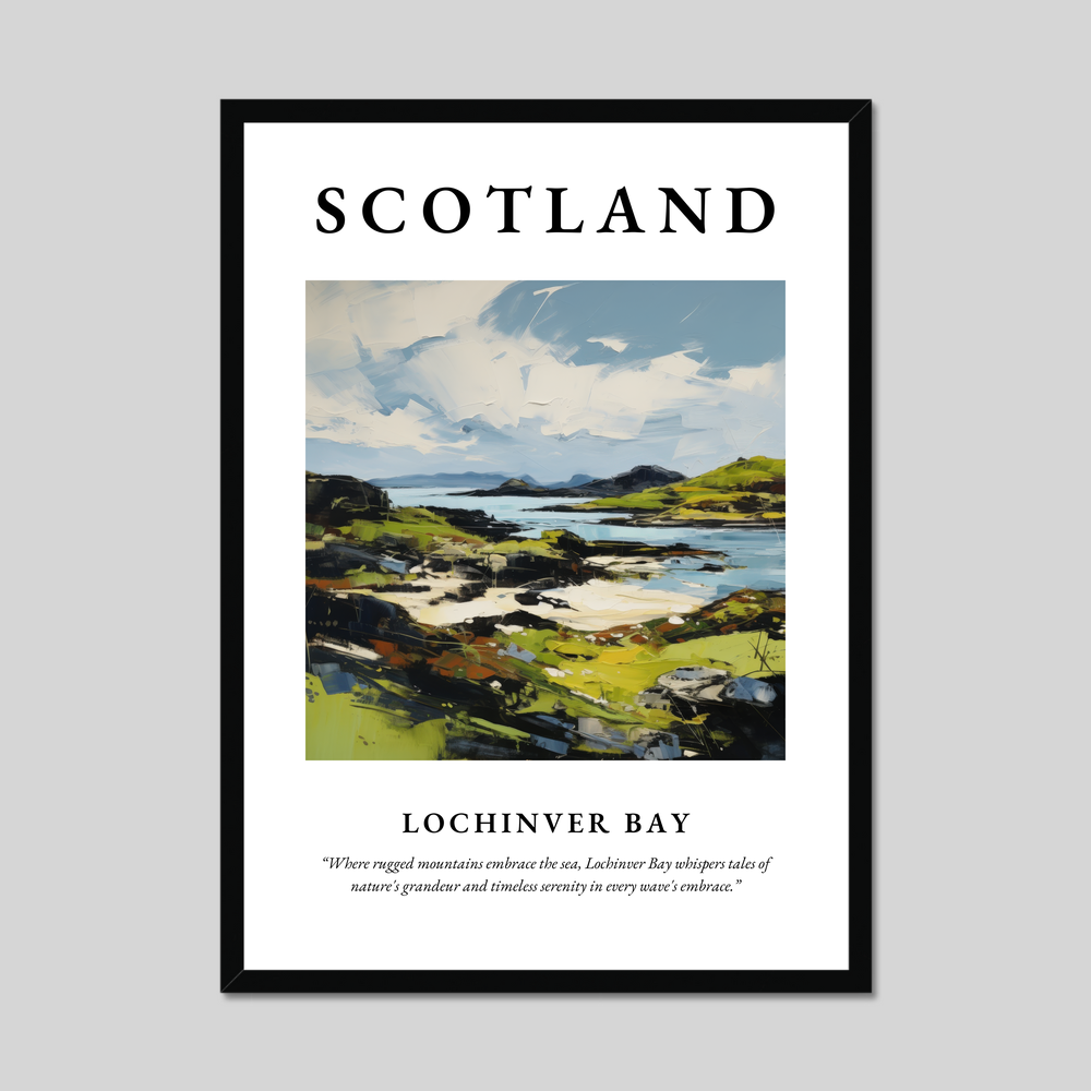 Immerse yourself in the mystique of the Scottish Highlands with our striking framed poster print, measuring an impressive 50cm x 70cm. This exquisite piece is a showstopper, featuring the bold heading “SCOTLAND” above a captivating painting of Lochinver Bay, all crafted in the dynamic Expressionism style. Beneath this vivid depiction lies the evocative quote, “Where rugged mountains embrace the sea, Lochinver Bay whispers tales of nature's grandeur and timeless serenity in every wave's embrace,” perfectly encapsulating the spirit of this enchanting location.