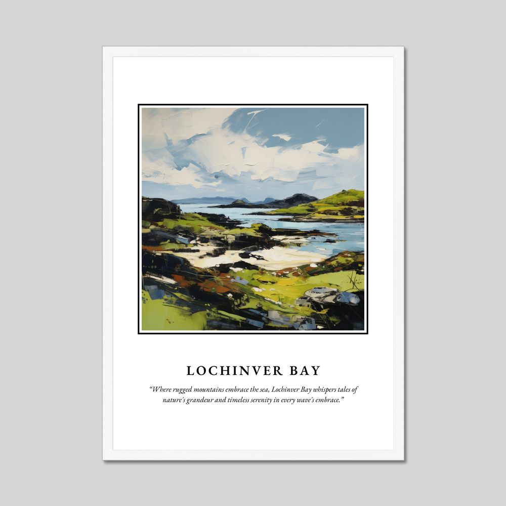 The painting brilliantly mirrors the bay's unique charm, where the raw beauty of nature and the artwork intertwine, each wave and brushstroke echoing tales of the timeless landscapes and the tranquil embrace of sea and sky. Whether you’re reminiscing about past adventures or dreaming of future visits, this framed poster print is a stunning addition to any art collection, breathing the wild, untouched spirit of Lochinver Bay into your home.