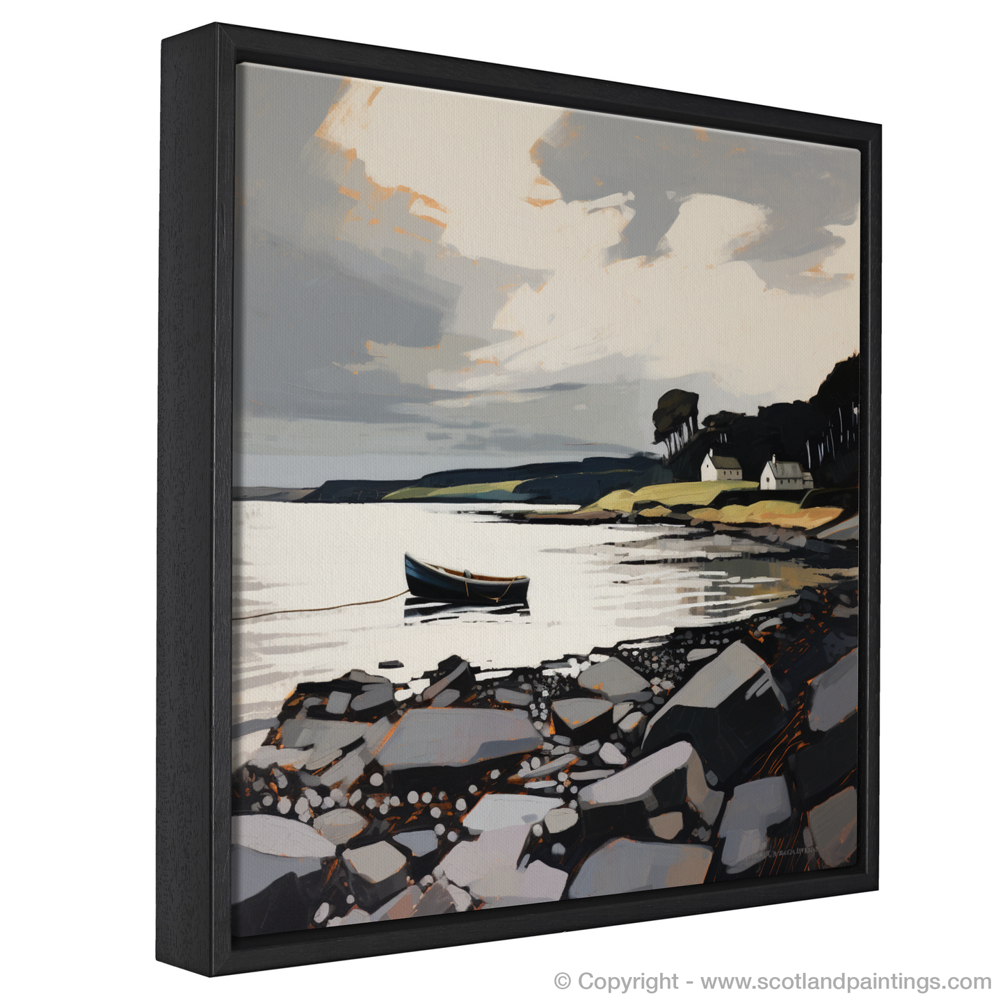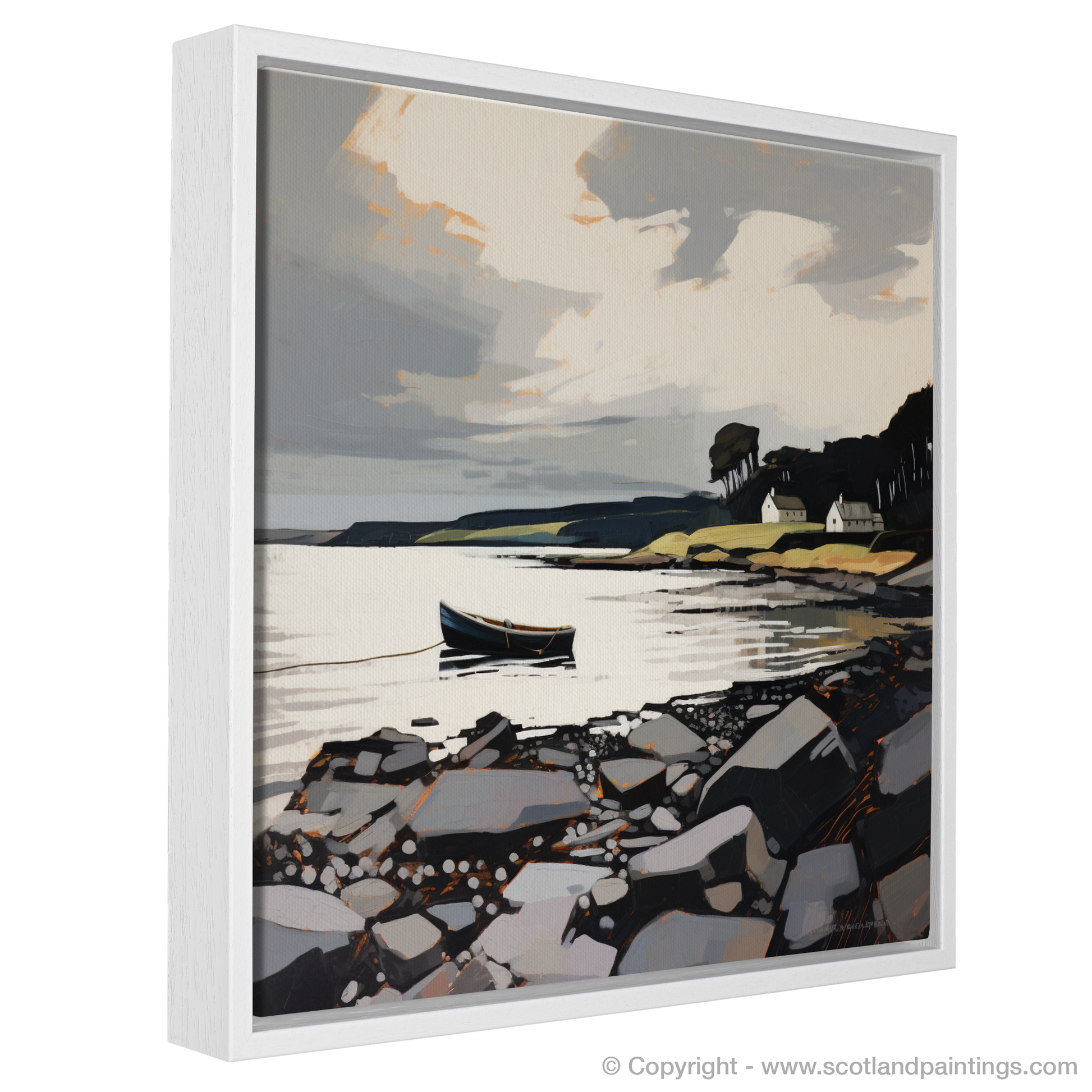 Capturing the rugged beauty of Scotland's coast, this expressive print depicts the serene ambience of Largo Bay, Fife. Bold brushstrokes and a dynamic palette of cool greys, stark whites, and deep blacks define the rocky shoreline that draws the eye towards the tranquil waters. A solitary boat adjoined by a thin, taut rope sways gently on the reflective surface of the sea, hinting at the presence of life amidst the stillness.