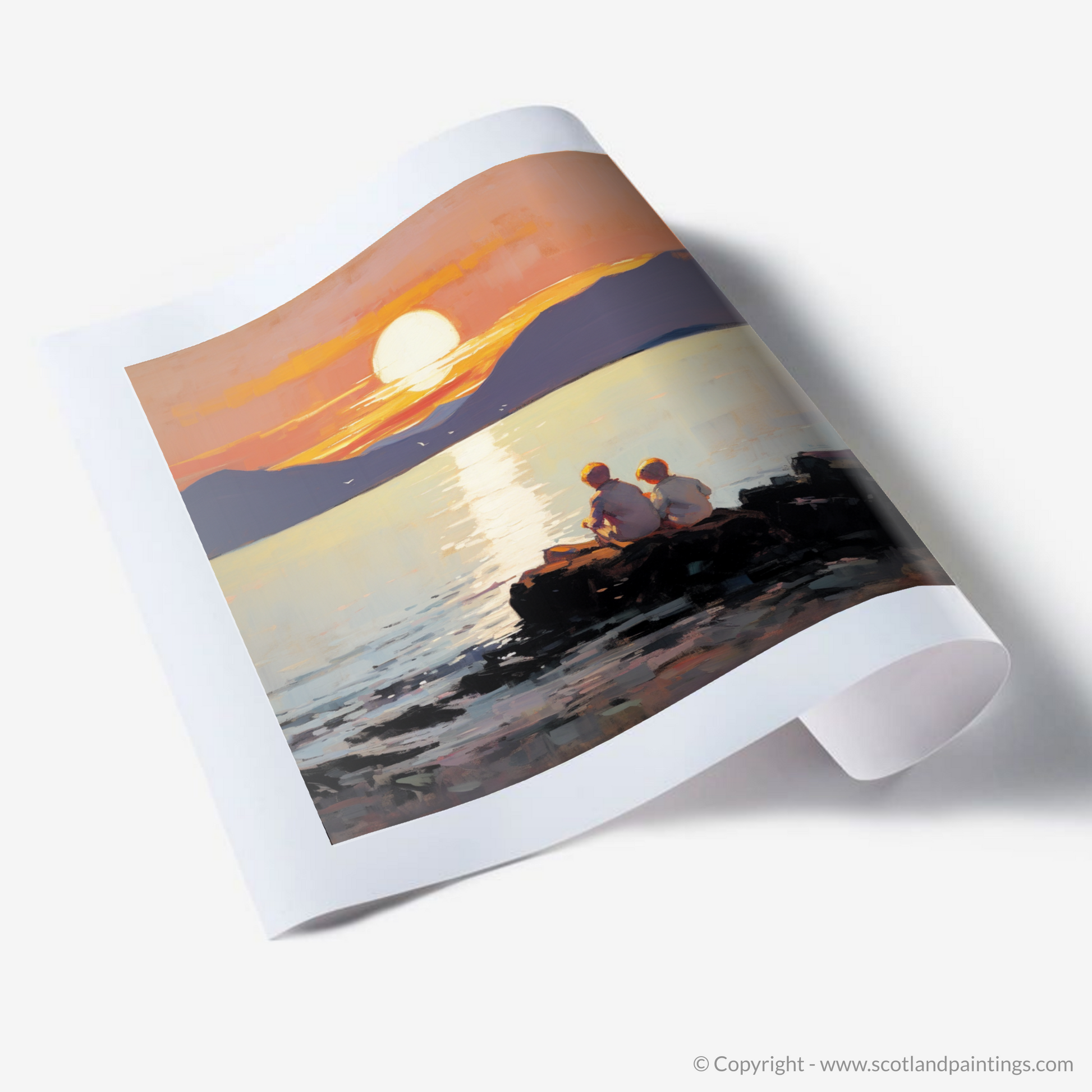 Captured within this evocative print is a serene moment as two young explorers perch on the rugged outcrops of Saltcoats Beach, their gaze drawn to the majestic sunset unfurling over the Isle of Arran. The impressionistic brushstrokes convey the warmth of the late evening sky, ablaze in hues of deep orange, fiery red, and a range of soft peaches, melting seamlessly into one another as they enfold the descending sun.