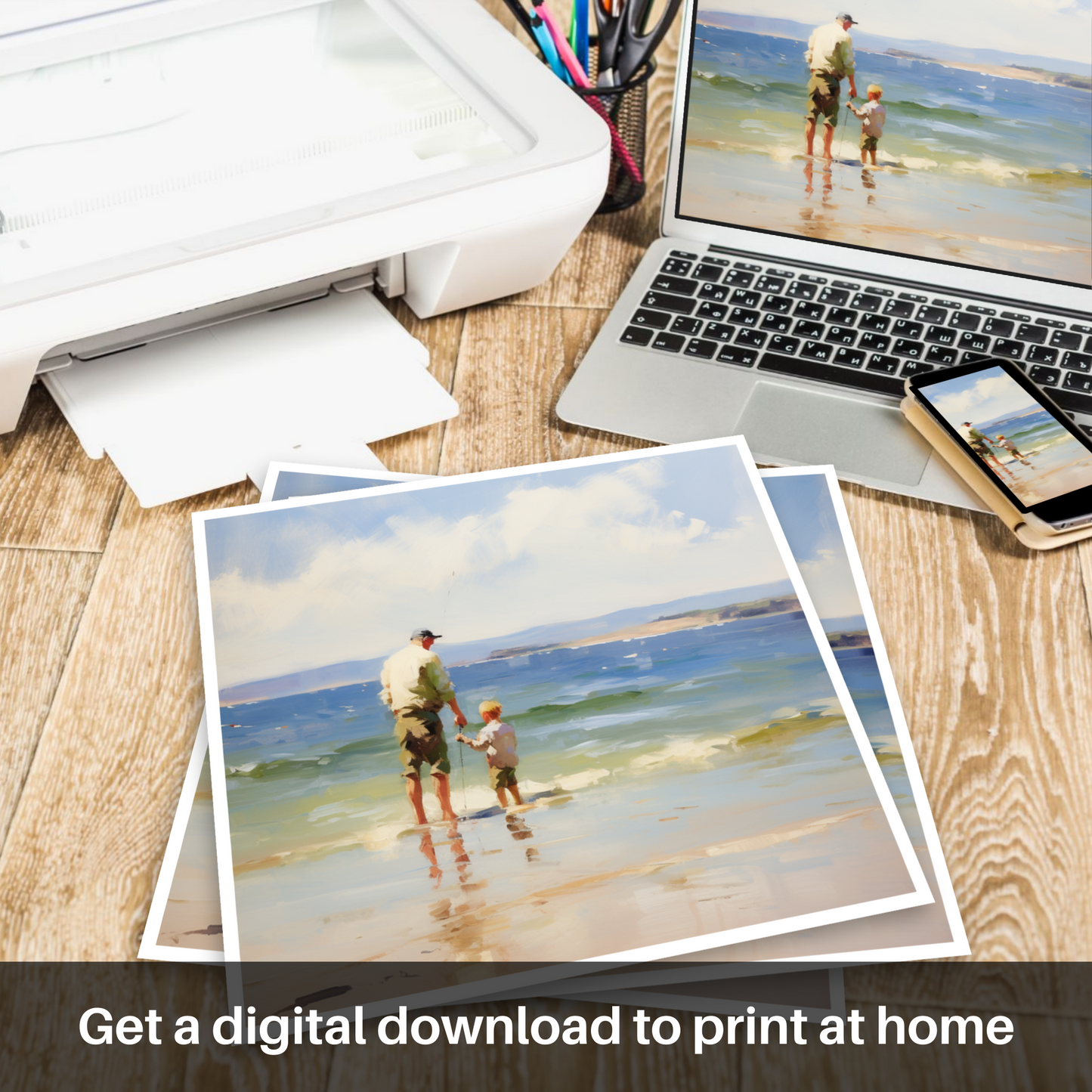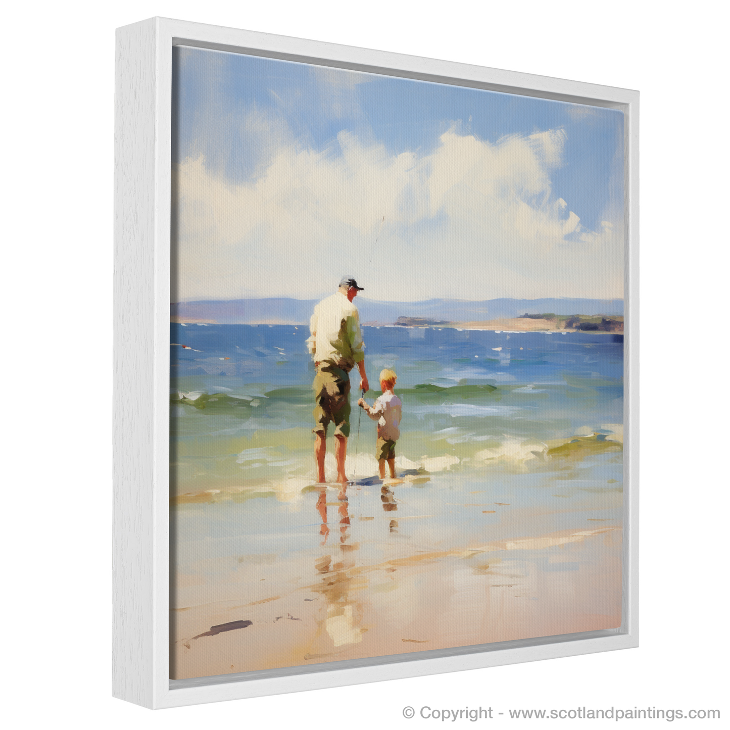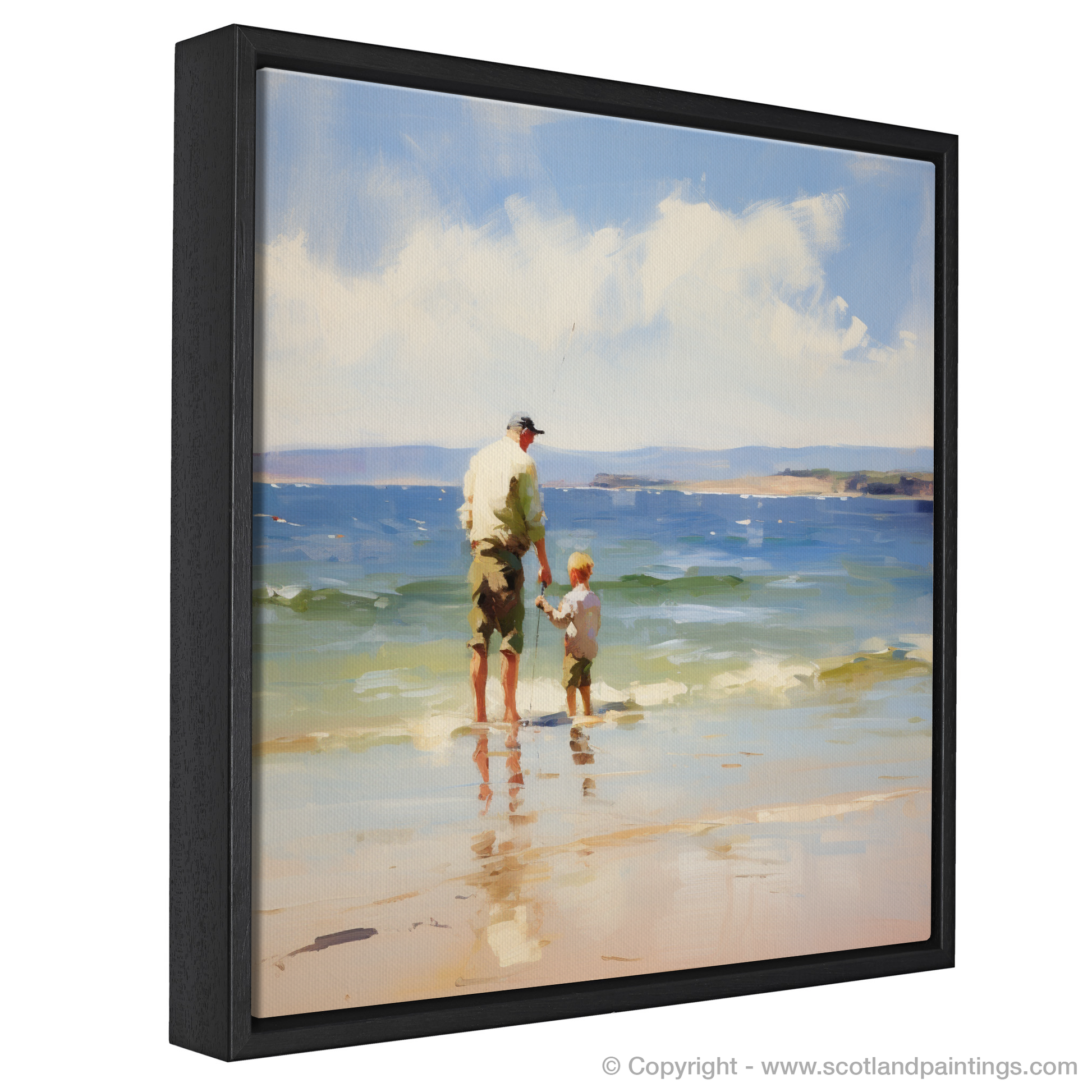 Capture the essence of familial bonds and the tranquility of nature with this evocative print, inspired by the serene moments of a father and son fishing at Rosemarkie Beach. The artwork, with its impressionistic brushstrokes, infuses the canvas with a dreamlike quality, inviting the viewer into a peaceful coastal scene.