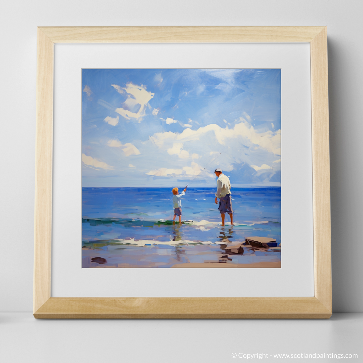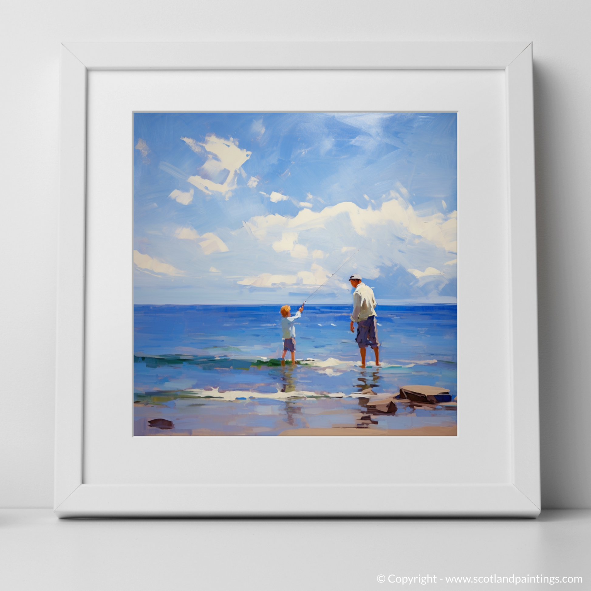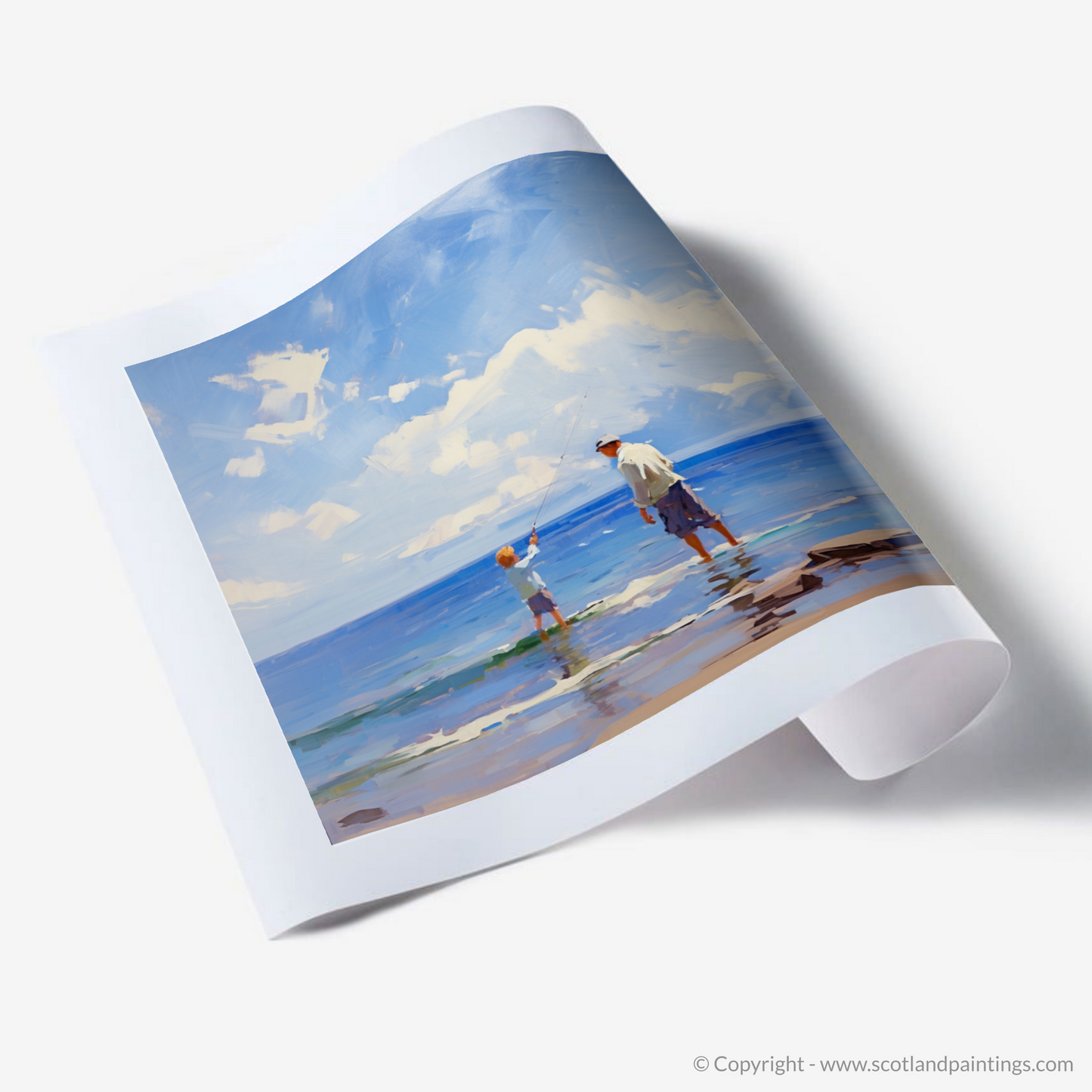 Painting and Art Print of A dad and son fishing at Rosemarkie Beach entitled "Fishing Together at Rosemarkie Beach - An Impressionist Reflection of Father-Son Bonding".