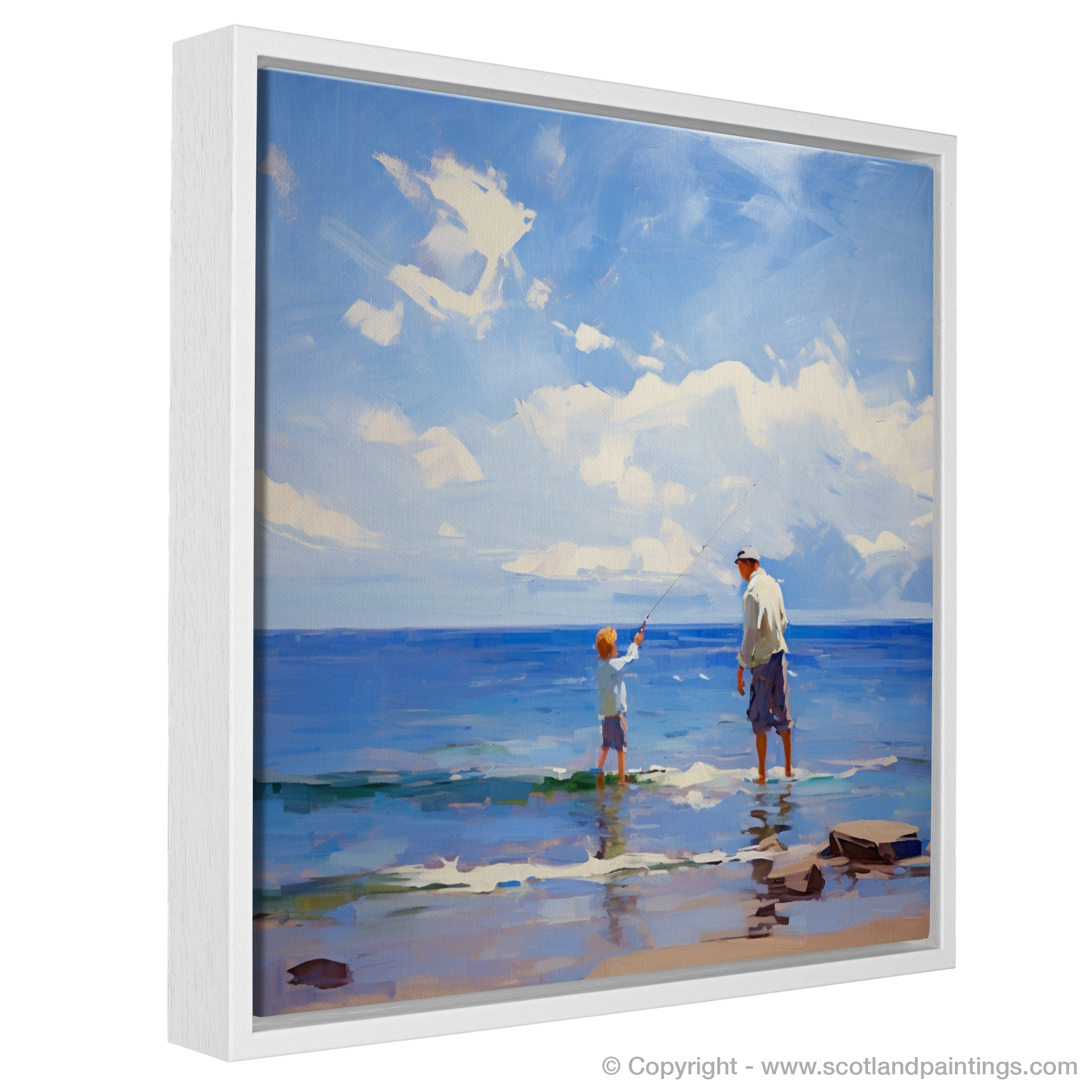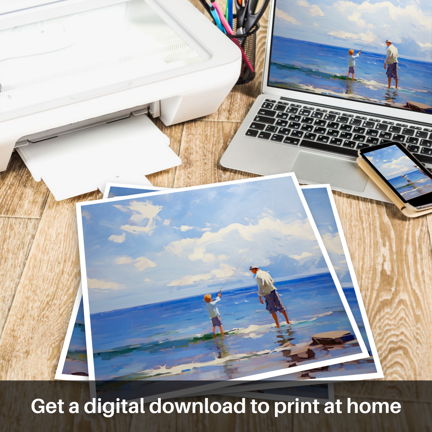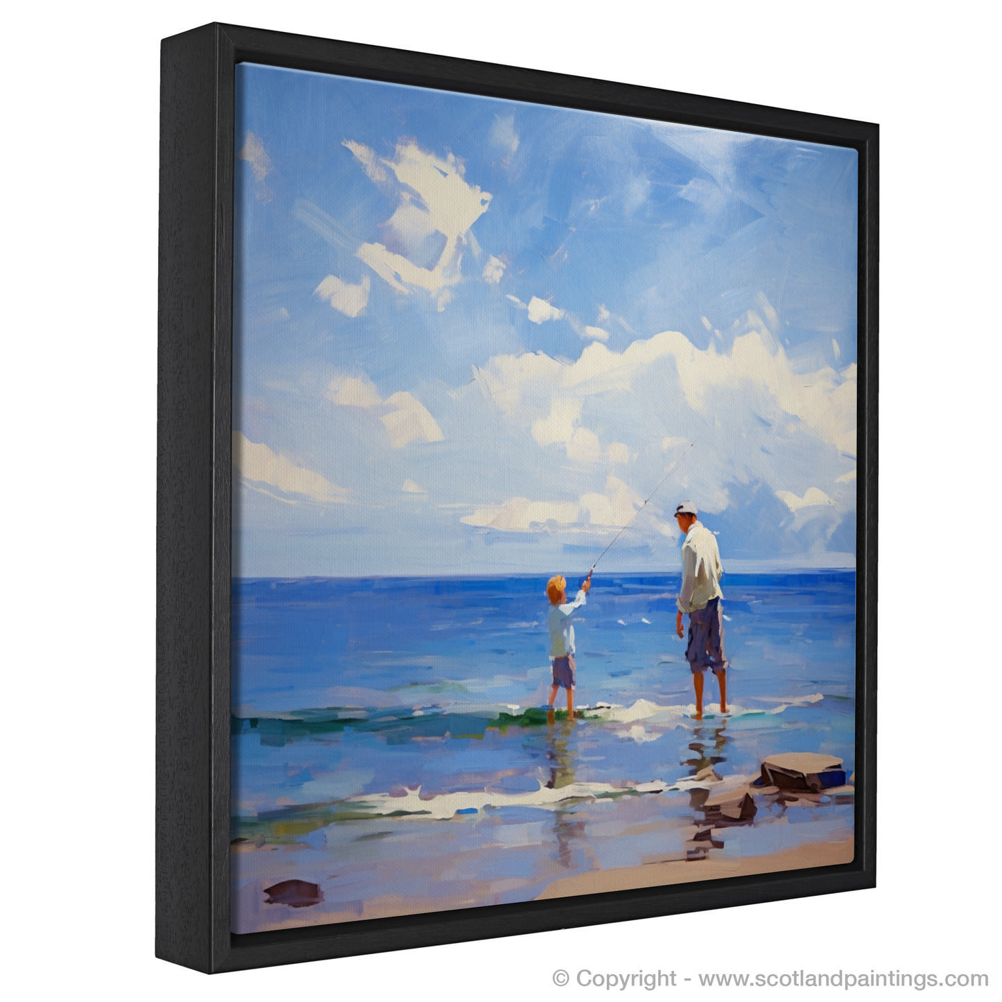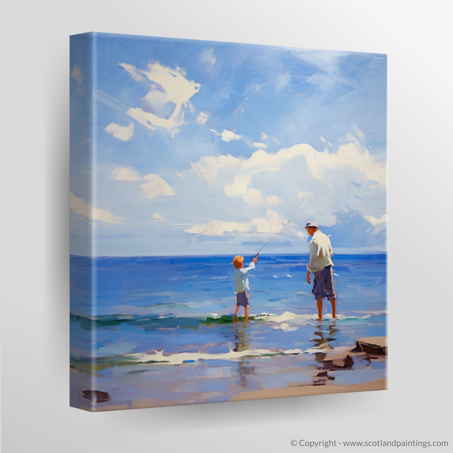 Painting and Art Print of A dad and son fishing at Rosemarkie Beach entitled "Fishing Together at Rosemarkie Beach - An Impressionist Reflection of Father-Son Bonding".