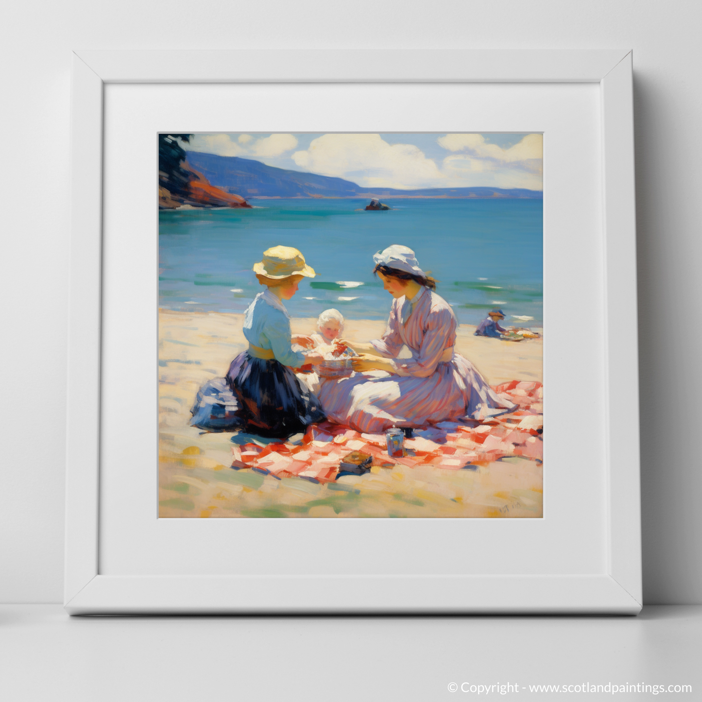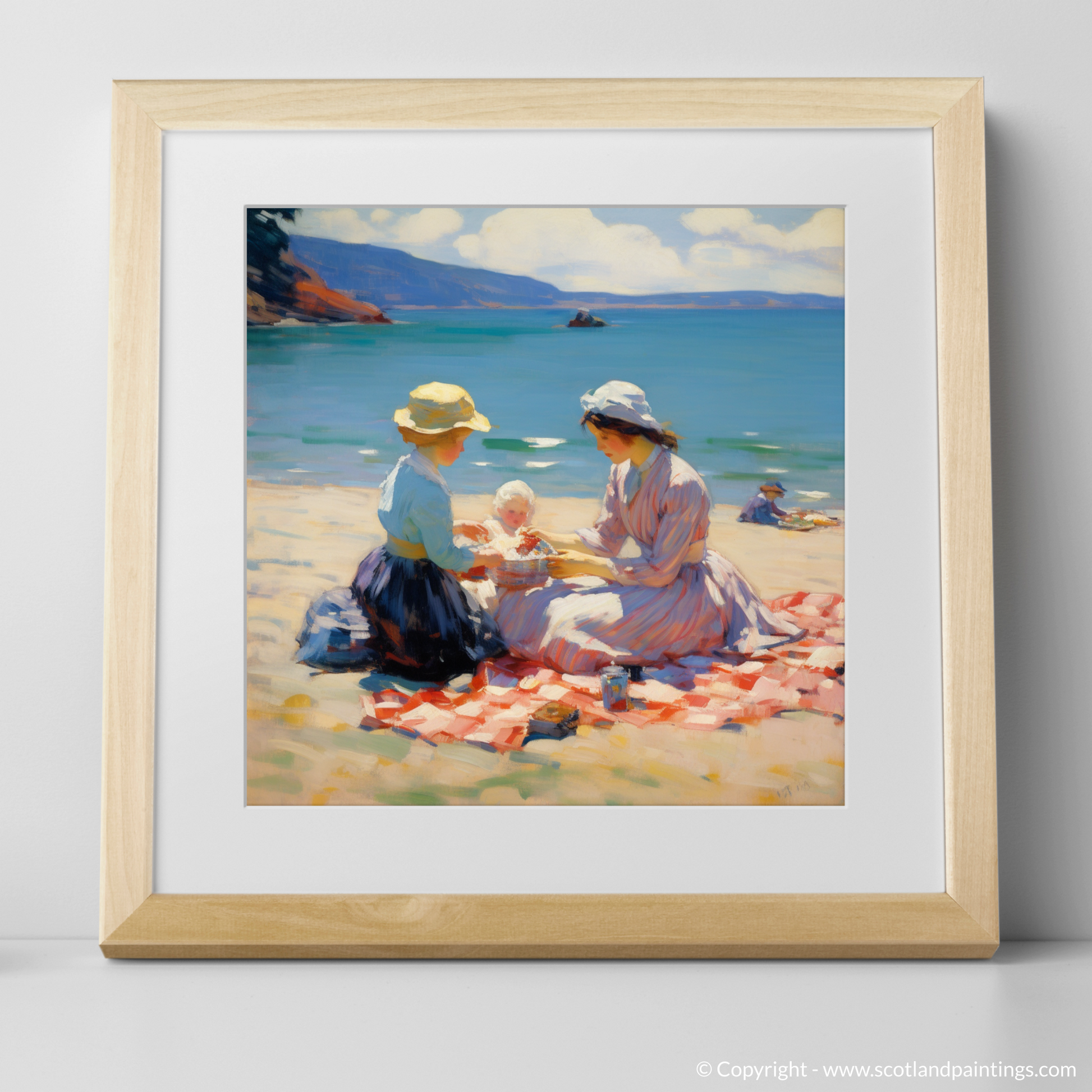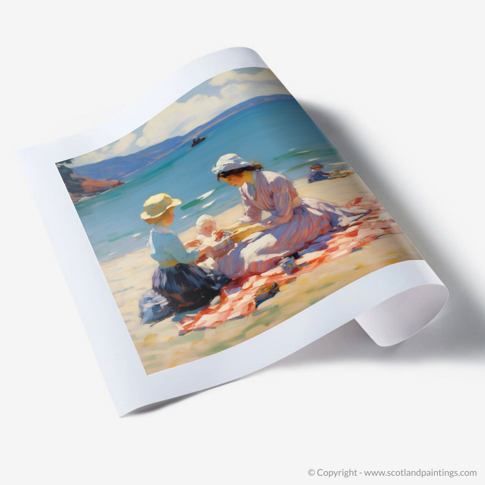 This enchanting print captures the heartwarming essence of a mother and daughter enjoying a tranquil picnic on the sun-soaked sands of Oban Beach. With a gentle Impressionist style, the piece beautifully renders the shimmering sea and the soft curve of the distant hills, framing the tender moment shared between family.