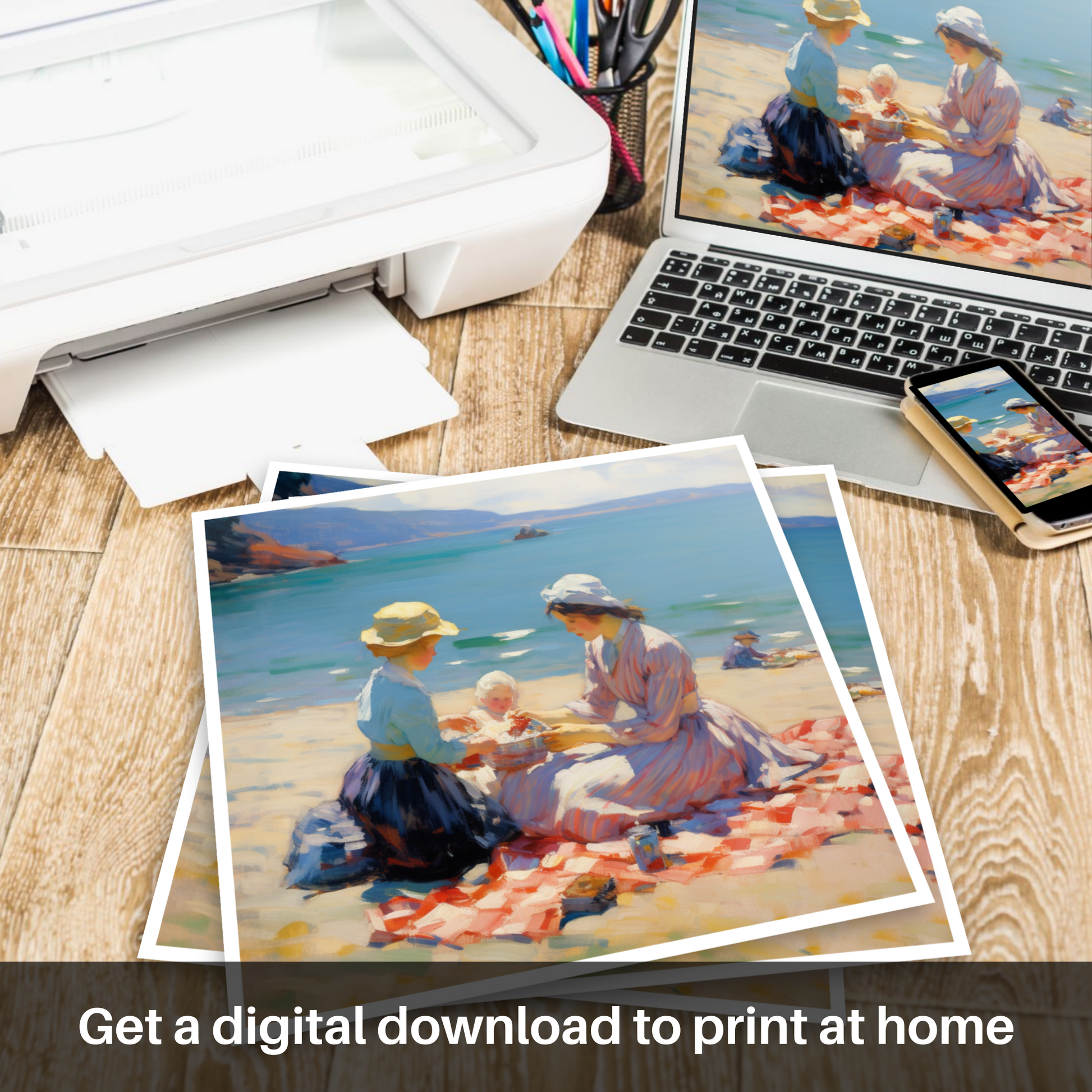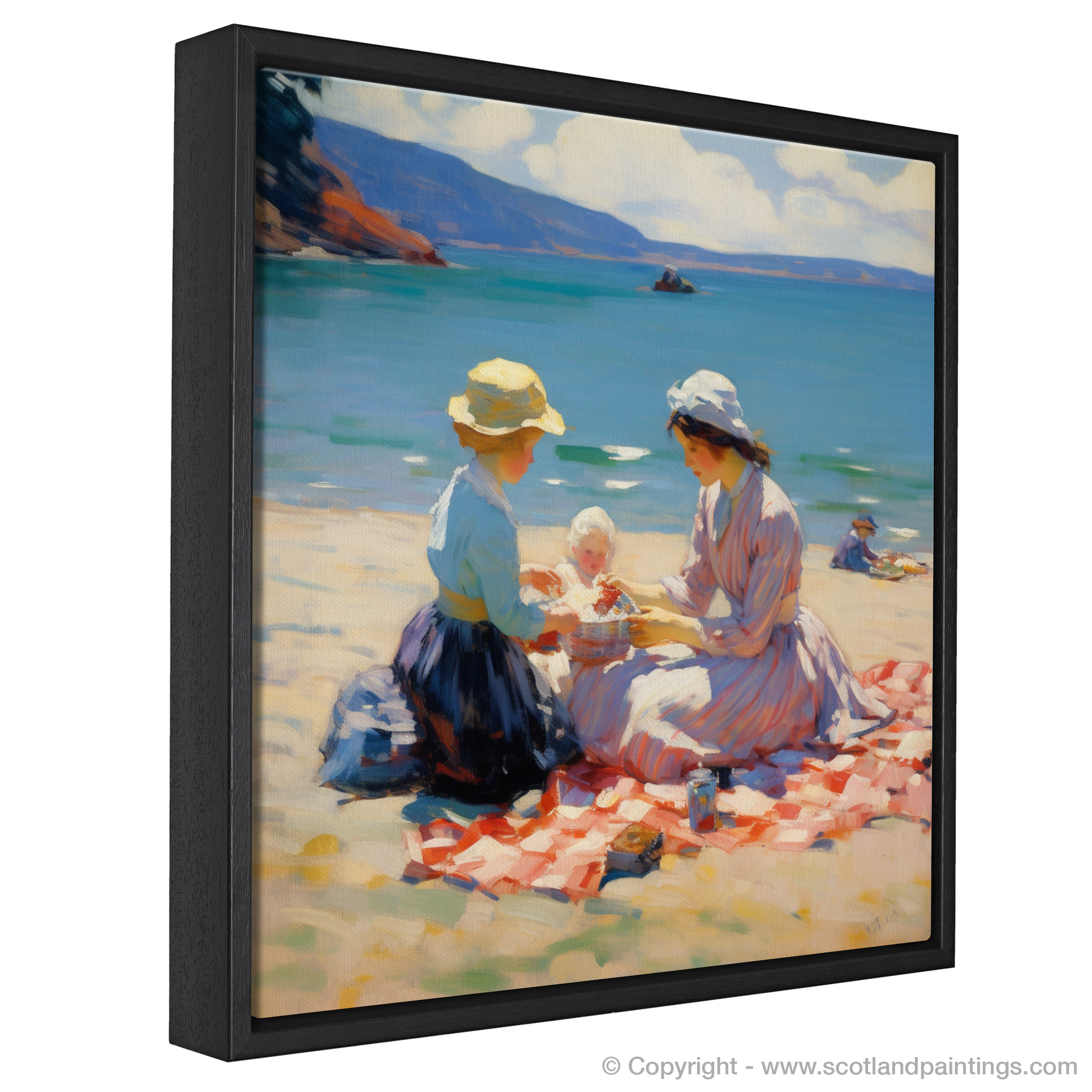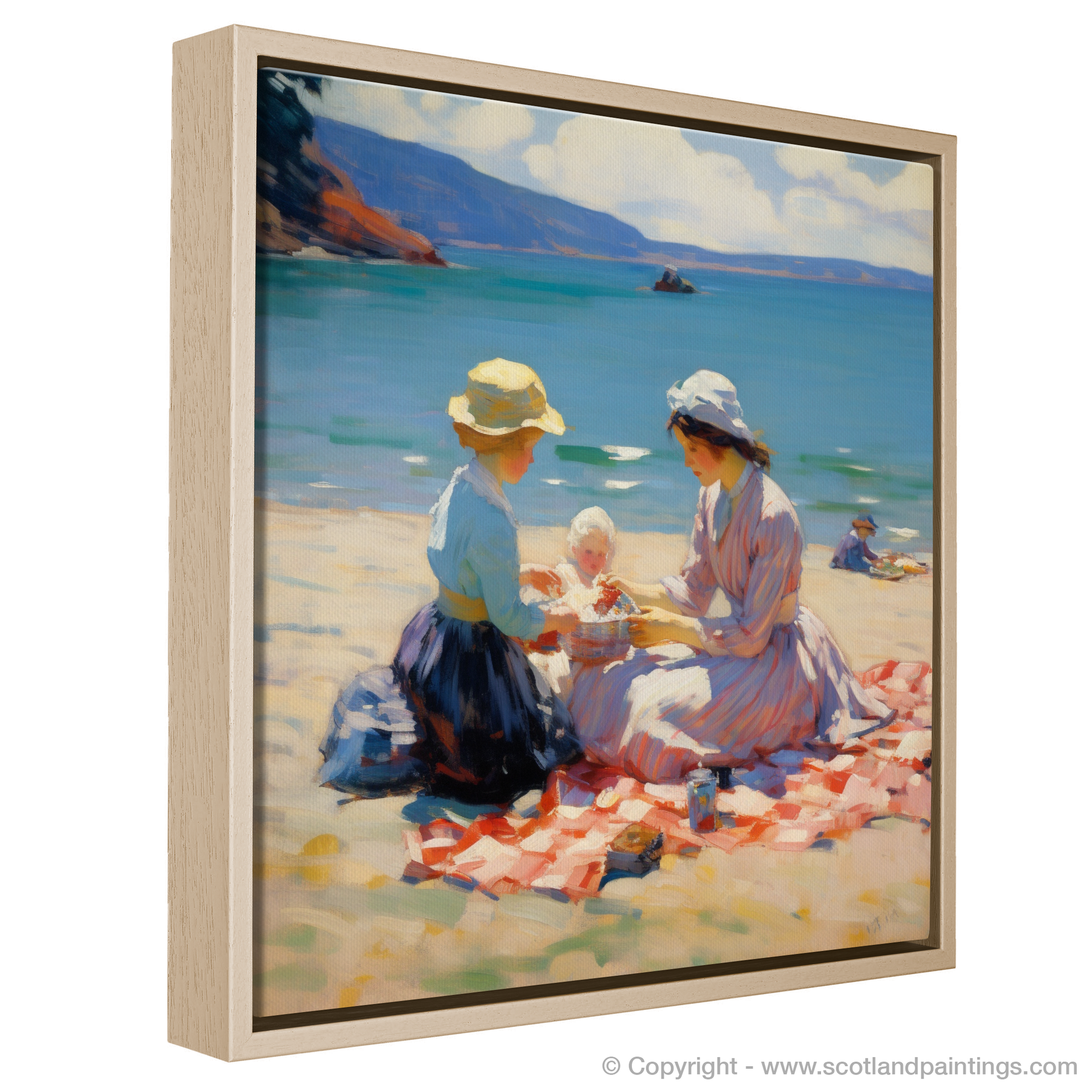 This enchanting print captures the heartwarming essence of a mother and daughter enjoying a tranquil picnic on the sun-soaked sands of Oban Beach. With a gentle Impressionist style, the piece beautifully renders the shimmering sea and the soft curve of the distant hills, framing the tender moment shared between family.