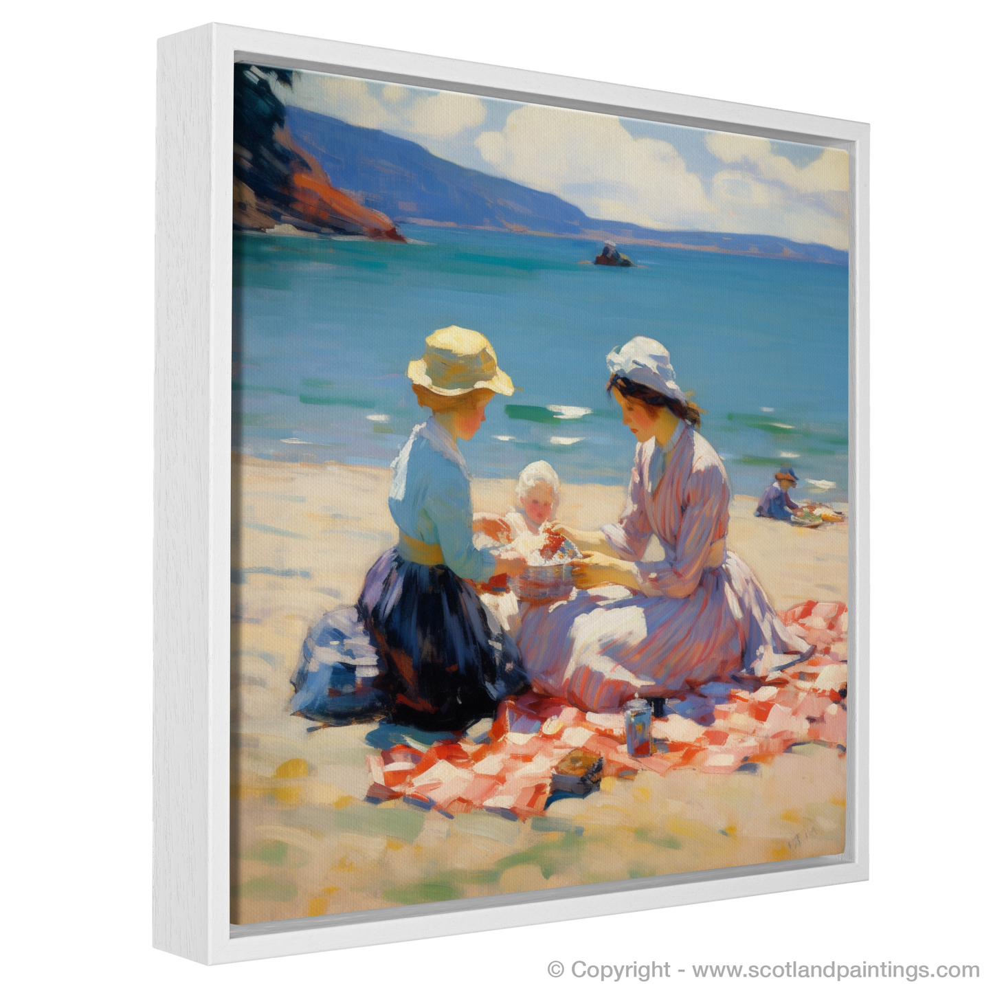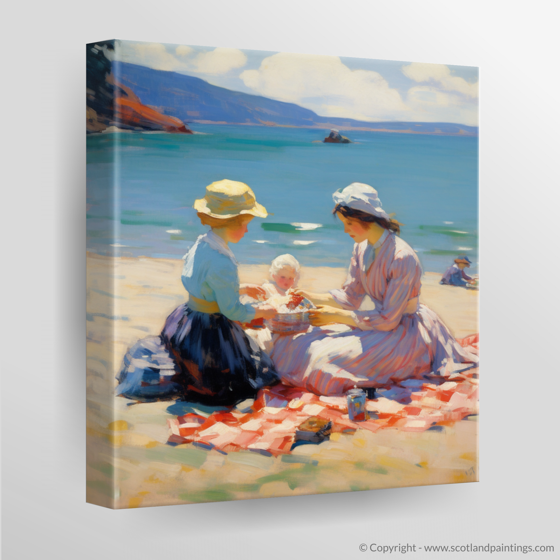 Painting and Art Print of A mum and daughter having a picnic at Oban Beach entitled "Seaside Elegance: A Mother and Daughter's Picnic at Oban Beach".