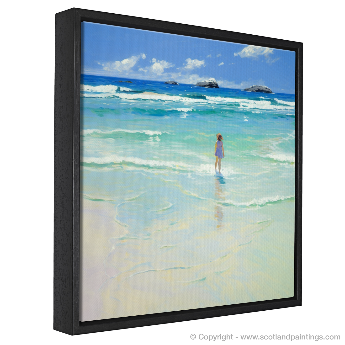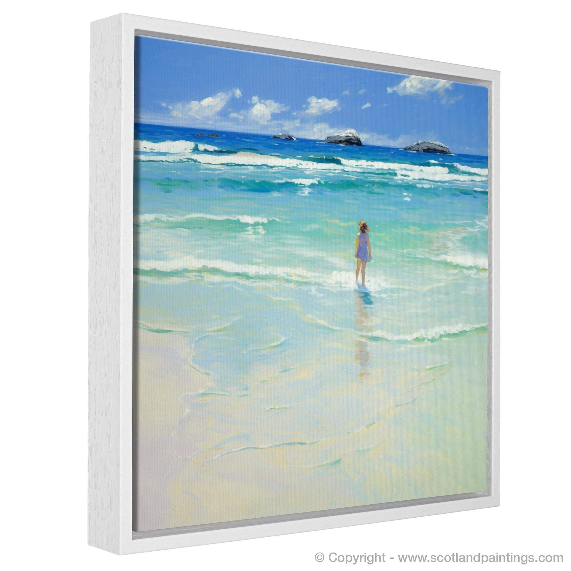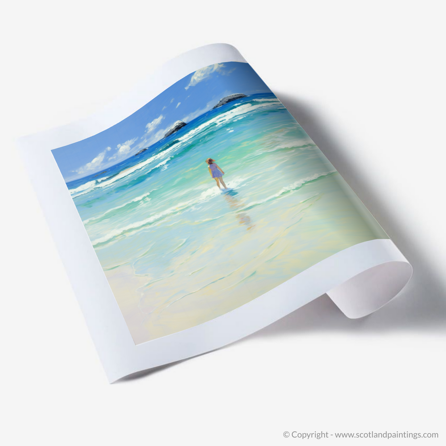 Captured in sweeping brushstrokes and vibrant hues, this enchanting print depicts a solitary girl wading into the gentle embrace of the azure sea, with the pristine sands of Tiree Beach beneath her feet. Cherishing a moment of serenity, the girl is poised between the sun-kissed shoreline and the rhythmic dance of the waves, evoking a sense of peaceful introspection and joy.