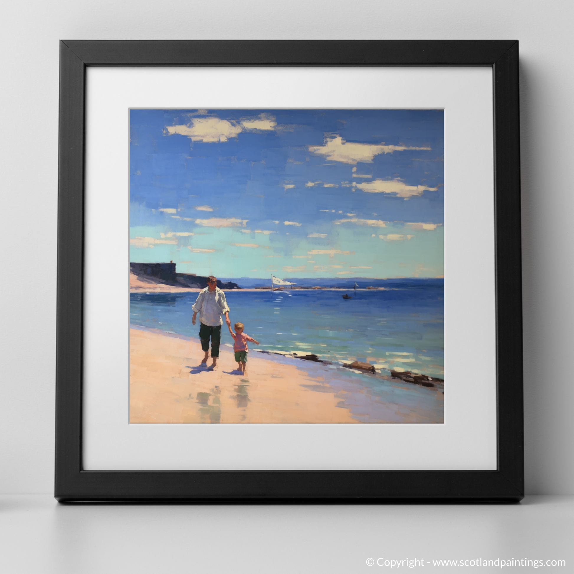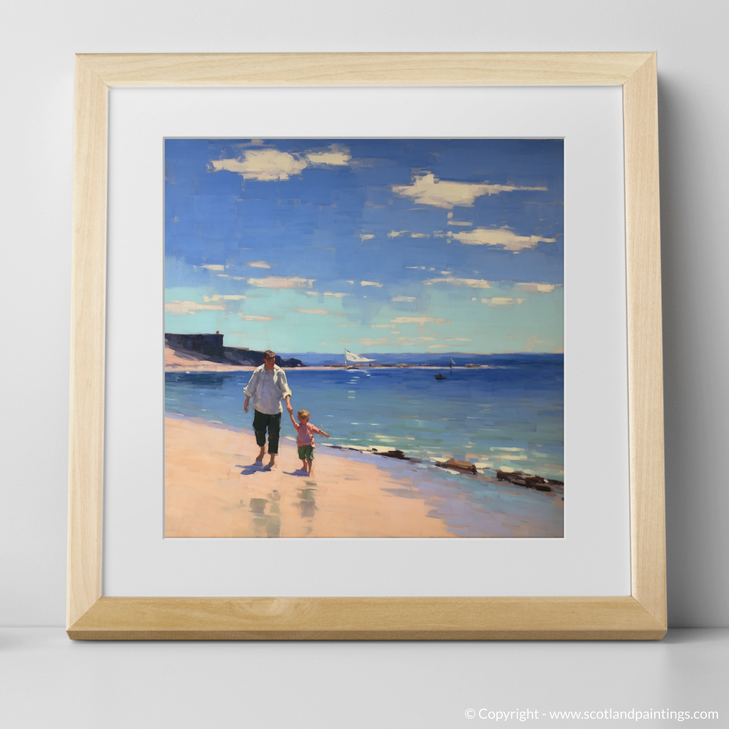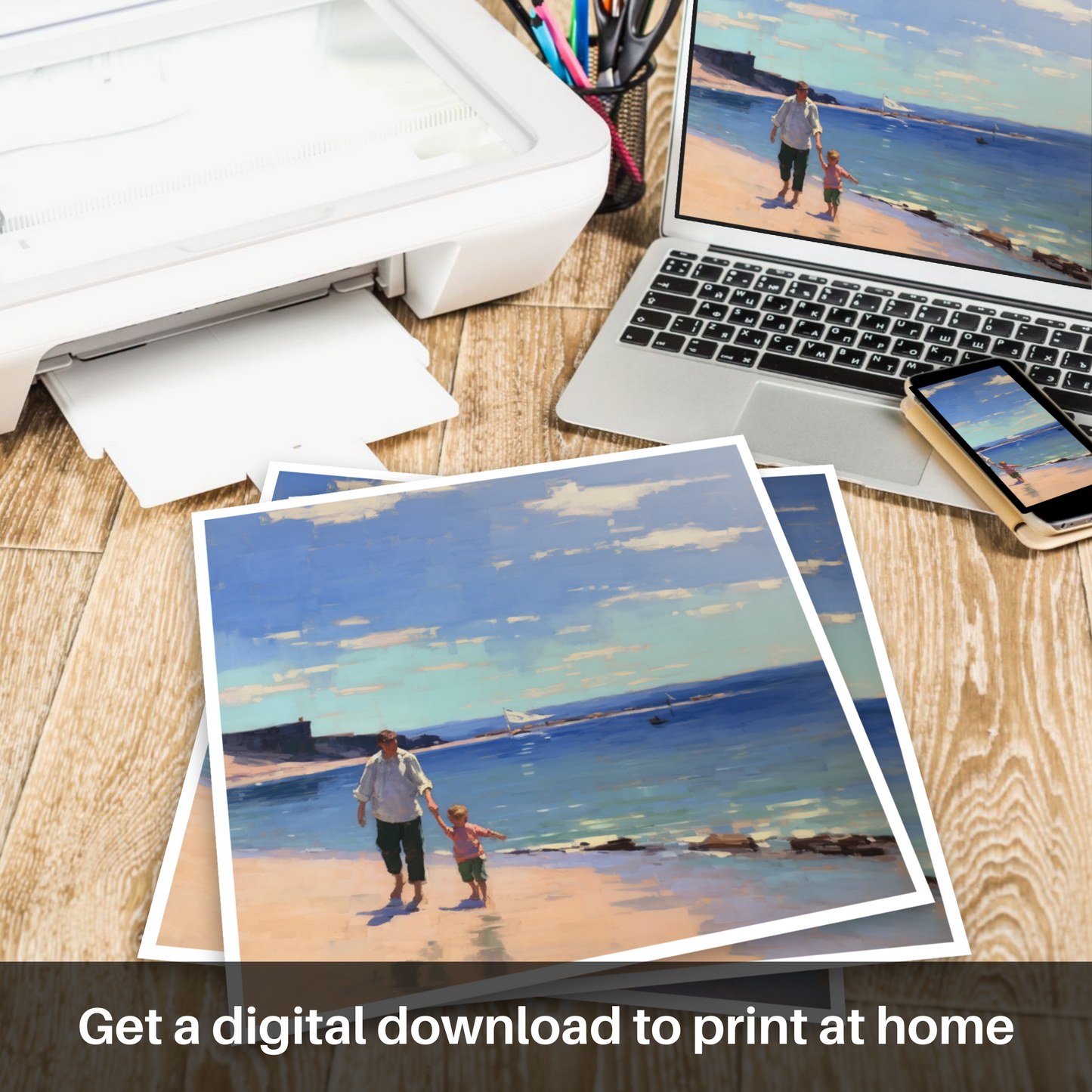 The artist has masterfully employed the Impressionist style, allowing brushstrokes to blend and colours to merge, creating a scene that is as much about the emotion and atmosphere of the moment as it is about the visual details. With each glance, one feels the warmth of the sun, the softness of the sea breeze, and the affectionate bond that this father and son share during their leisurely walk along the shore. This print is a perfect celebration of familial love and the simple pleasures of life, making it a treasured addition to any collection centred around the theme of family.