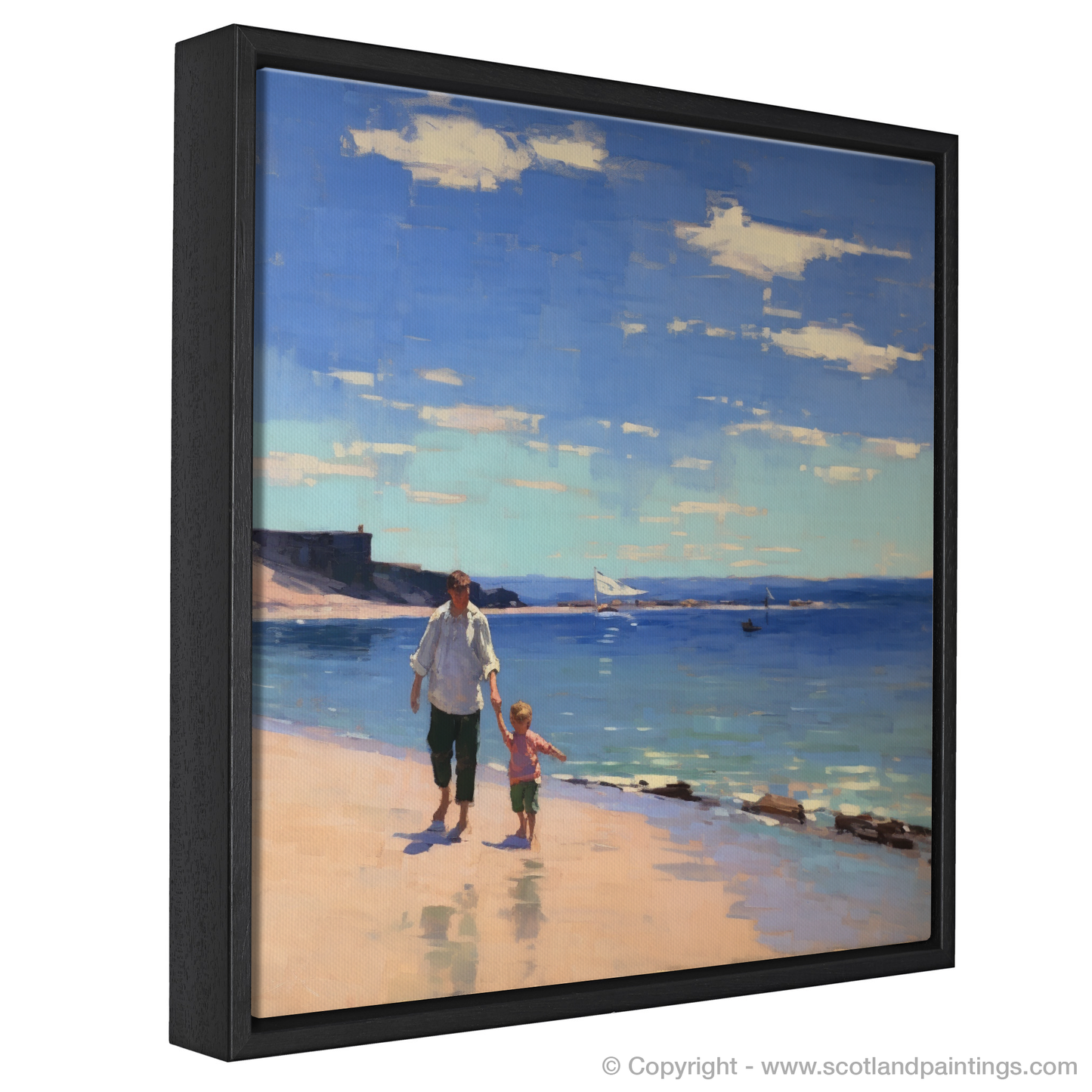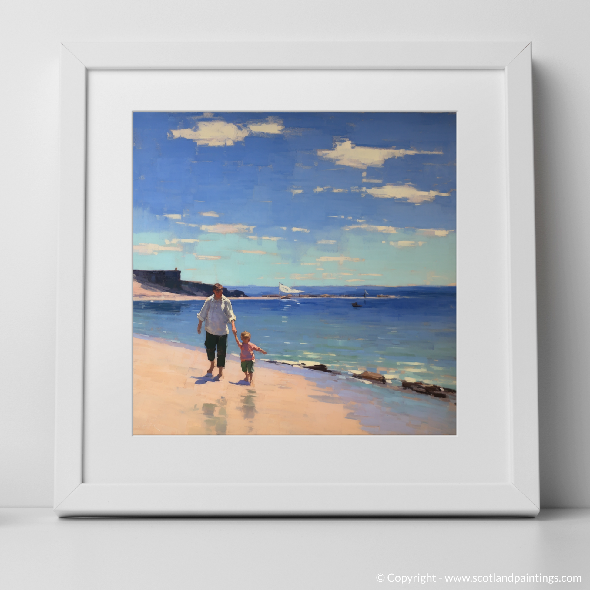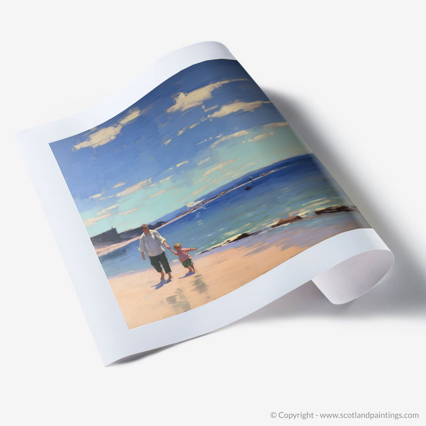 The artist has masterfully employed the Impressionist style, allowing brushstrokes to blend and colours to merge, creating a scene that is as much about the emotion and atmosphere of the moment as it is about the visual details. With each glance, one feels the warmth of the sun, the softness of the sea breeze, and the affectionate bond that this father and son share during their leisurely walk along the shore. This print is a perfect celebration of familial love and the simple pleasures of life, making it a treasured addition to any collection centred around the theme of family.