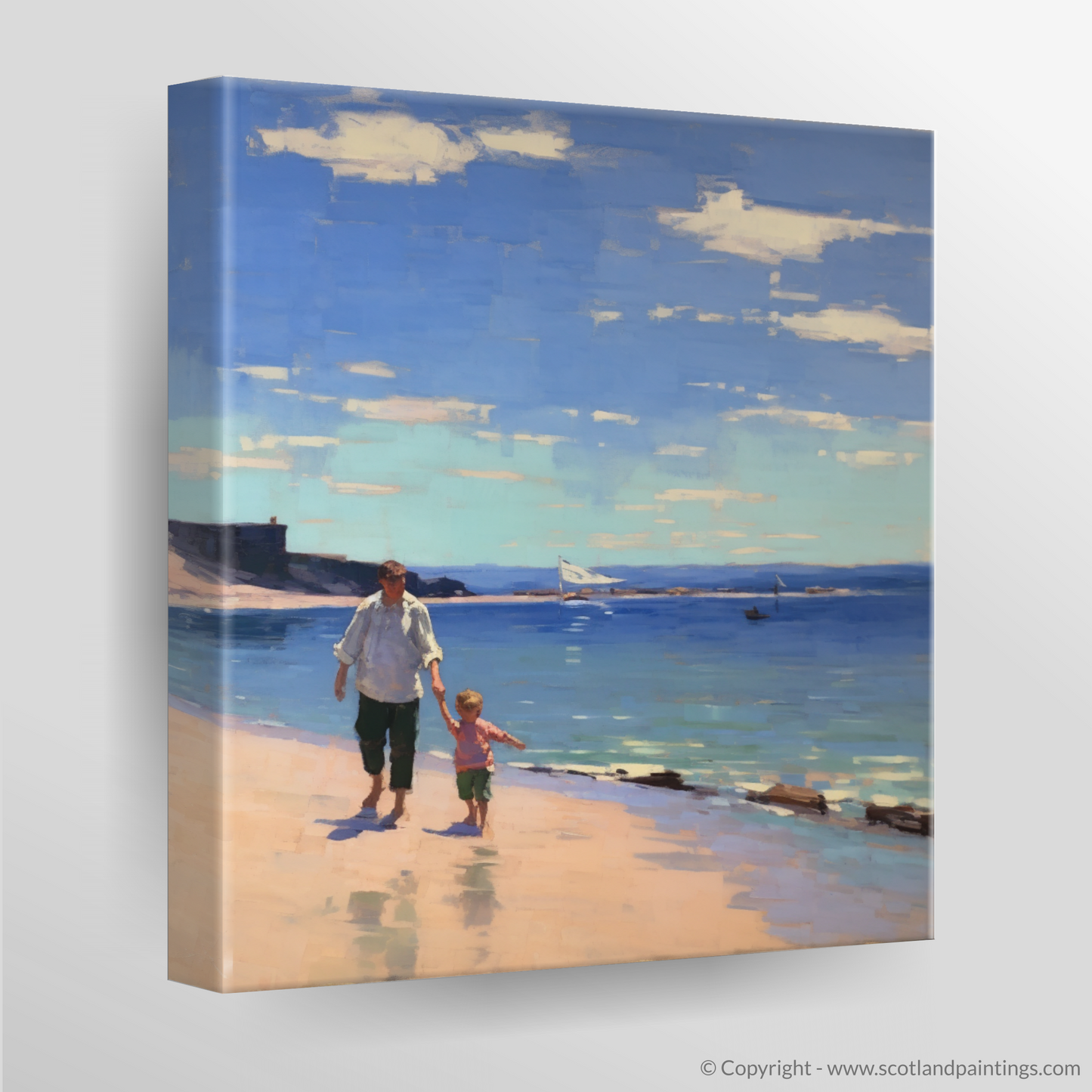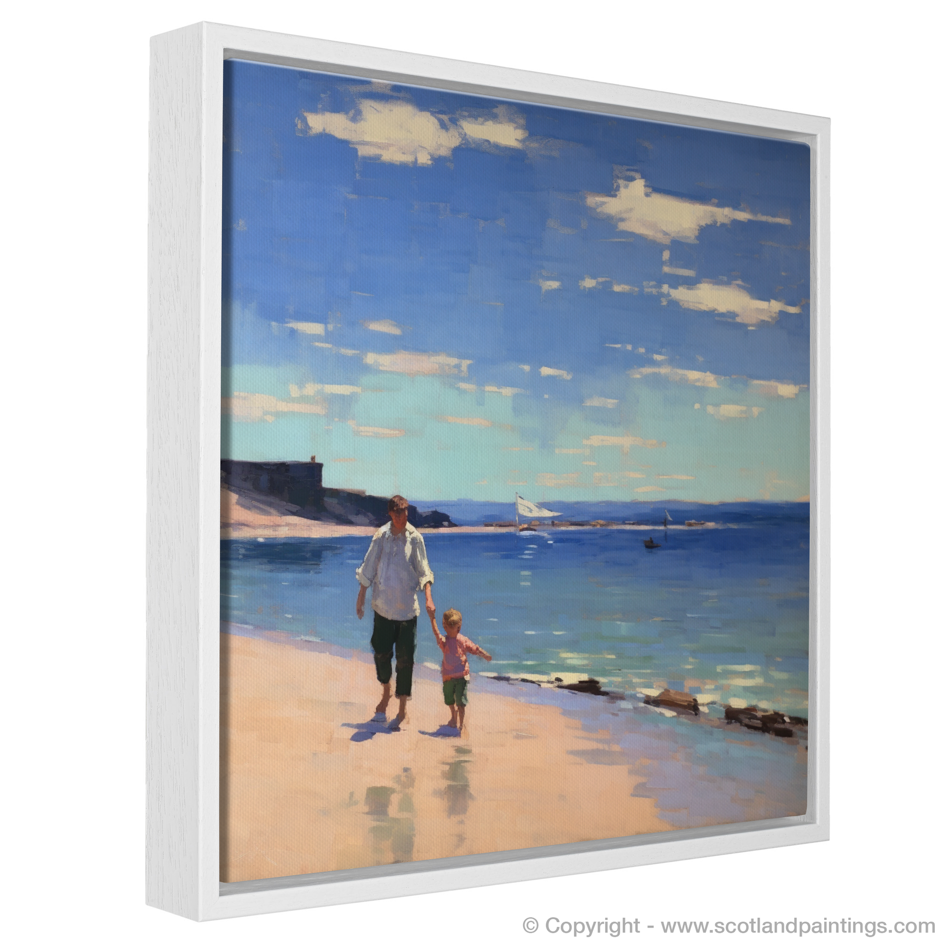 This captivating piece evokes the tender connection between father and child, set against the serene backdrop of Coldingham Bay. Bathed in the soft, golden hues of a coastal sunset, the clear blue sky is delicately brushed with wisps of white cloud, reflecting tranquillity and vast open space.