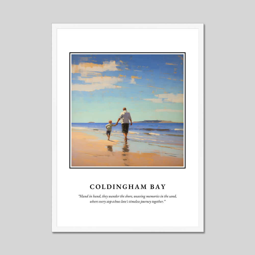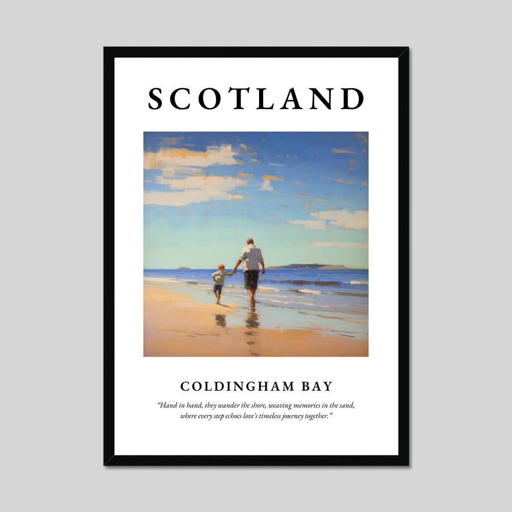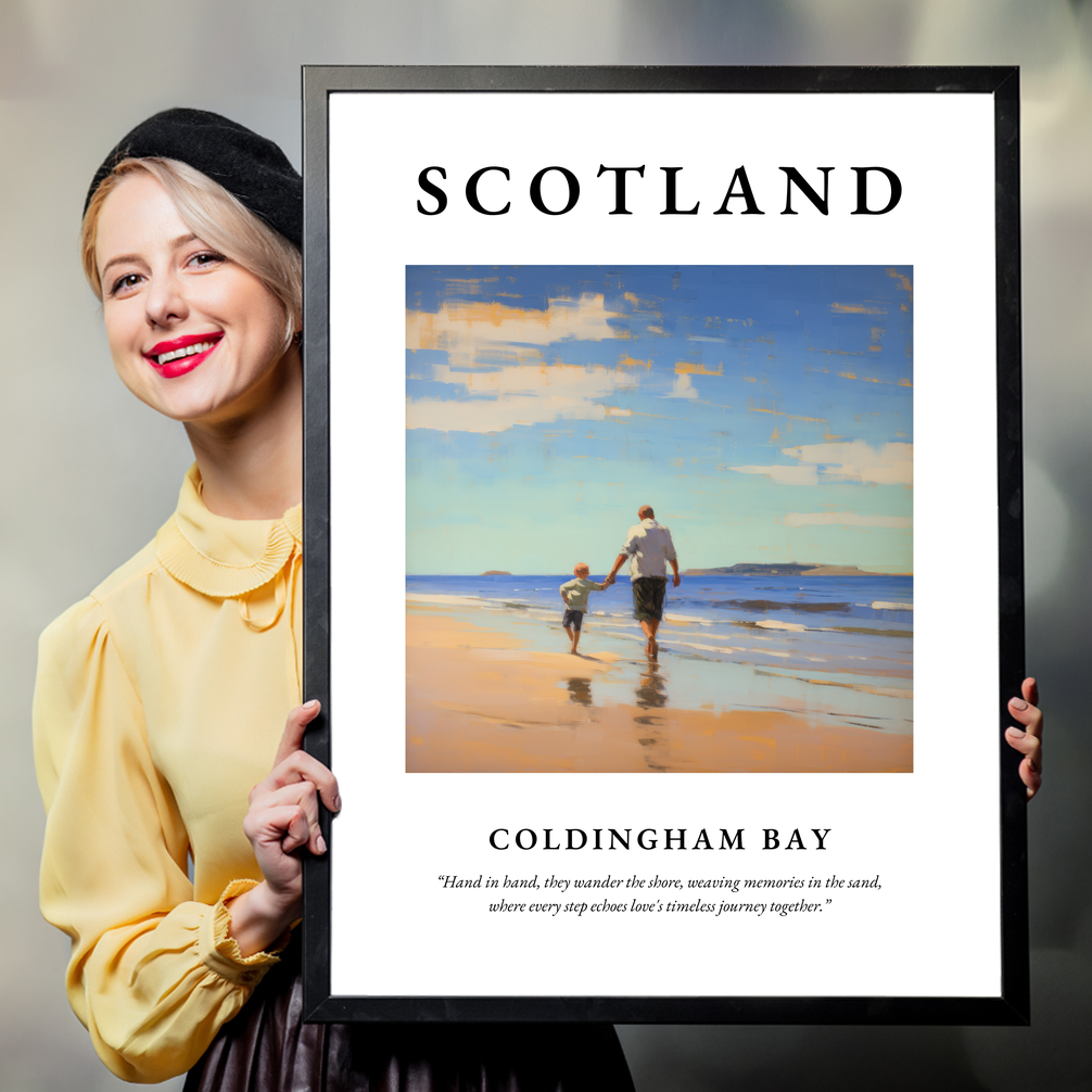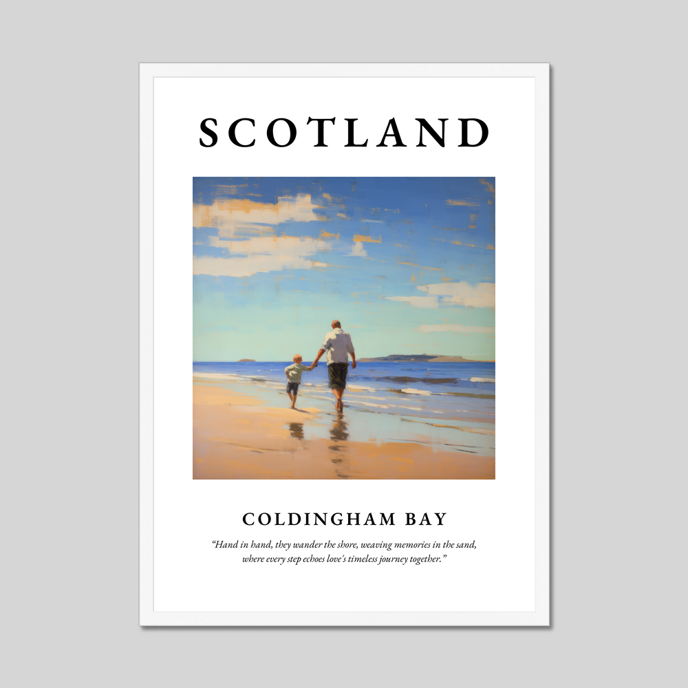 The top of the poster proudly displays the word “SCOTLAND” in bold, emblazoned lettering, setting the stage for the artwork below. The impressionist painting of Coldingham Bay captures the essence of this beloved Scottish coast with vivid beauty and gentle brushstrokes. The scene depicts a leisurely stroll beside the rippling waves, a parent and child hand in hand, conjuring feelings of warmth, nostalgia, and togetherness. Beneath this heartwarming image lies a timeless quote: “Hand in hand, they wander the shore, weaving memories in the sand, where every step echoes love's timeless journey together.”