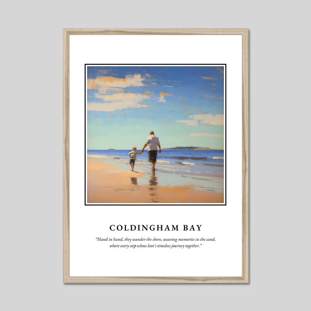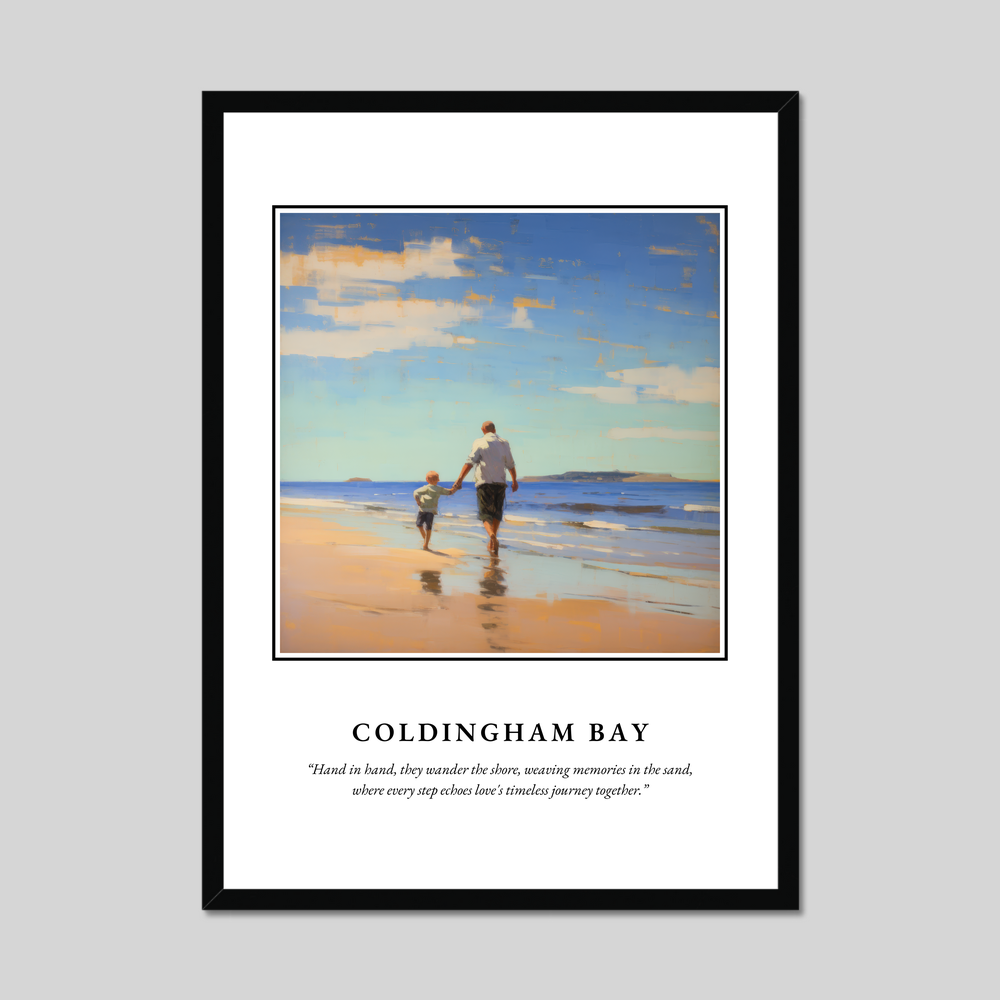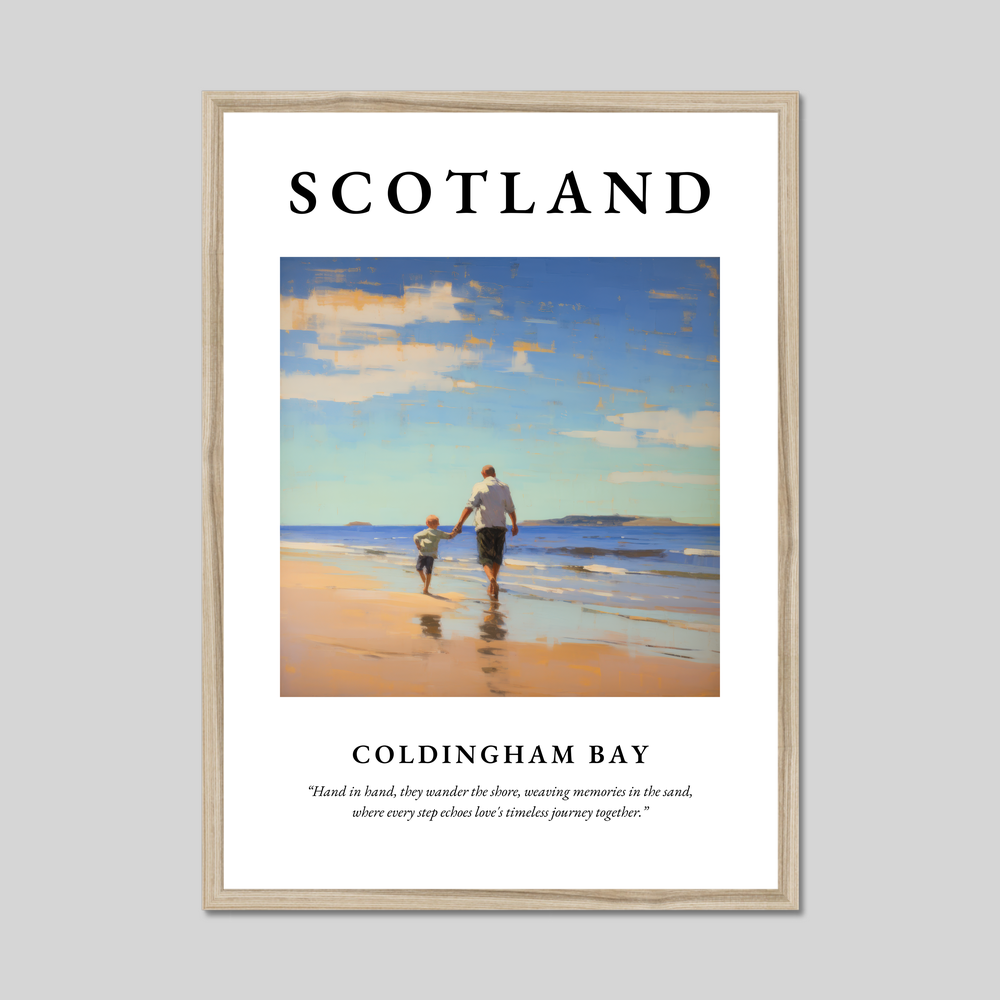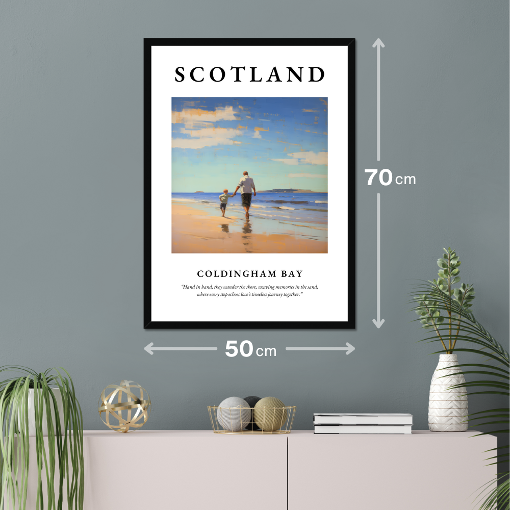 The top of the poster proudly displays the word “SCOTLAND” in bold, emblazoned lettering, setting the stage for the artwork below. The impressionist painting of Coldingham Bay captures the essence of this beloved Scottish coast with vivid beauty and gentle brushstrokes. The scene depicts a leisurely stroll beside the rippling waves, a parent and child hand in hand, conjuring feelings of warmth, nostalgia, and togetherness. Beneath this heartwarming image lies a timeless quote: “Hand in hand, they wander the shore, weaving memories in the sand, where every step echoes love's timeless journey together.”