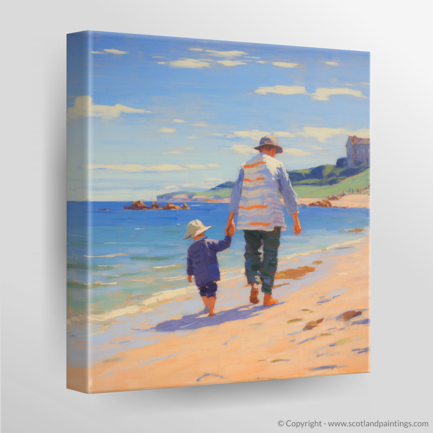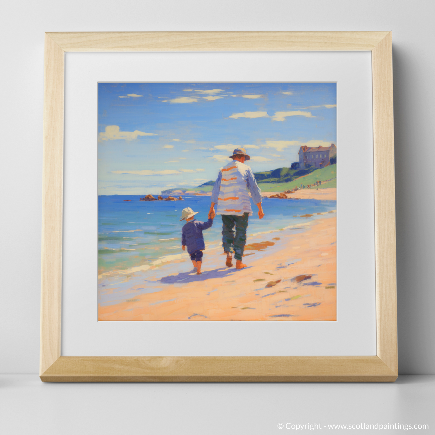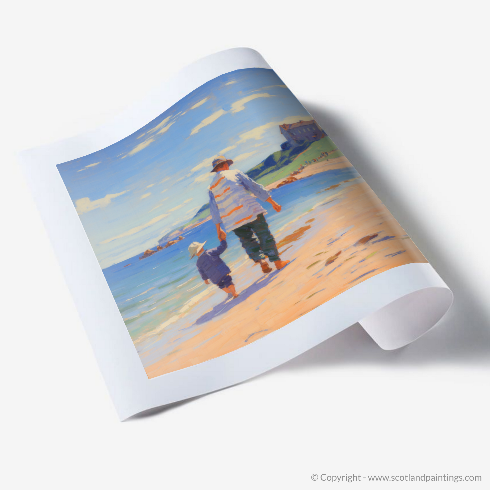 This charming print captures an endearing moment of a father and son taking a leisurely stroll along the sandy shores of Coldingham Bay, their connection tangible through the simple act of holding hands. The piece exudes warmth and serenity, rendered in the soft, dappled brushwork characteristic of Impressionism. The azure waters gently lap the shore, harmonising with the cerulean sky scattered with wisps of white clouds.
