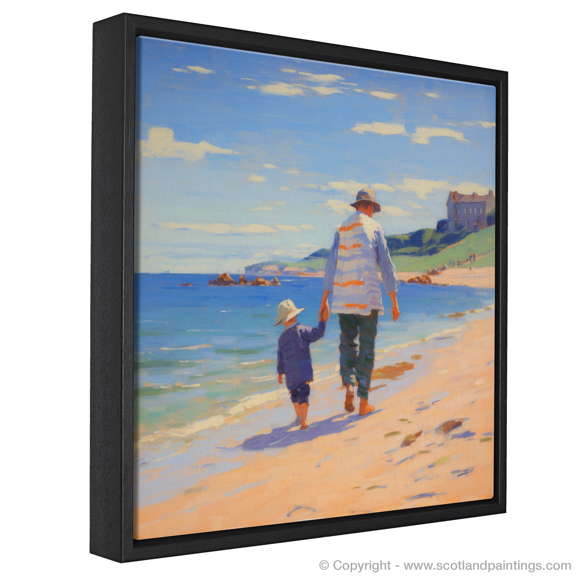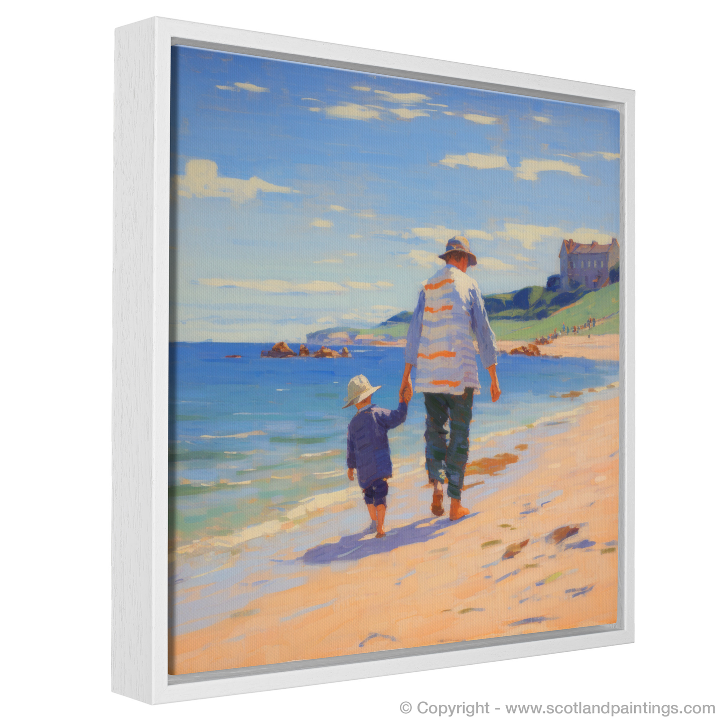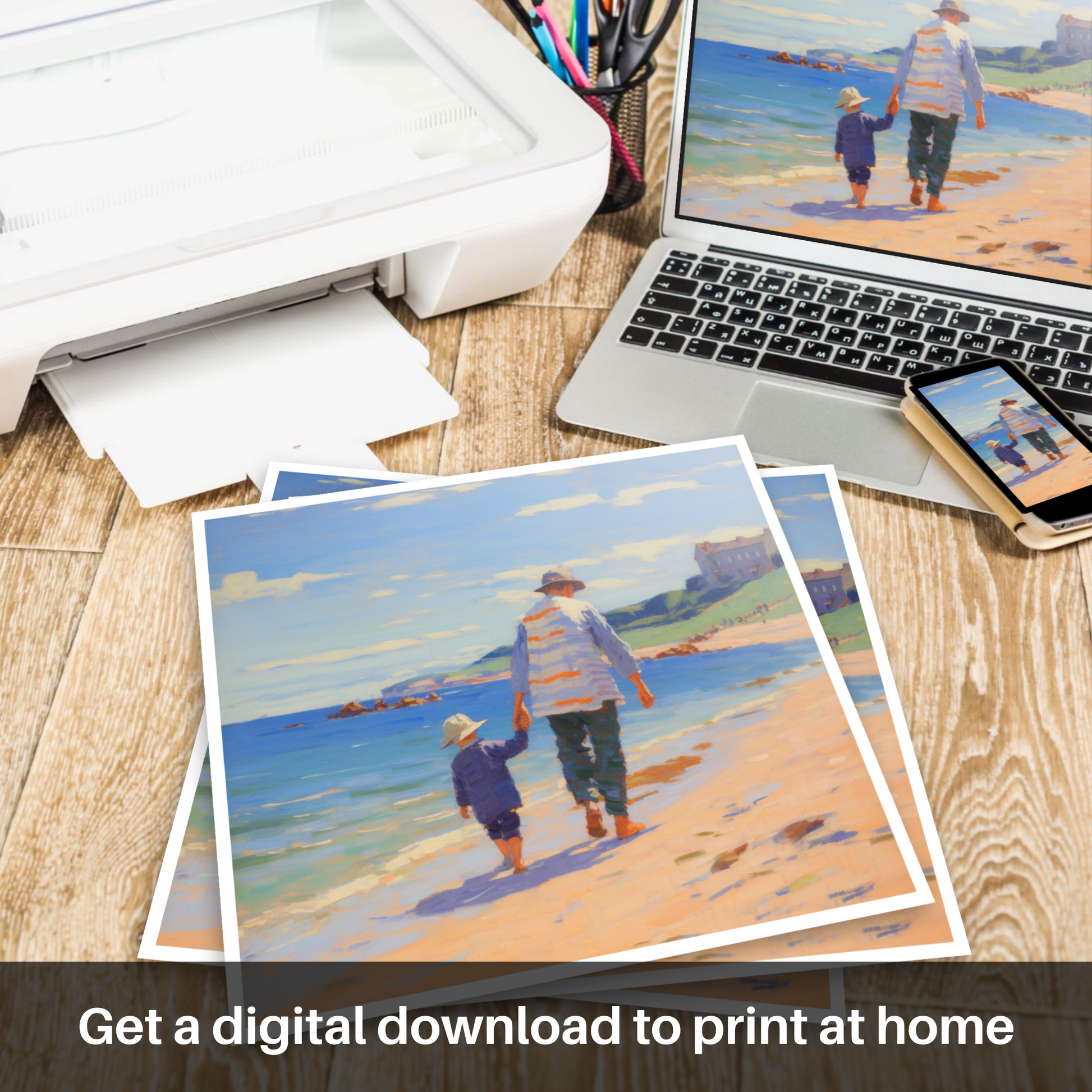 This charming print captures an endearing moment of a father and son taking a leisurely stroll along the sandy shores of Coldingham Bay, their connection tangible through the simple act of holding hands. The piece exudes warmth and serenity, rendered in the soft, dappled brushwork characteristic of Impressionism. The azure waters gently lap the shore, harmonising with the cerulean sky scattered with wisps of white clouds.