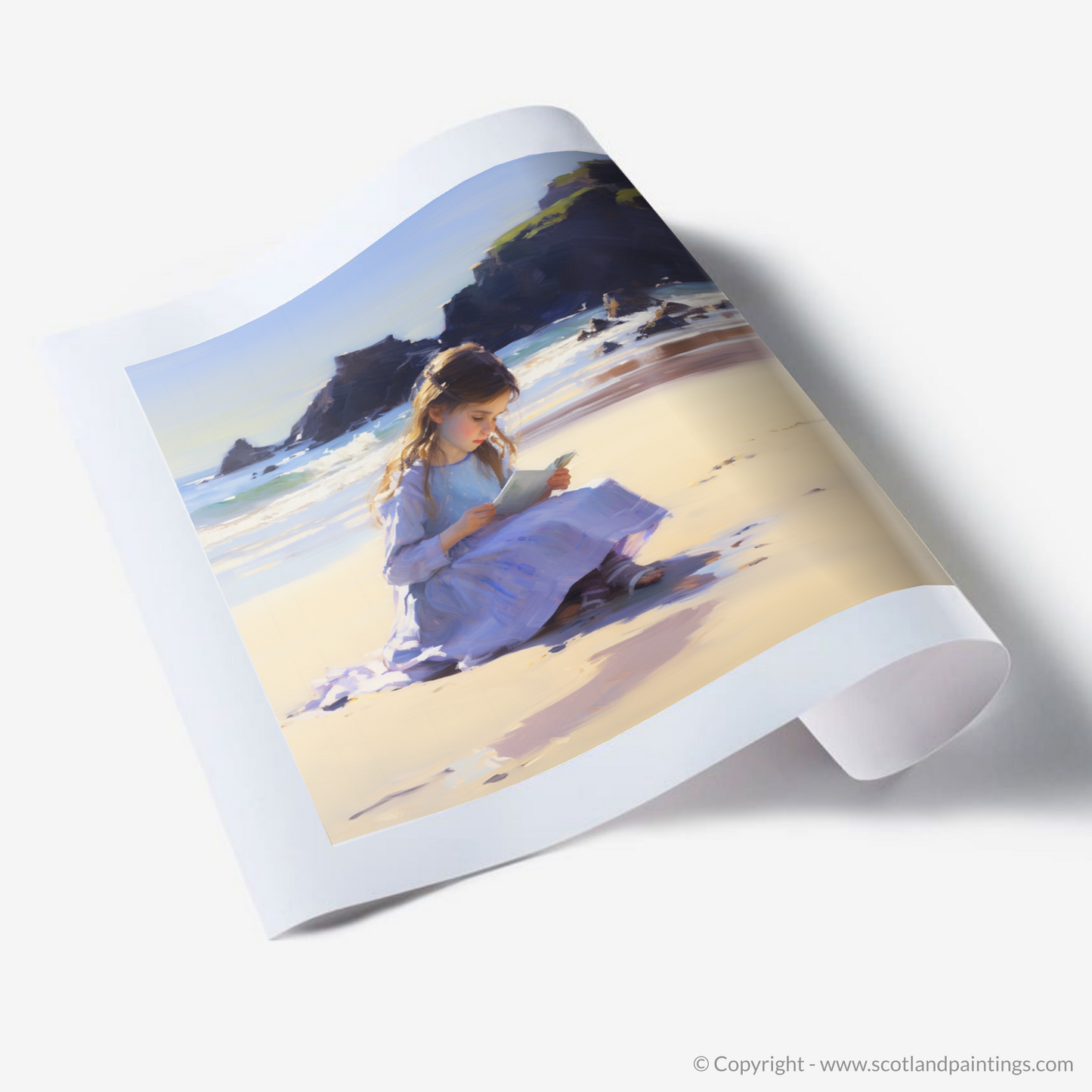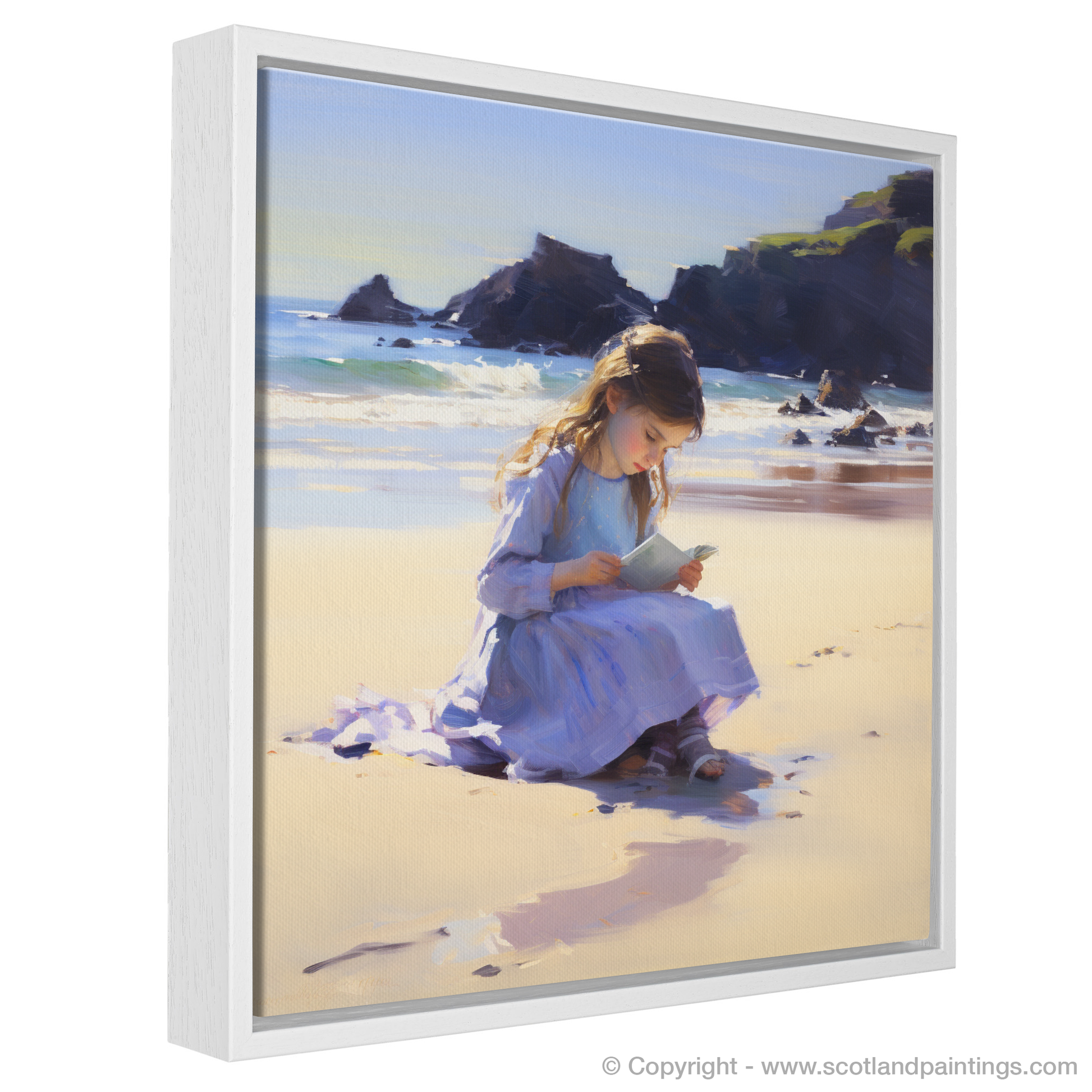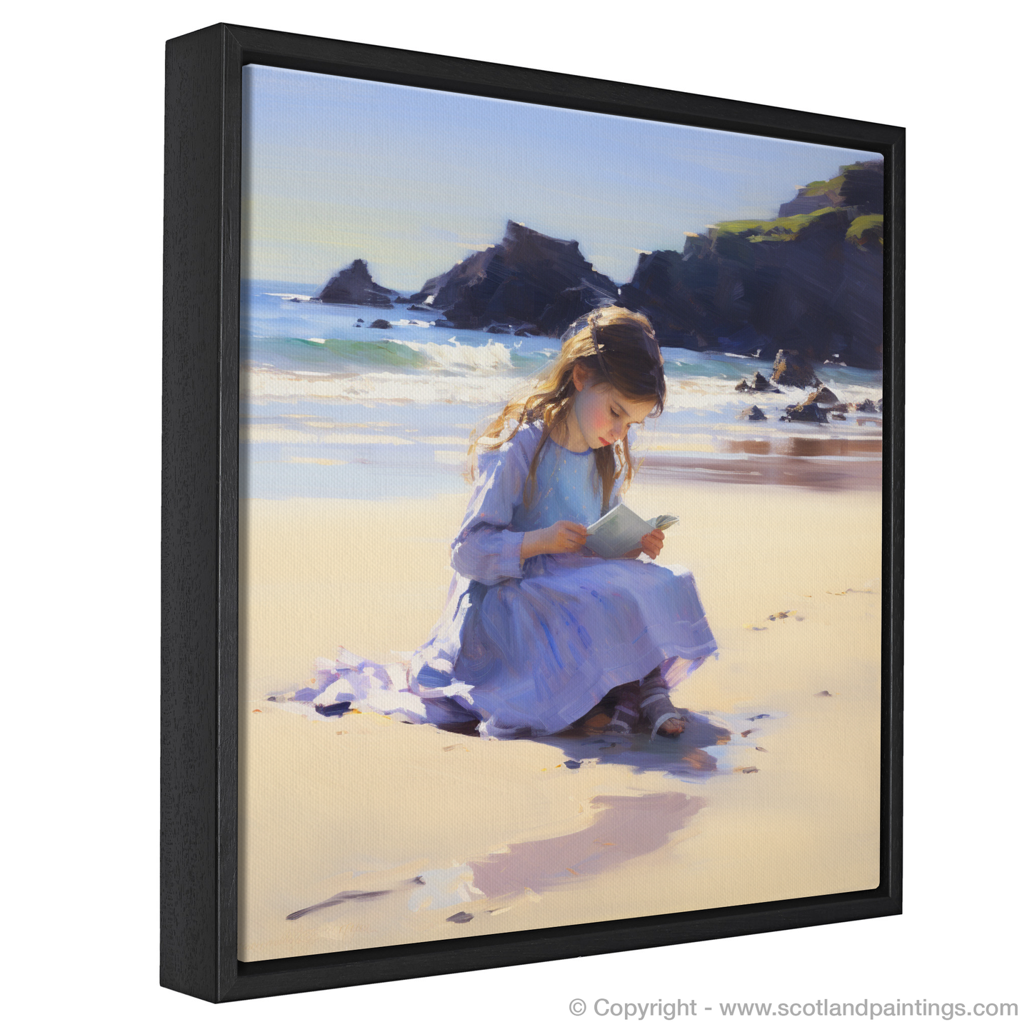 Captured in the warm embrace of sunlight, this evocative piece invites viewers to Eyemouth Beach, where a young girl in a delicate blue dress is etching her name into the soft, golden sand. Her concentration is palpable, as she is engrossed in the act of inscribing her identity, a symbol of the fleeting nature of moments and the enduring desire to leave a mark.