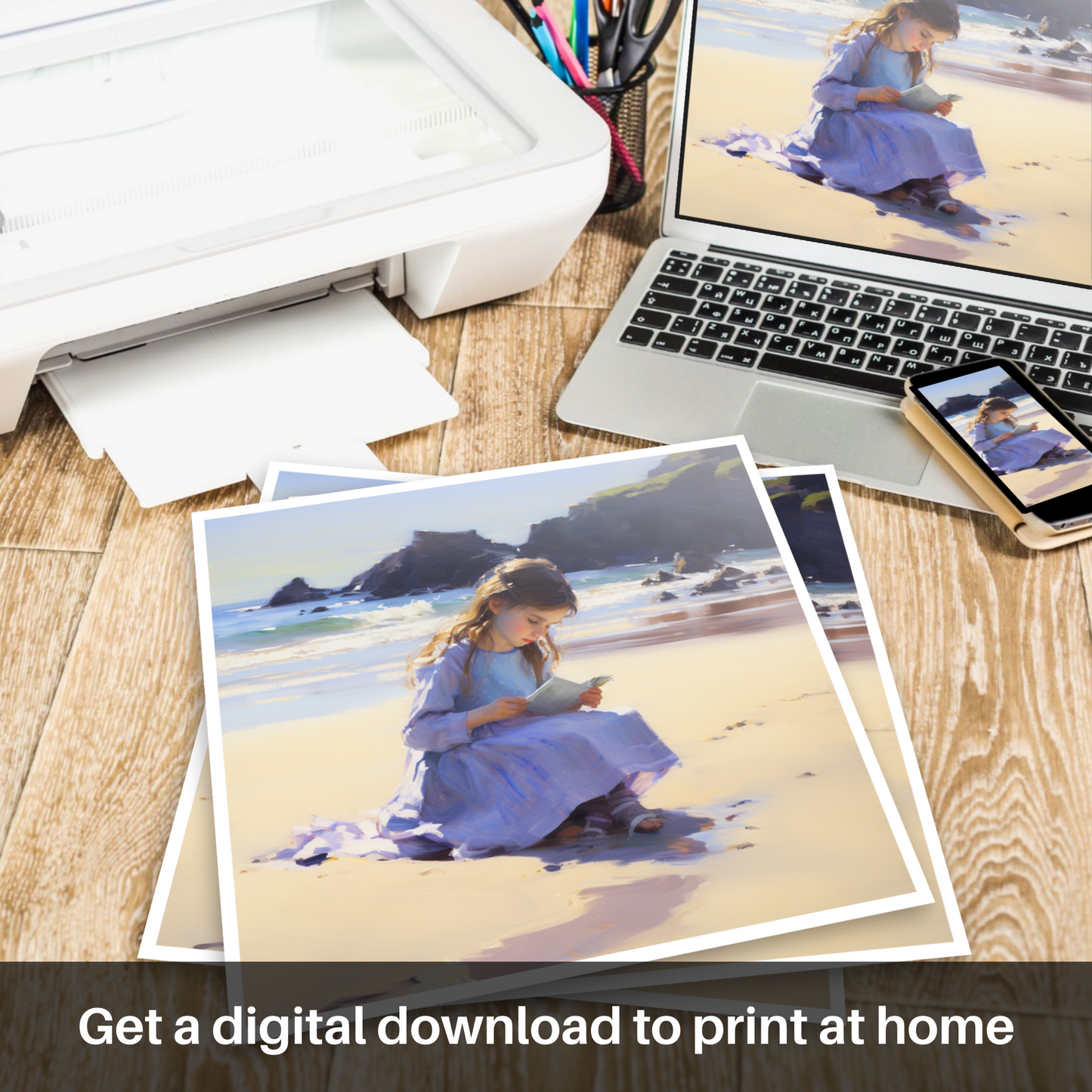 Painting and Art Print of A girl writing her name in the sand at Eyemouth Beach entitled "Ephemeral Impressions at Eyemouth Beach".