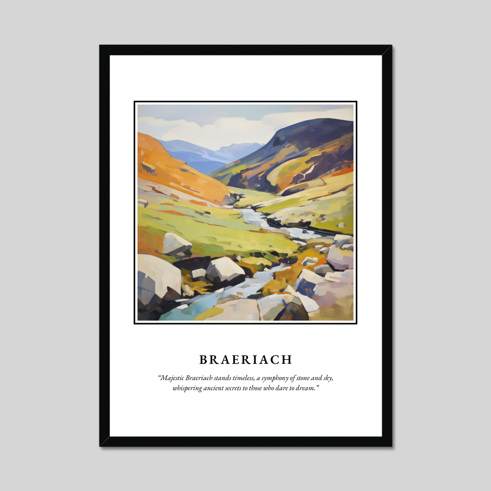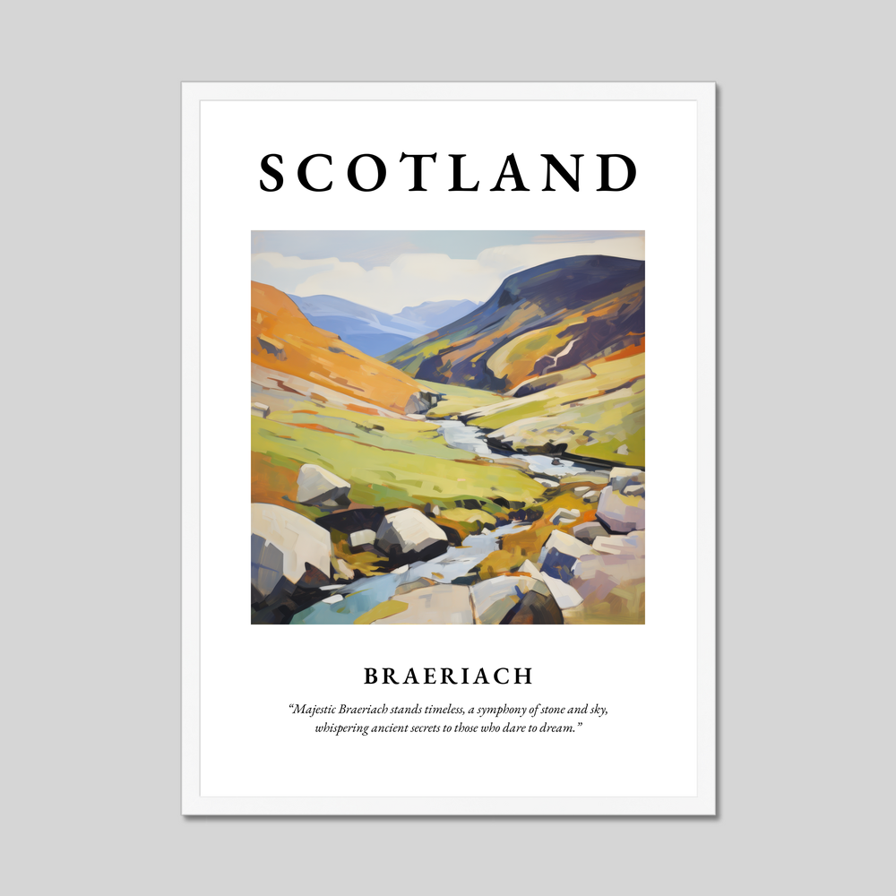 Braeriach, the third highest mountain in Britain, stands sentinel over the Cairngorms National Park. Known for its sweeping vistas and ever-changing weather patterns, Braeriach offers a sense of wonder with its expansive plateaus and deep corries. This poster beautifully reflects the enigmatic allure of this majestic peak, capturing the essence of its rugged terrain and the vibrant play of light and shadow across the slopes.