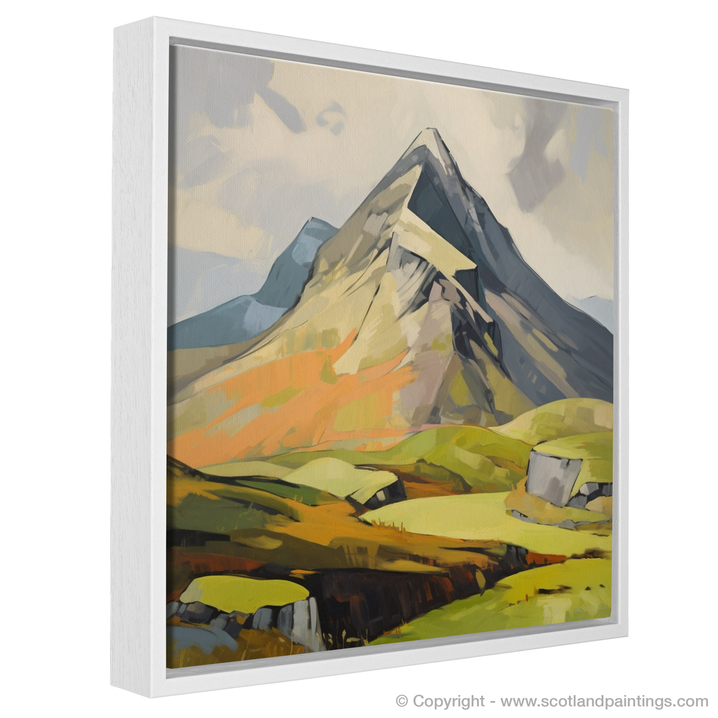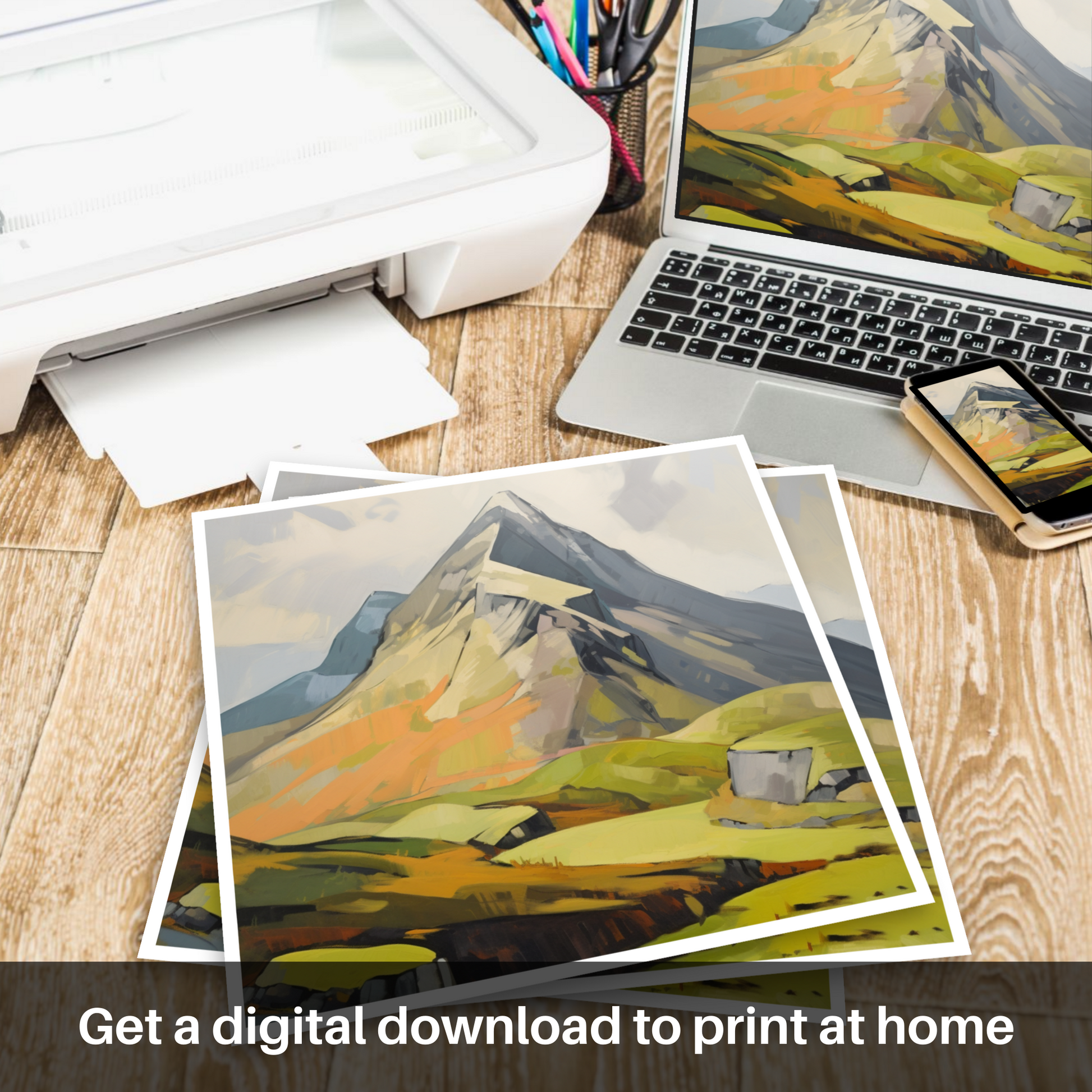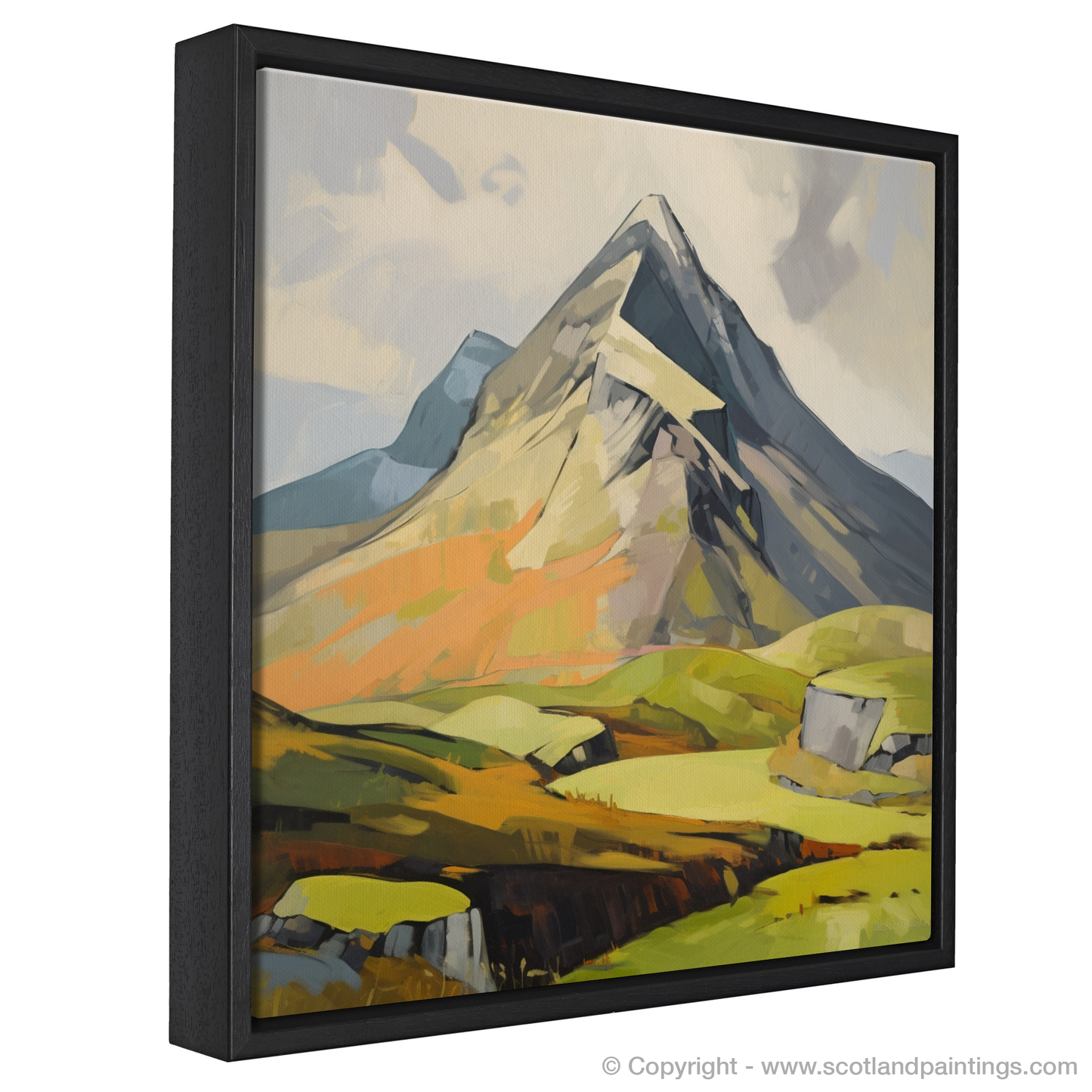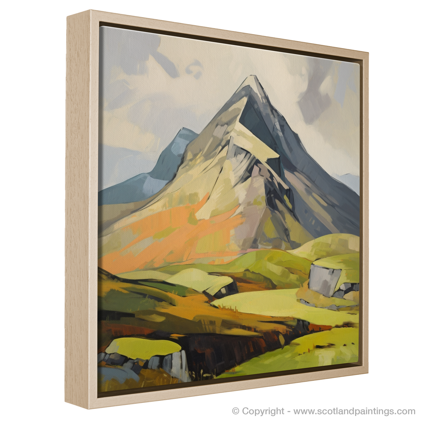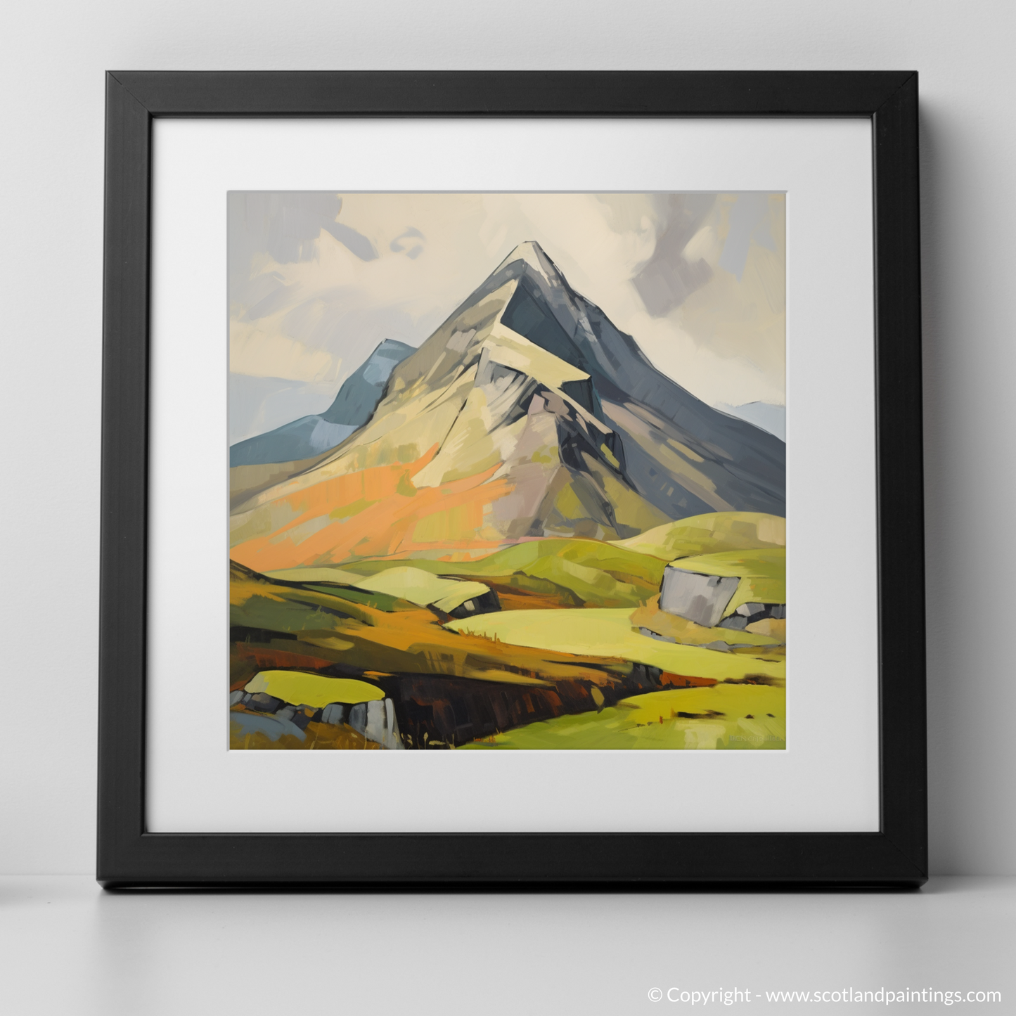 Bold geometric shapes and a fusion of earthy greens, muted greys, and vibrant oranges dance across the canvas, emulating the natural terrain's unique contours and textures. The angular forms of the mountain looms powerfully over the scene, its dark, shadowy planes set against a backdrop of a soft, diffuse sky, hinting at the ever-changing light conditions that characterise the highland atmosphere.