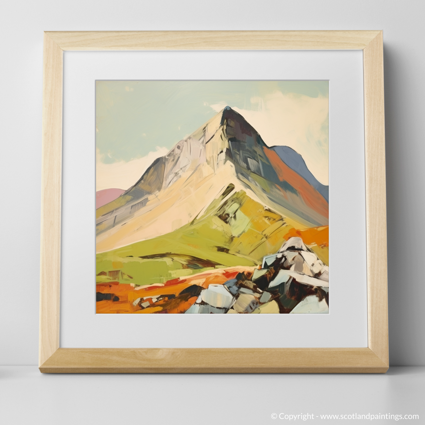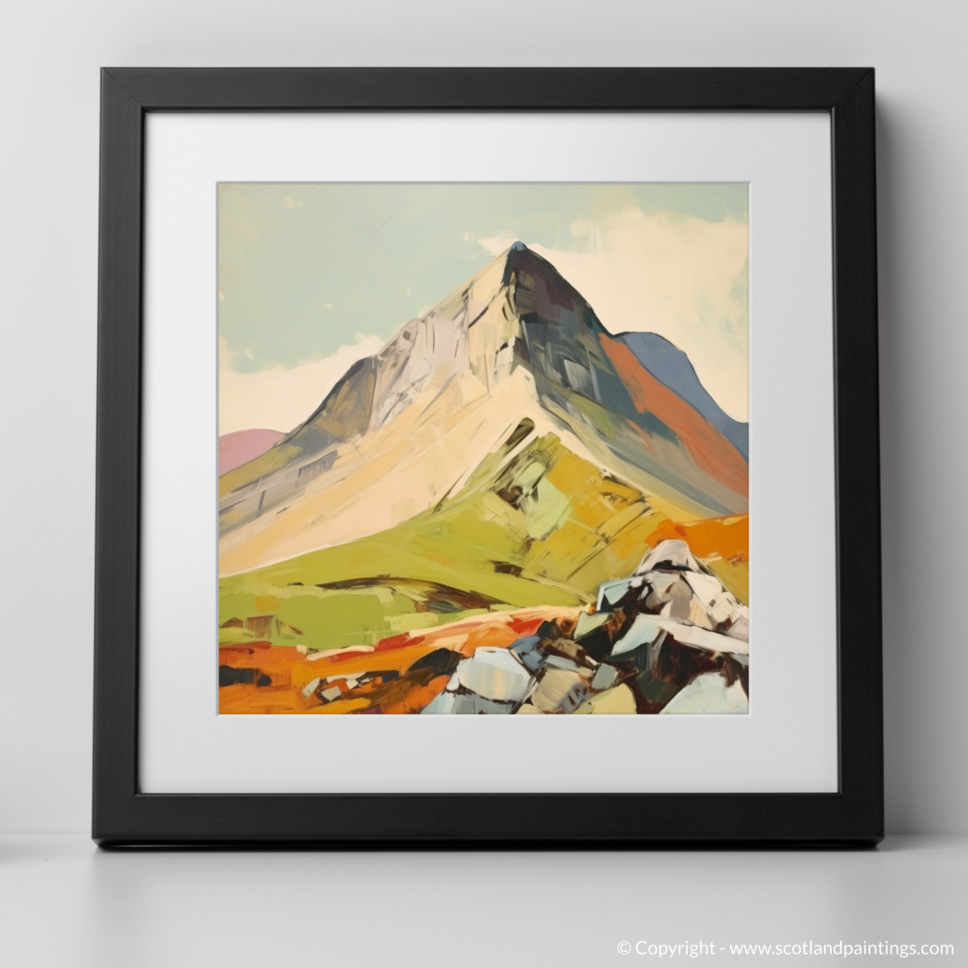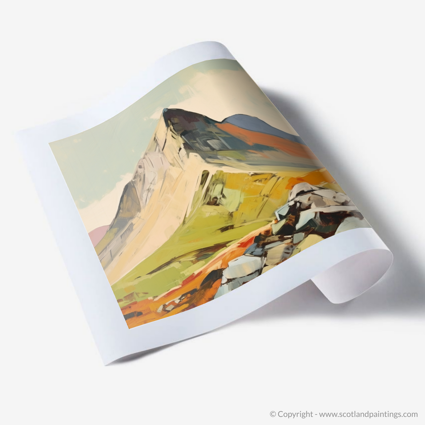 The mountain itself rises with an ethereal quality, its peaks rendered in soft whites, greys, and muted blues that contrast against a serene sky. The artist's use of colour and form captures the essence and mood of Scotland's natural wonders without the constraints of realistic representation. This approach allows viewers to experience the mountain's grandeur and the emotions it evokes through the lens of abstraction.