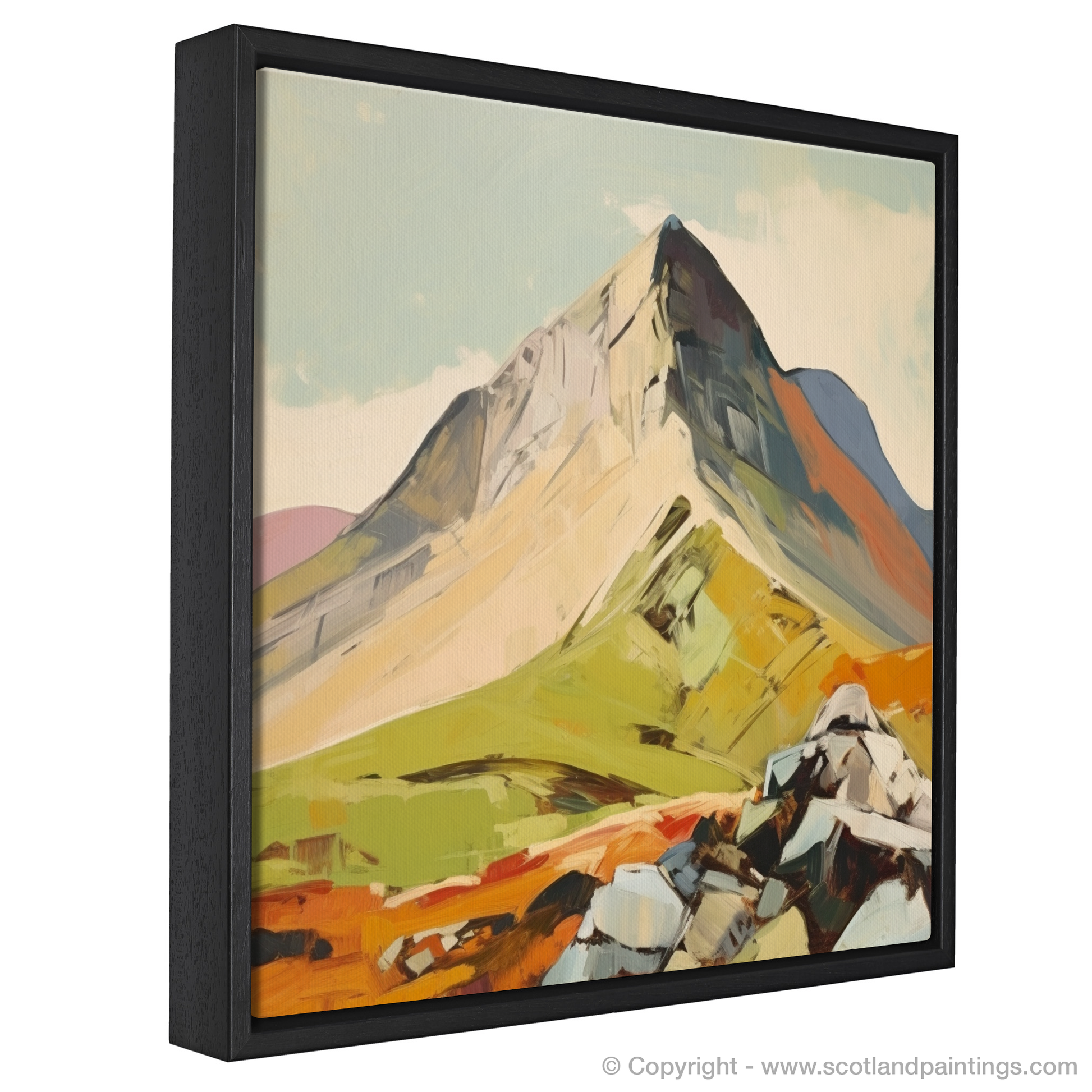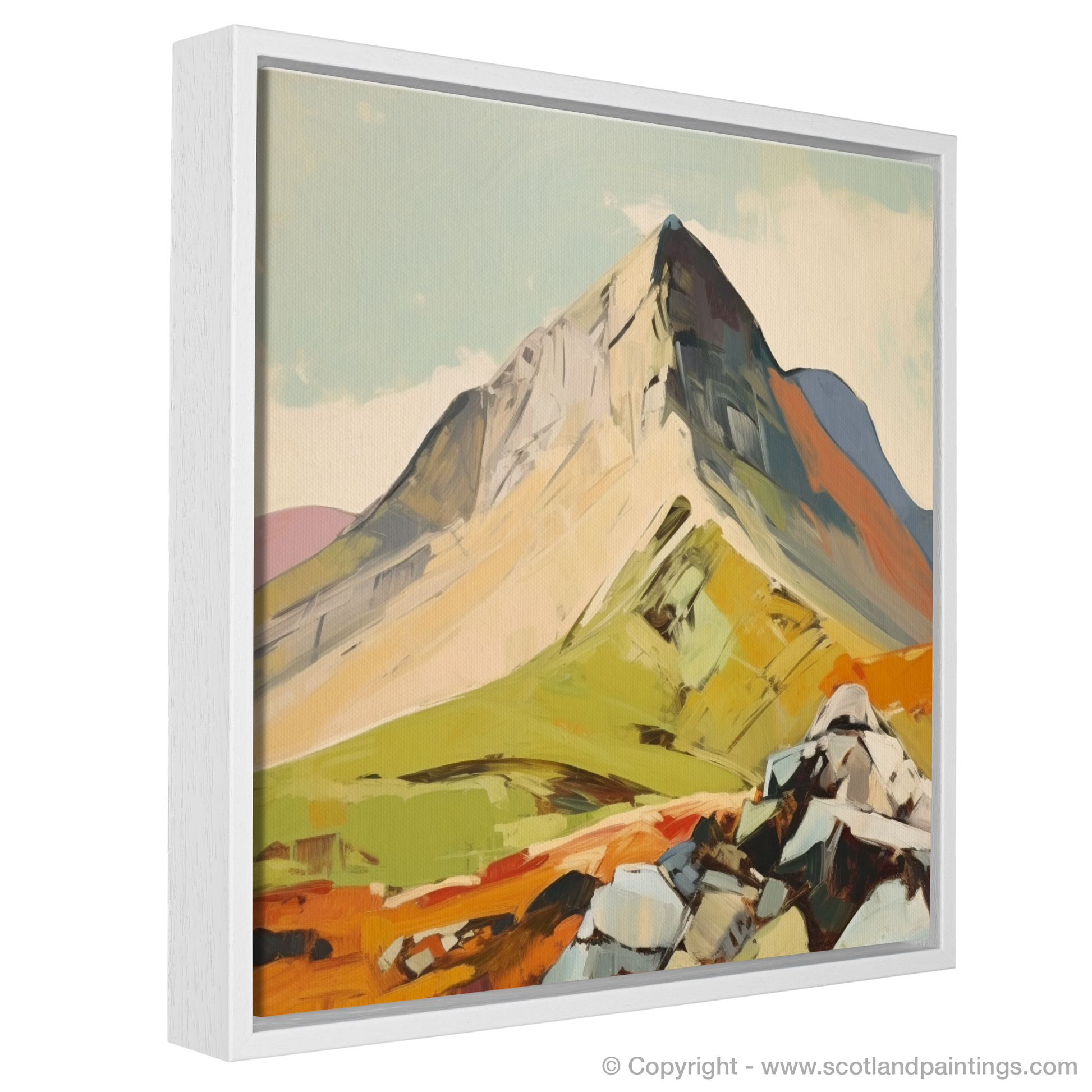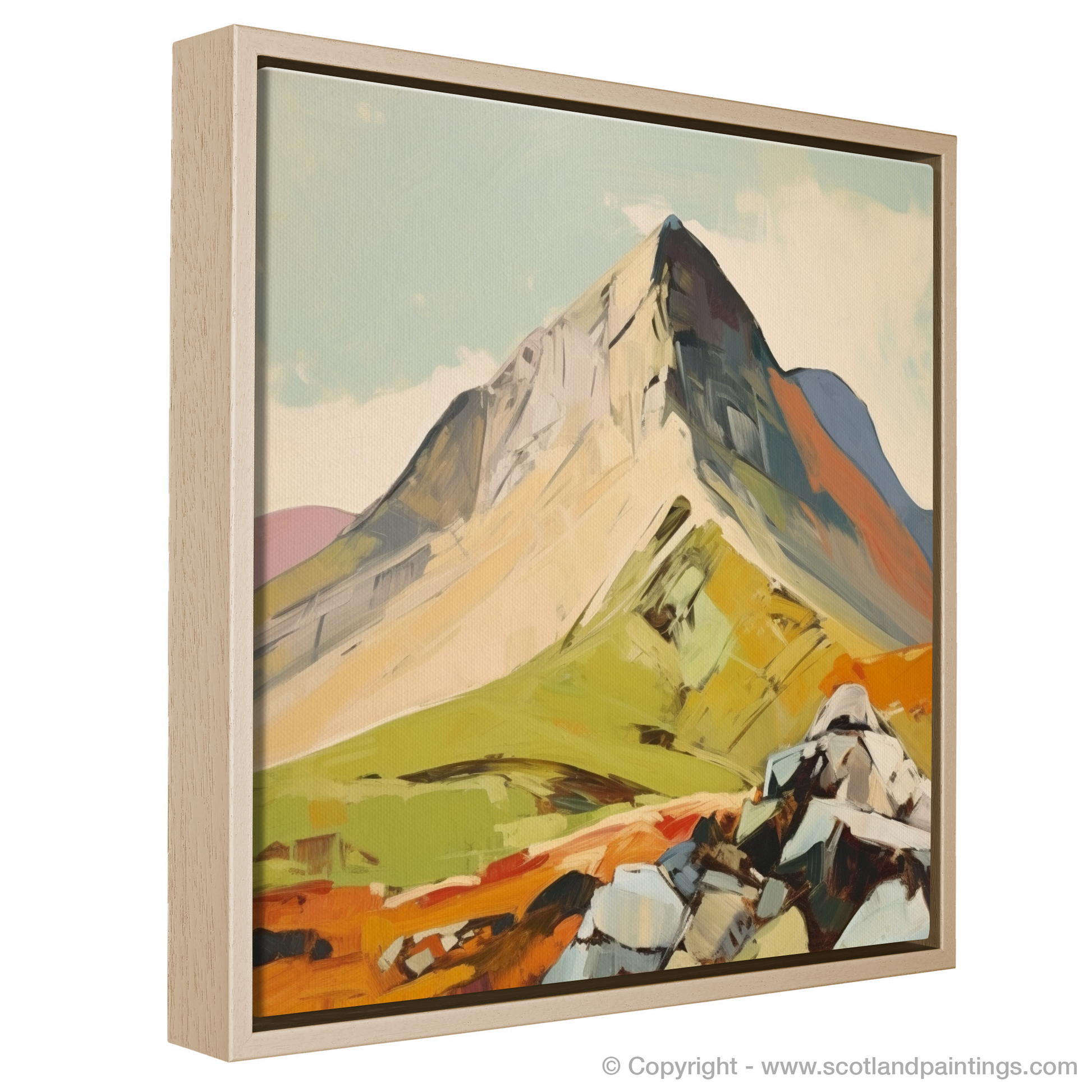 The mountain itself rises with an ethereal quality, its peaks rendered in soft whites, greys, and muted blues that contrast against a serene sky. The artist's use of colour and form captures the essence and mood of Scotland's natural wonders without the constraints of realistic representation. This approach allows viewers to experience the mountain's grandeur and the emotions it evokes through the lens of abstraction.