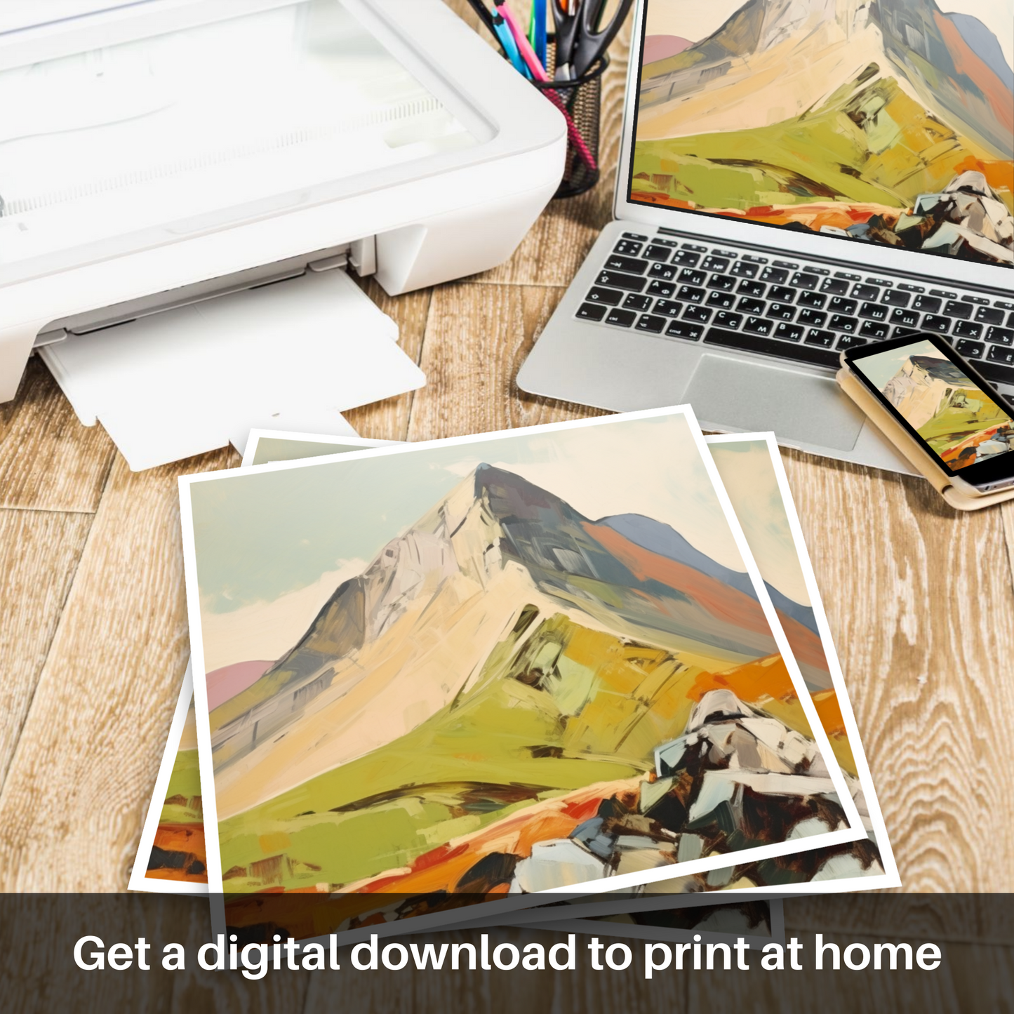 Capture the stirring beauty of Scotland's rugged landscape with this evocative abstract expressionist print. The piece features a dynamic rendition of a Scottish mountain, its majestic form reimagined through bold brushstrokes and a vibrant palette. Sweeping hues of ochre, verdant green, and earthy browns form the mountain's base—a tapestry of colour suggesting wild, untamed moorlands.