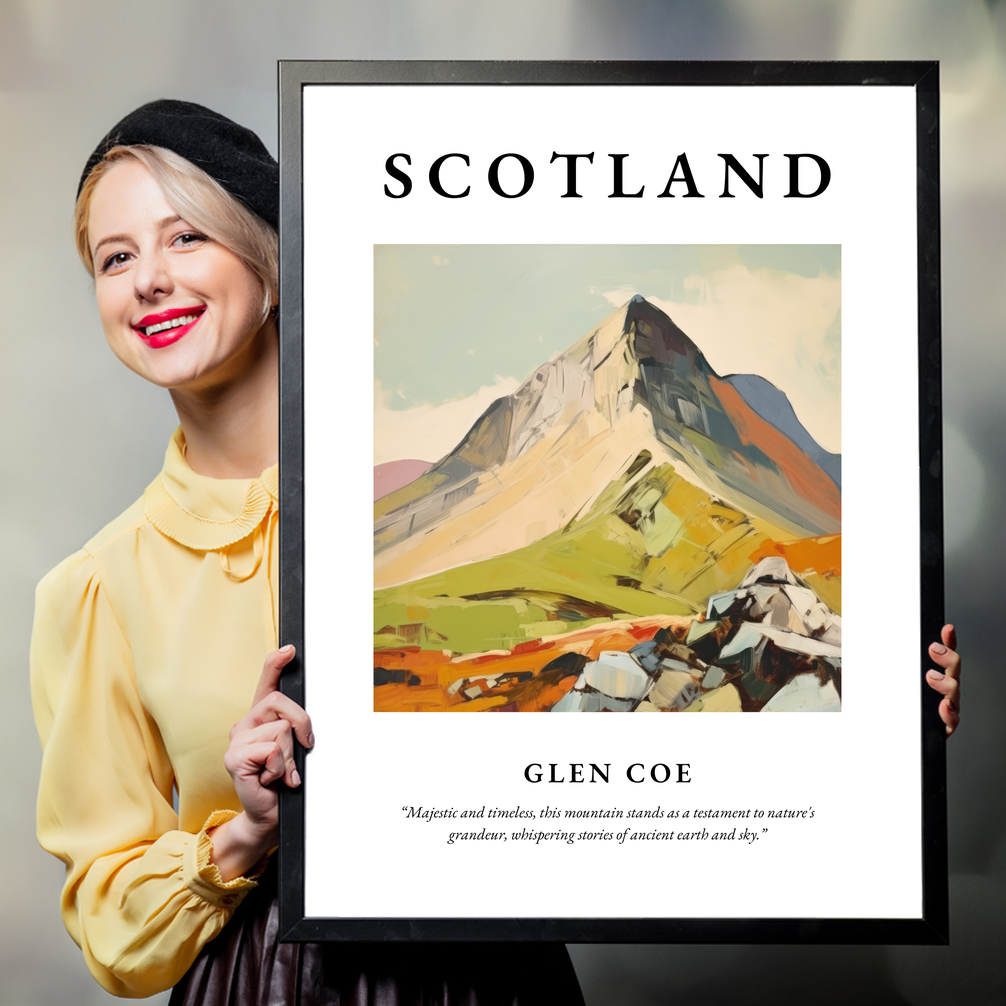 The word “SCOTLAND” dominates the top in bold lettering, instantly capturing attention and setting the stage for a journey through art and nature. Below, an abstract expressionist painting of Glen Coe unravels in vibrant hues and dynamic brushstrokes, evoking the untamed spirit of this legendary landscape. The essence of Glen Coe is beautifully encapsulated in broad swaths of colour, which capture the rugged peaks and sweeping valleys in a fresh and modern style.