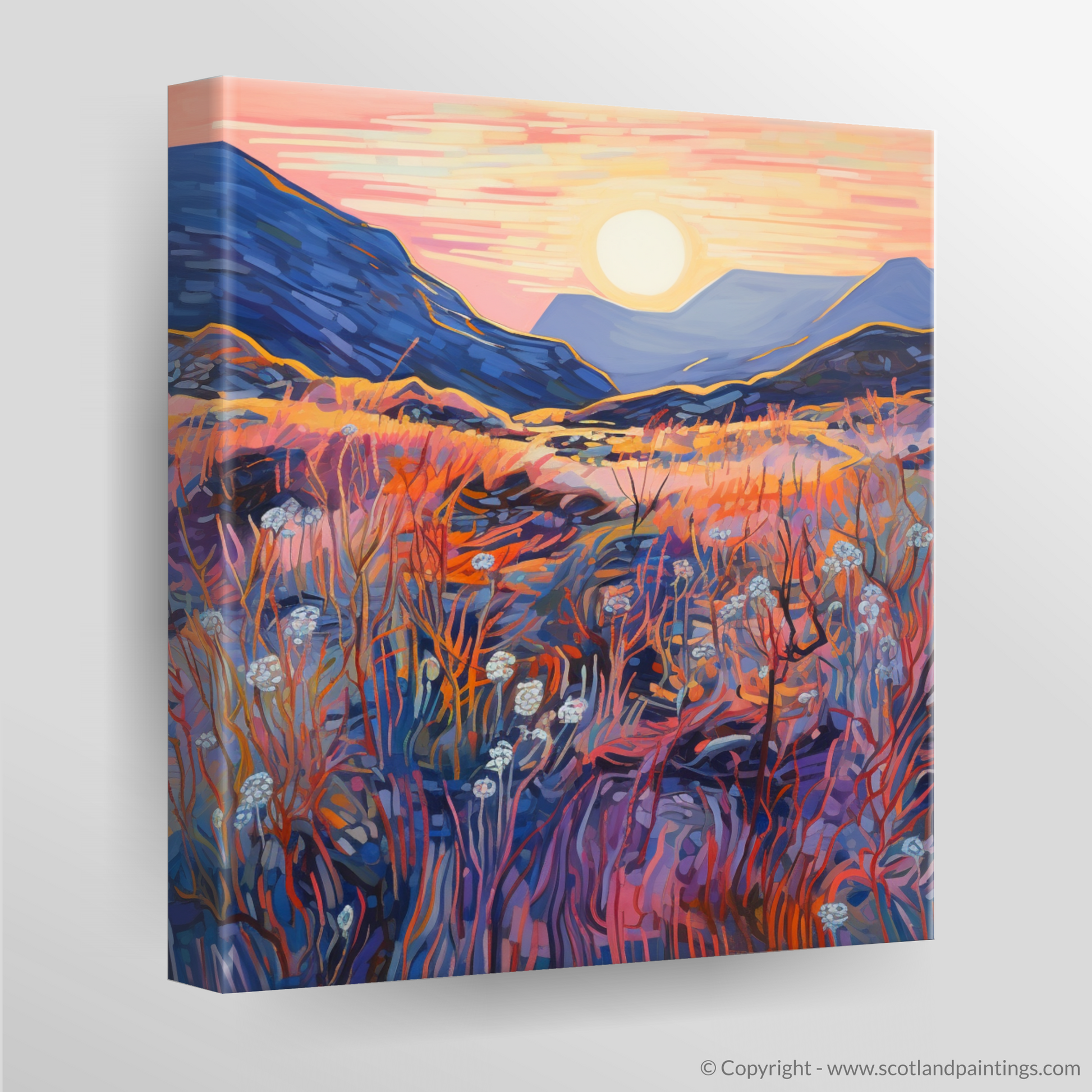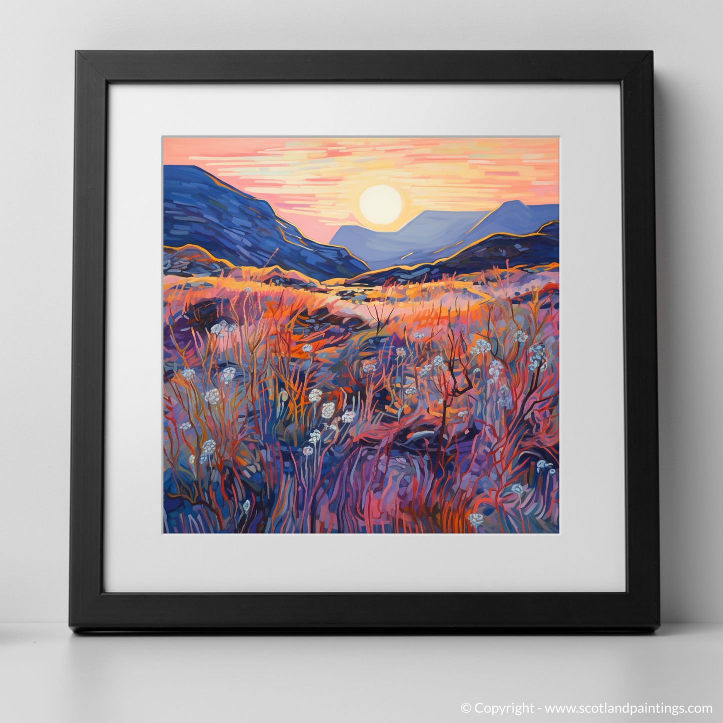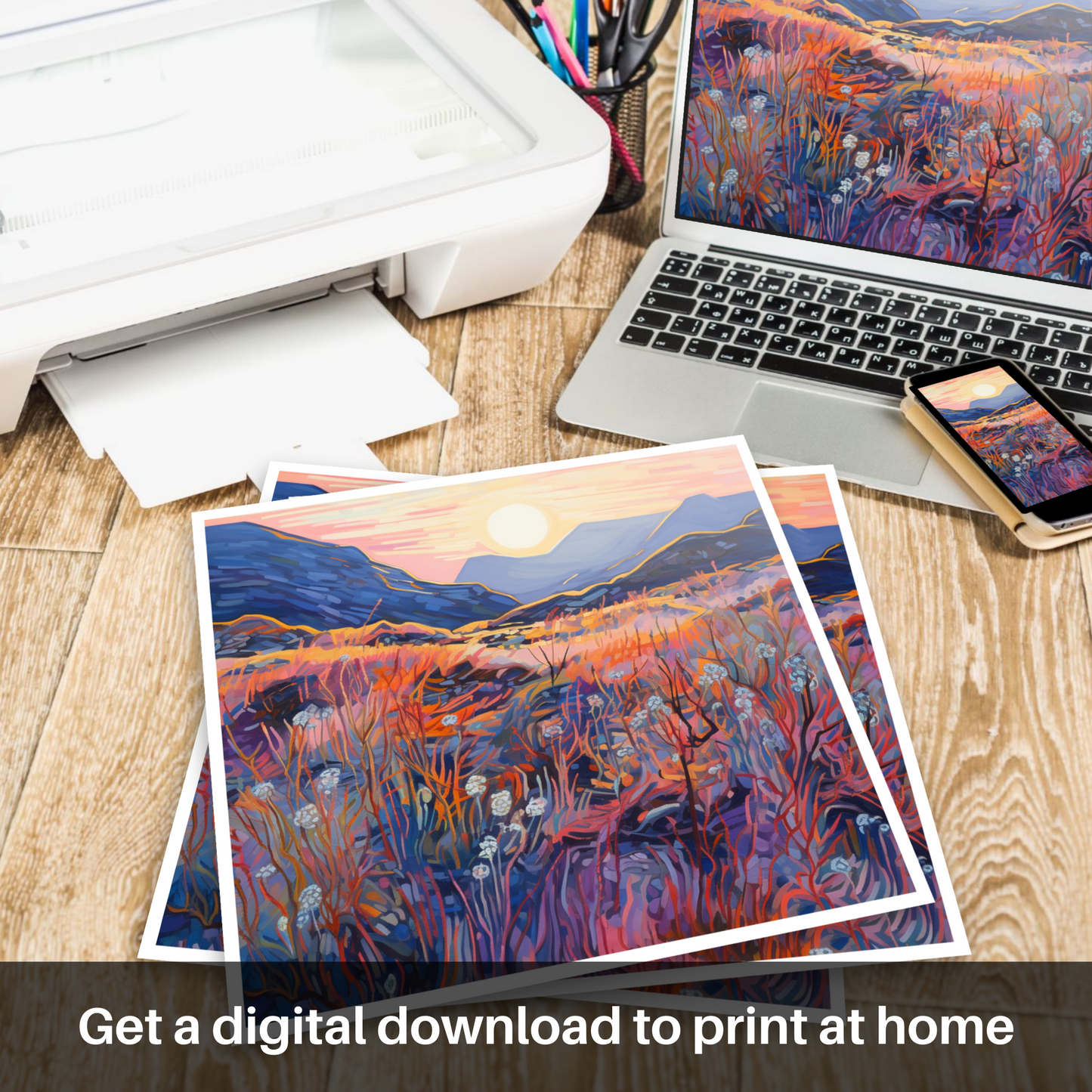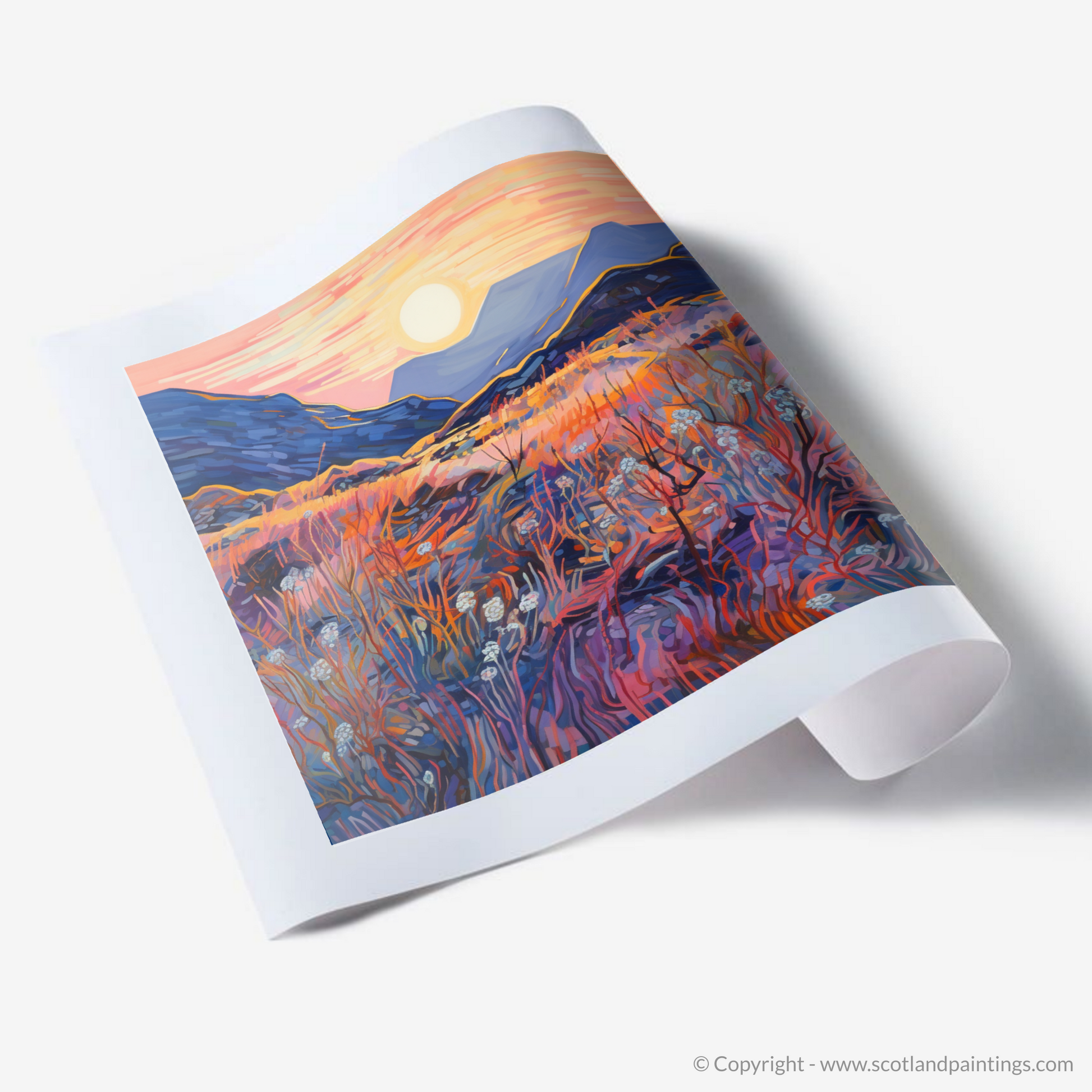 In the foreground, the rich tapestry of flora is depicted in a symphony of vivid colours, with strokes of deep purples, blues, and fiery oranges that create a dynamic contrast with the subdued tones of the mountainous terrain. The wild texture of the landscape is beautifully rendered with expressive lines and a contemporary flair, highlighting the natural beauty of Scottish heathland as day turns to night.