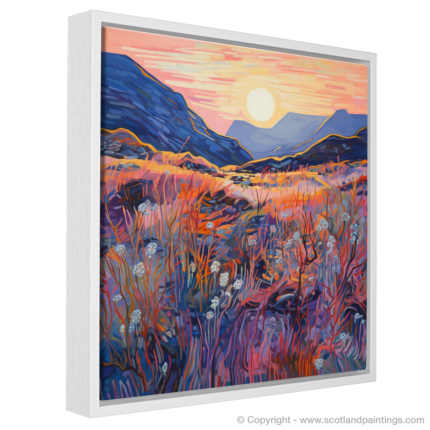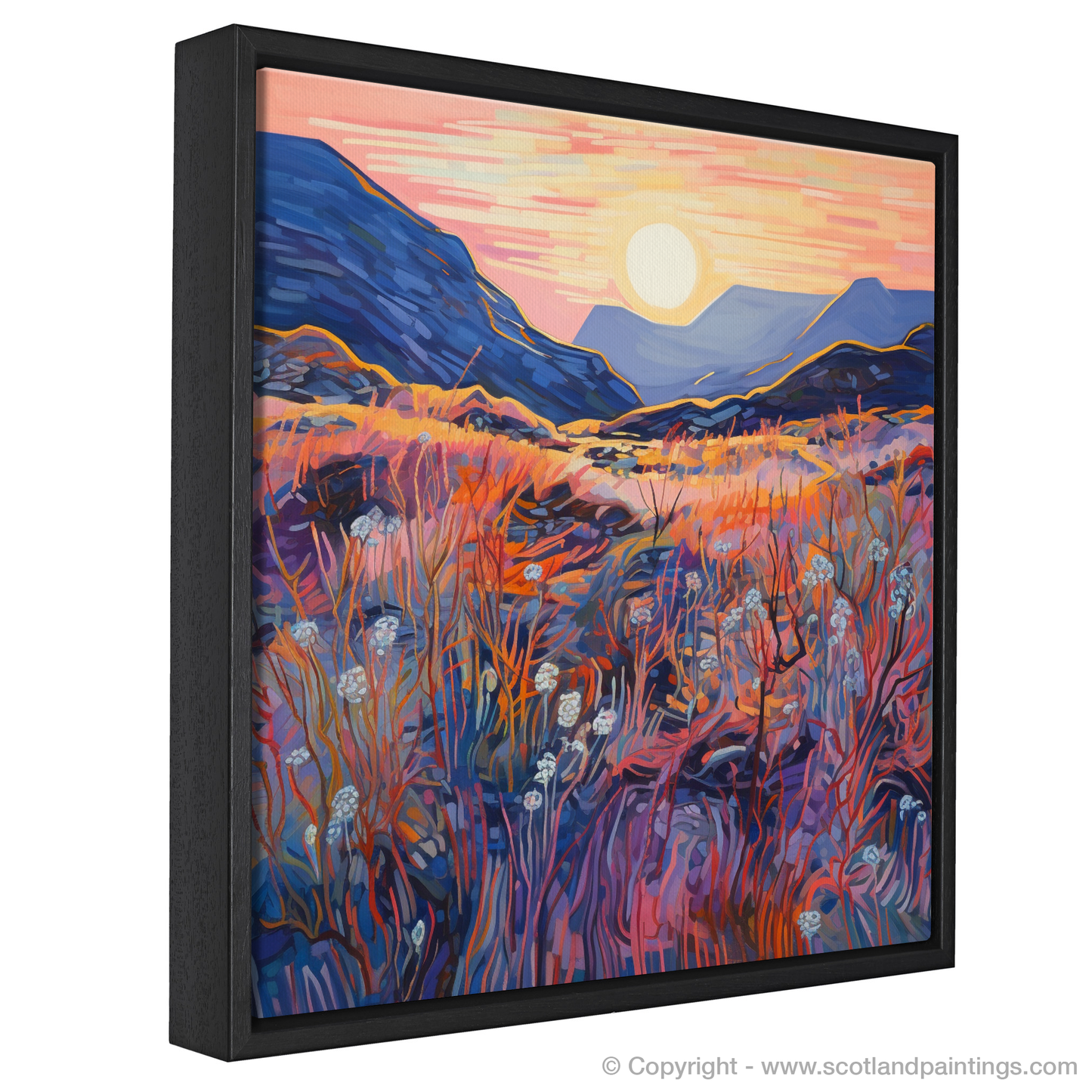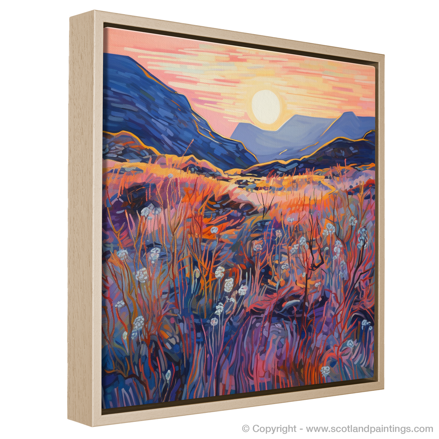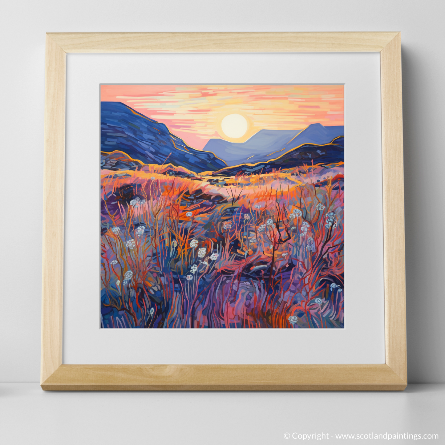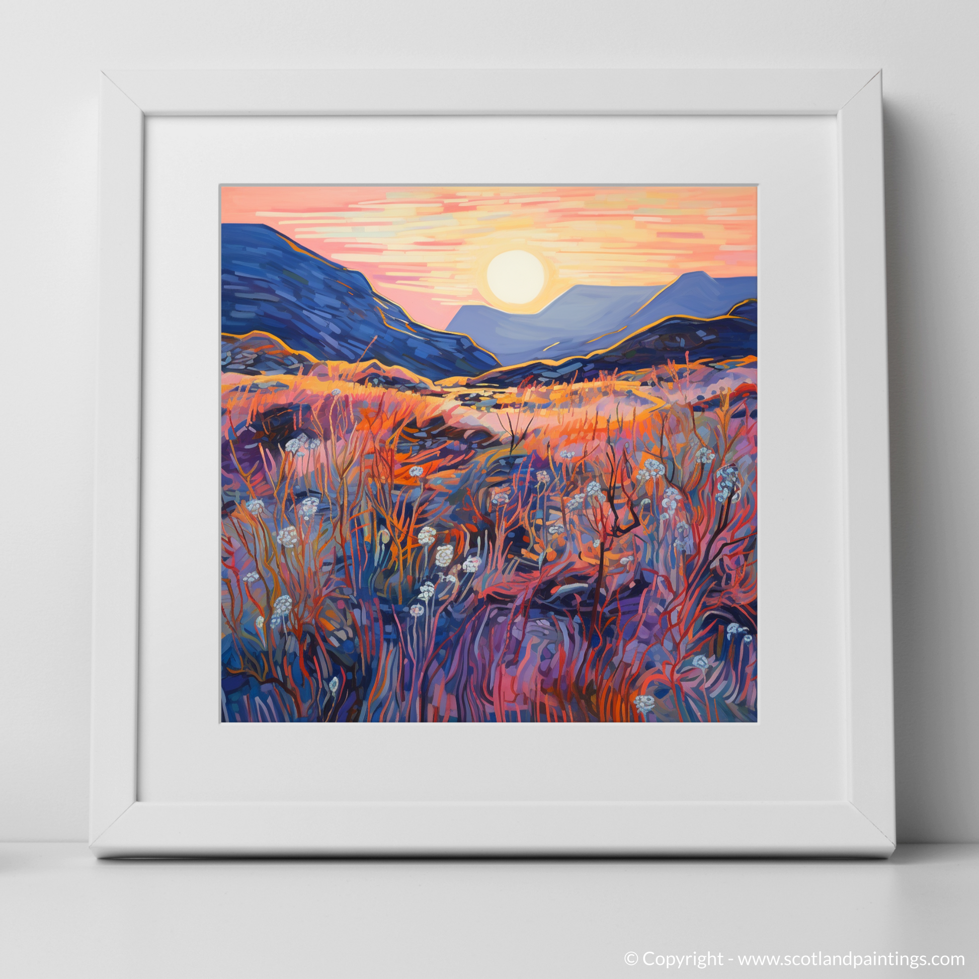 In the foreground, the rich tapestry of flora is depicted in a symphony of vivid colours, with strokes of deep purples, blues, and fiery oranges that create a dynamic contrast with the subdued tones of the mountainous terrain. The wild texture of the landscape is beautifully rendered with expressive lines and a contemporary flair, highlighting the natural beauty of Scottish heathland as day turns to night.