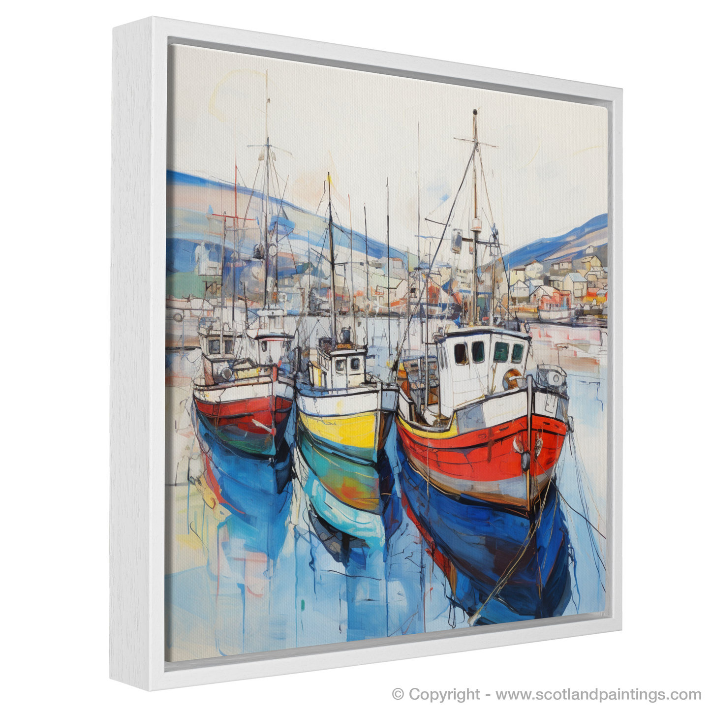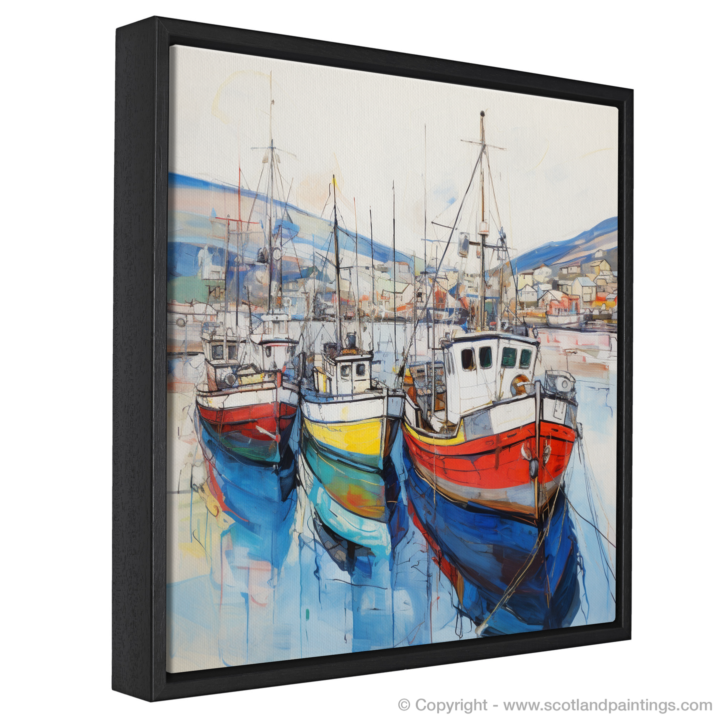 Captured within this print is a vibrant interpretation of Ullapool Harbour, a scene animated with the stirring vitality of seafaring life and the tranquil beauty of Scotland's natural splendour. A fleet of stately fishing boats, their hulls painted in a kaleidoscope of resplendent colours that dance upon the tranquil waters, anchors the composition with a sense of hearty tradition and maritime charm.