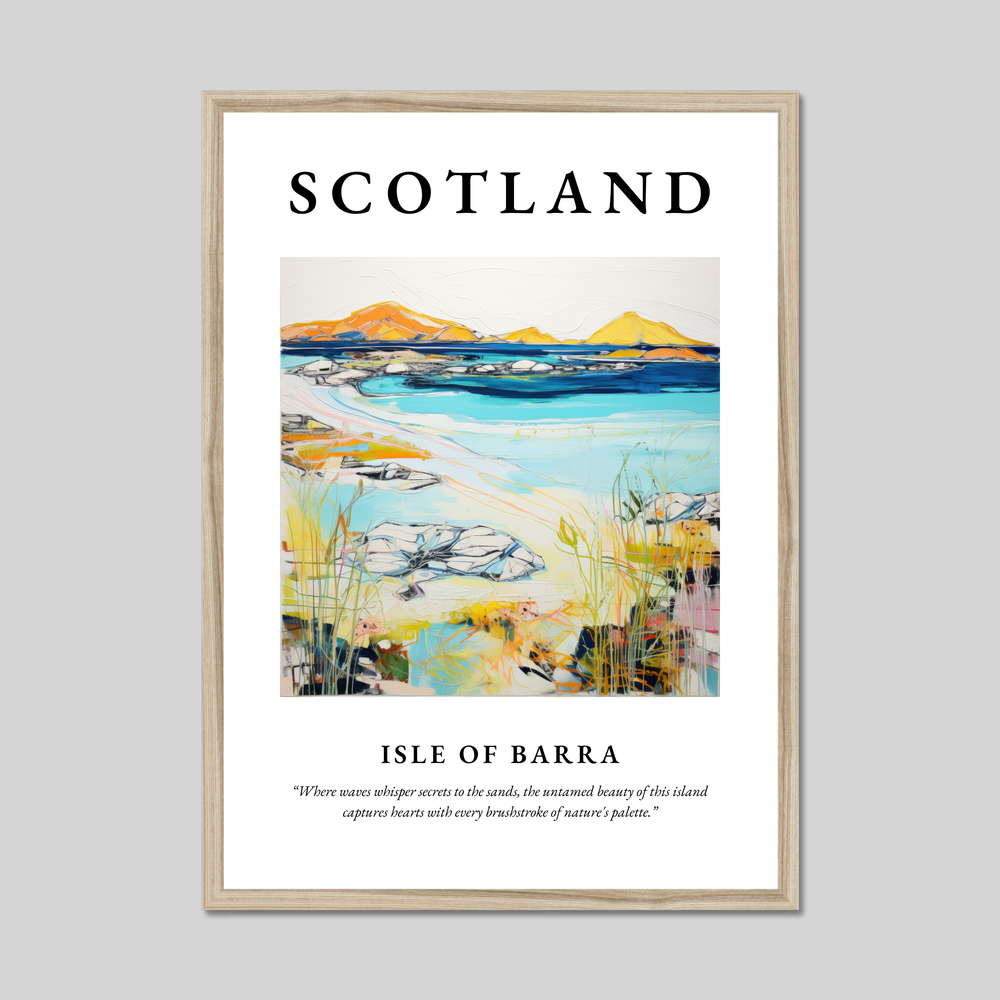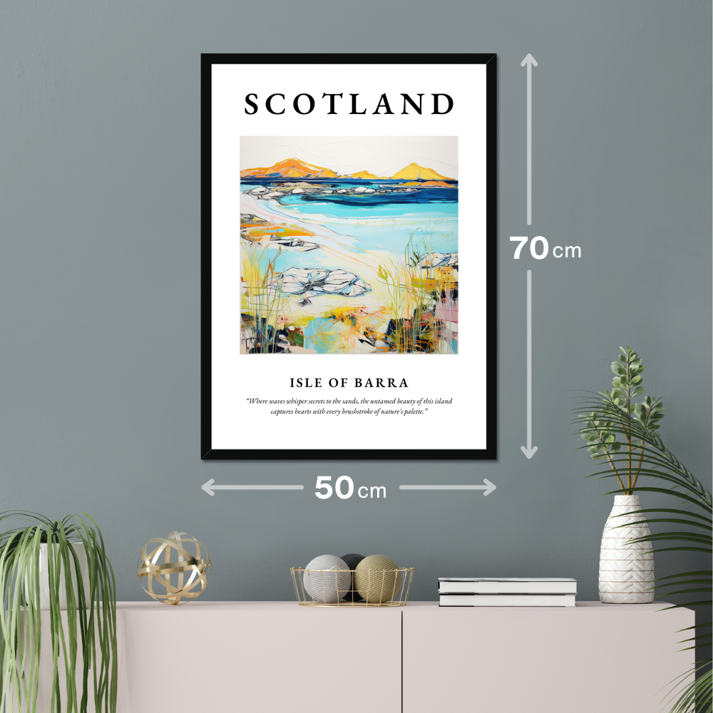 Immerse yourself in the serene allure of Scotland with our exquisite framed poster print—a perfect tribute to the breathtaking Isle of Barra. This captivating piece, measuring an impressive 50cm x 70cm, serves as a striking centrepiece for any room, effortlessly covering a large wall area while remaining an affordable luxury.