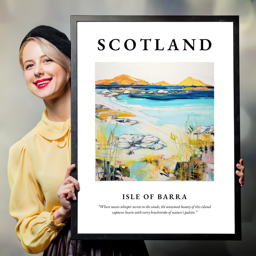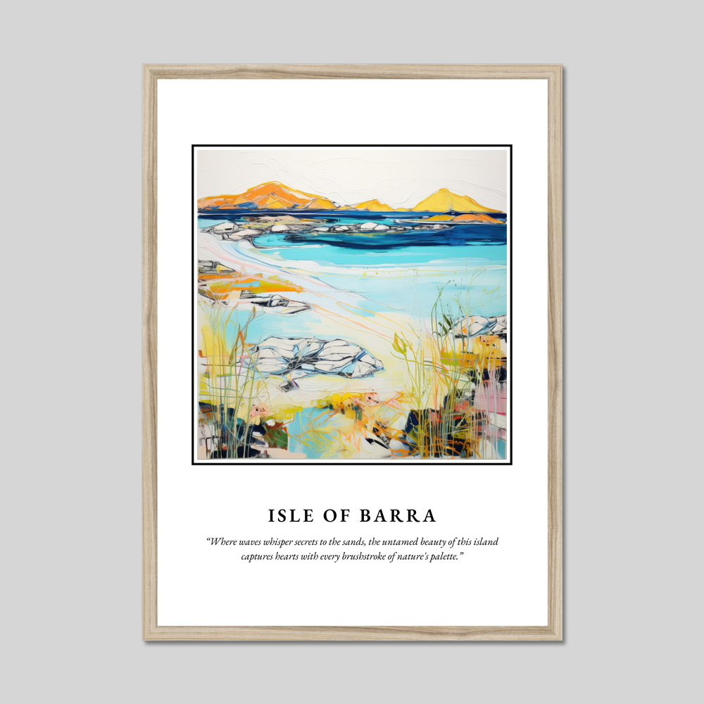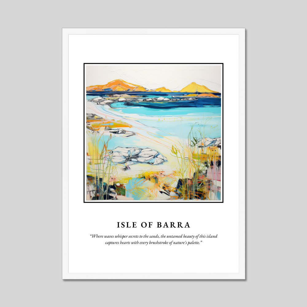 The painting invites onlookers into a world where vibrant blues and earthy yellows dance across the canvas, portraying the harmonious meeting of land and sea. It’s more than just a landscape—it's an emotional journey. The quote beneath, “Where waves whisper secrets to the sands, the untamed beauty of this island captures hearts with every brushstroke of nature's palette,” encapsulates the mystique and charm of Barra. This piece will resonate with those who cherish their Scottish roots, fondly recall a visit, or appreciate contemporary art's expressive beauty.