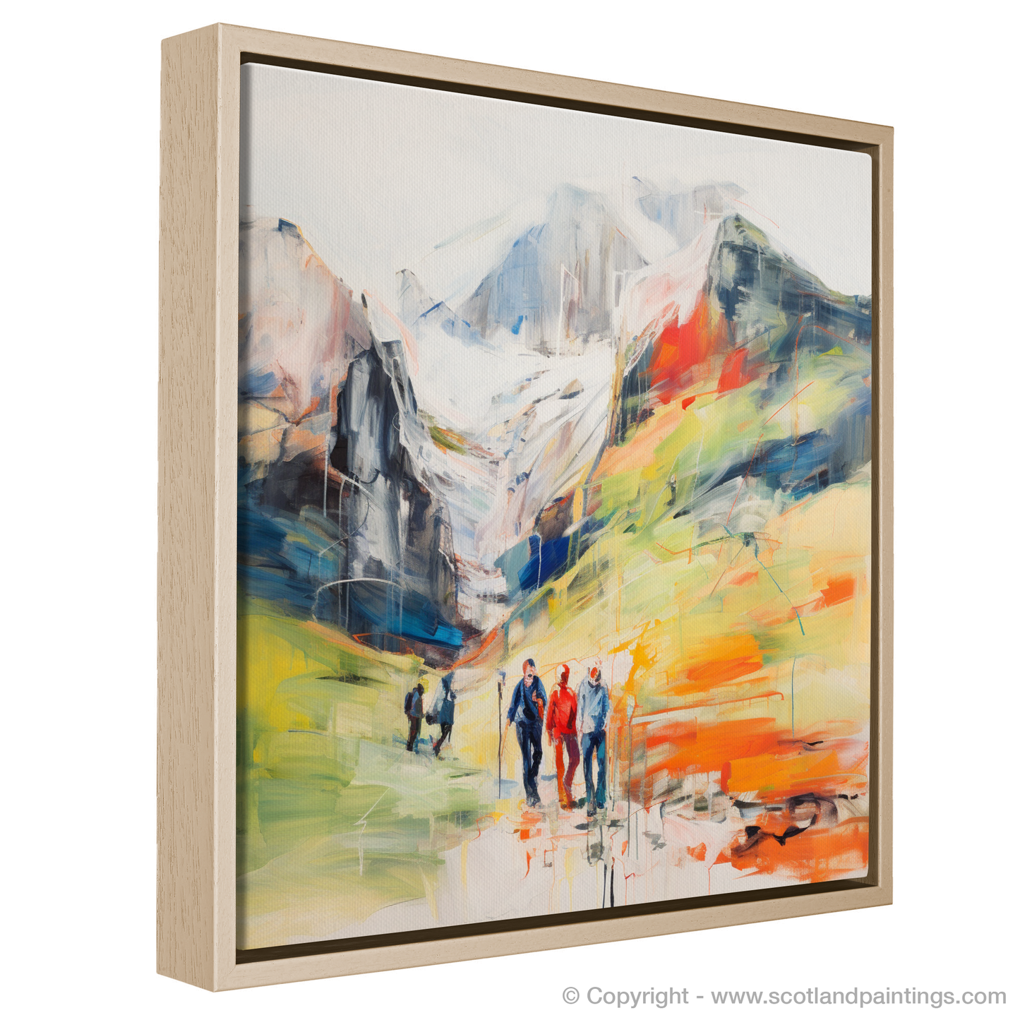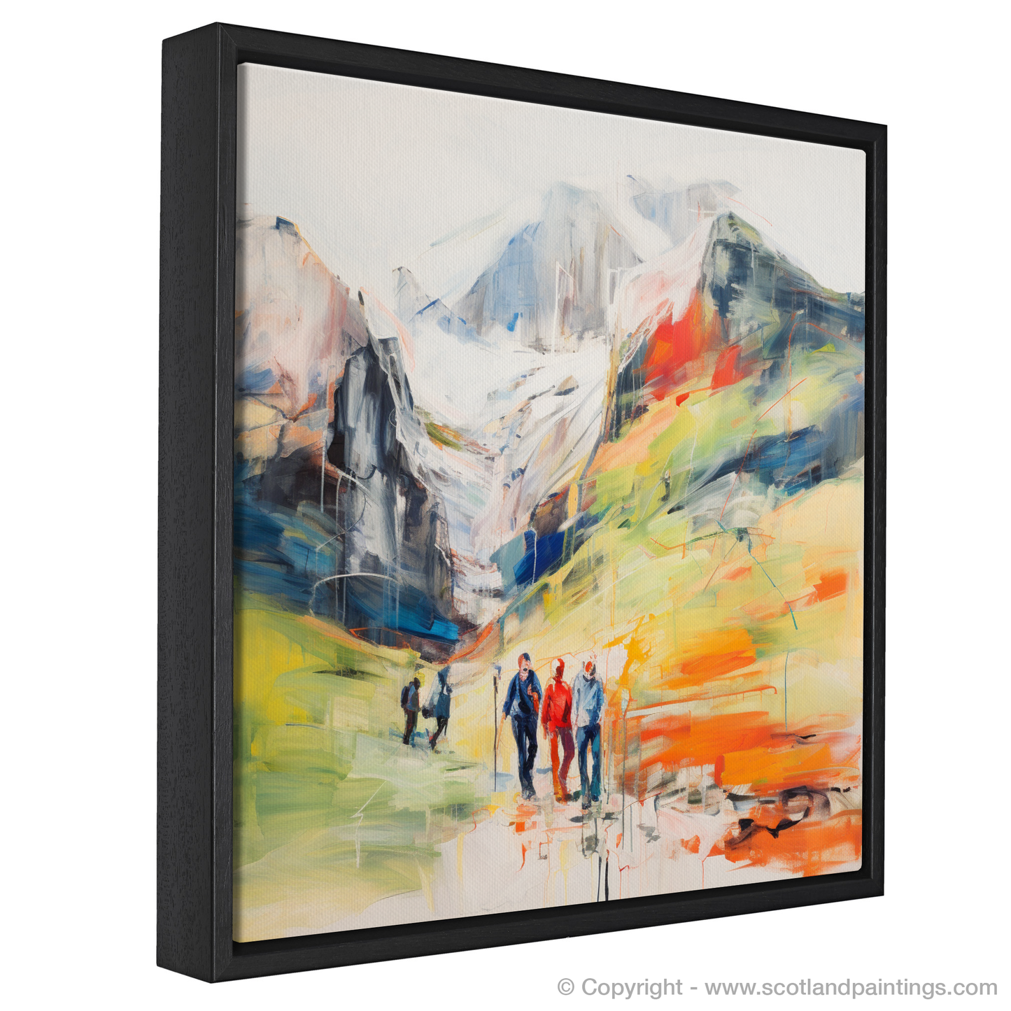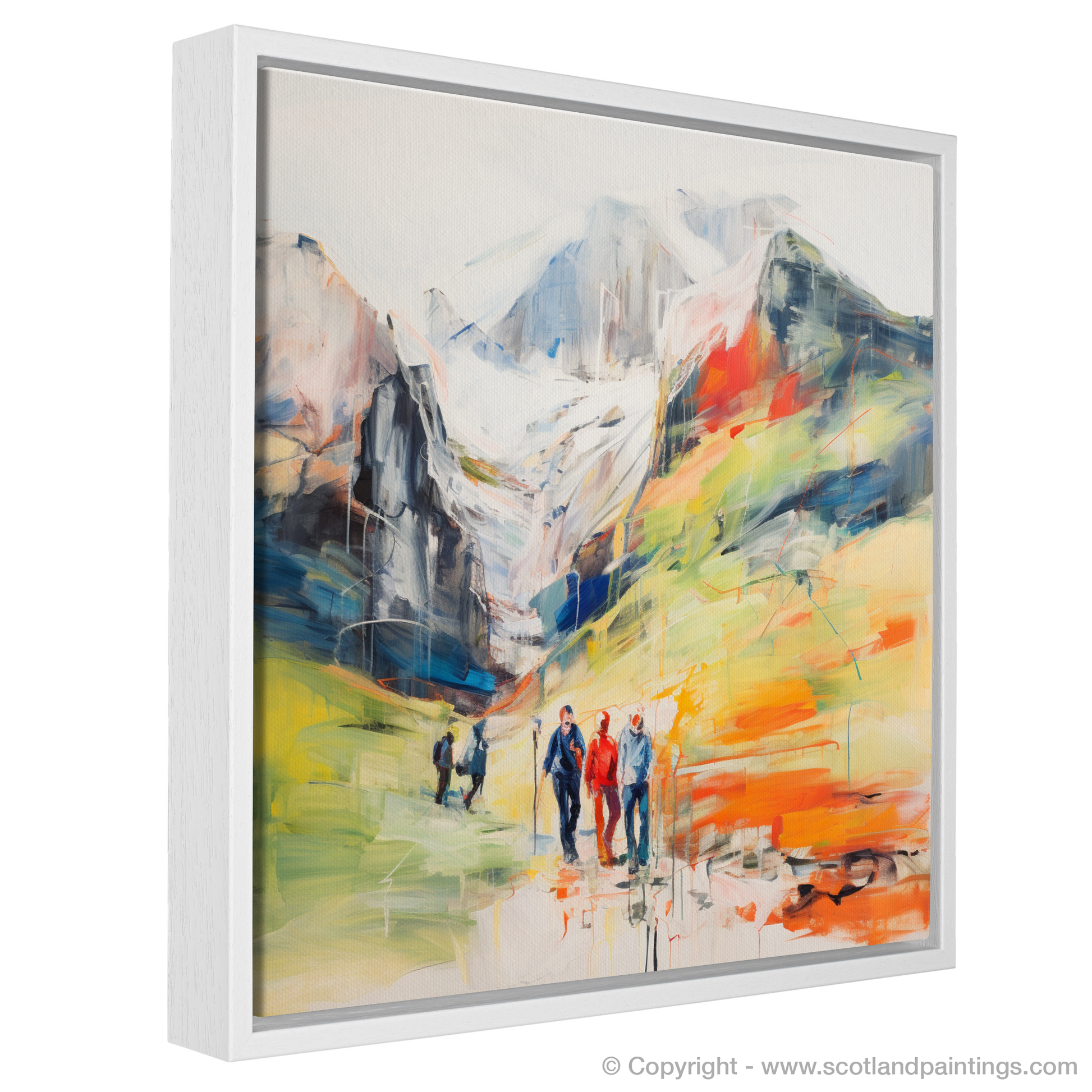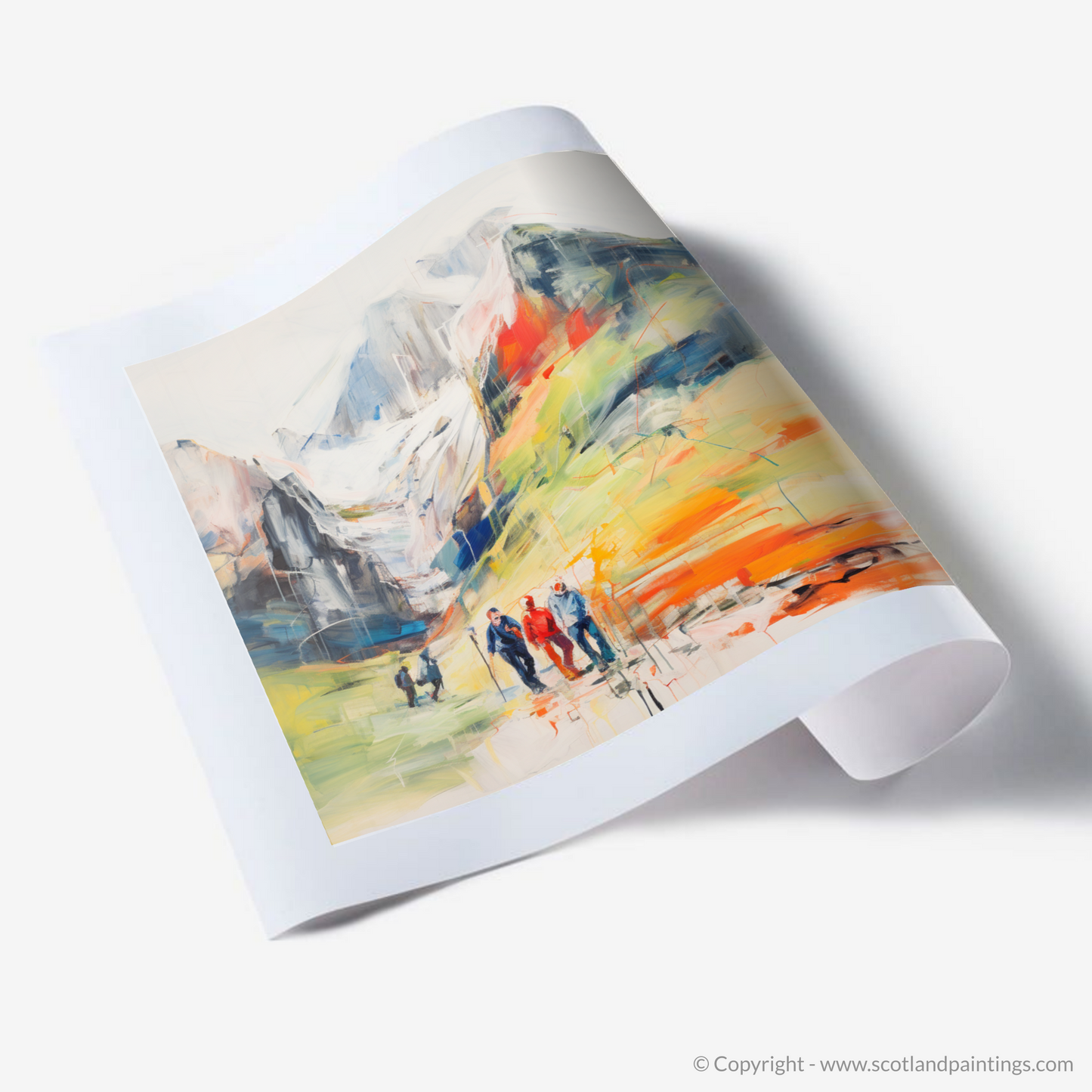 This captivating print, part of our 'Scotland Favourites' collection, depicts the raw beauty of the Scottish Highlands with a vibrant, contemporary twist. The scene captures a group of hikers traversing the rugged terrain of Glencoe, each figure portrayed with a blend of fluid lines and bold colours that suggest movement and the invigorating essence of outdoor adventures.