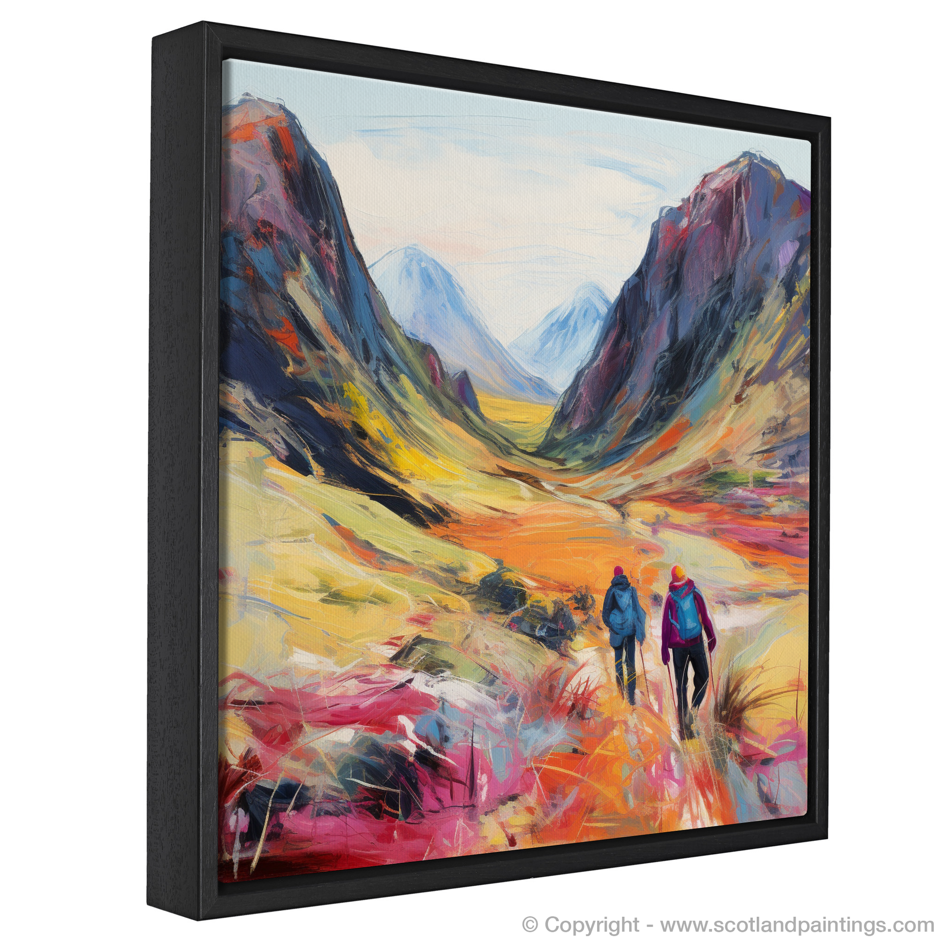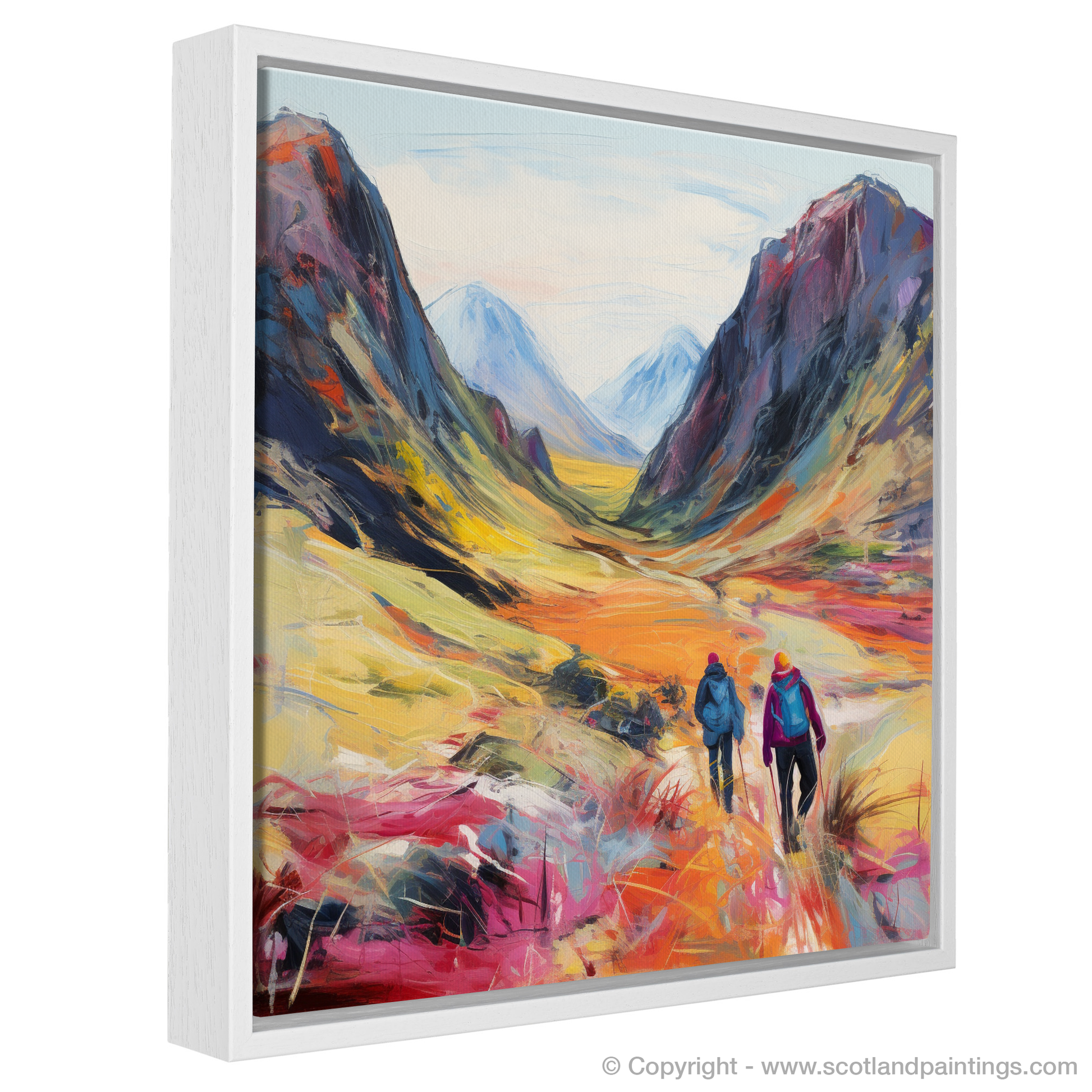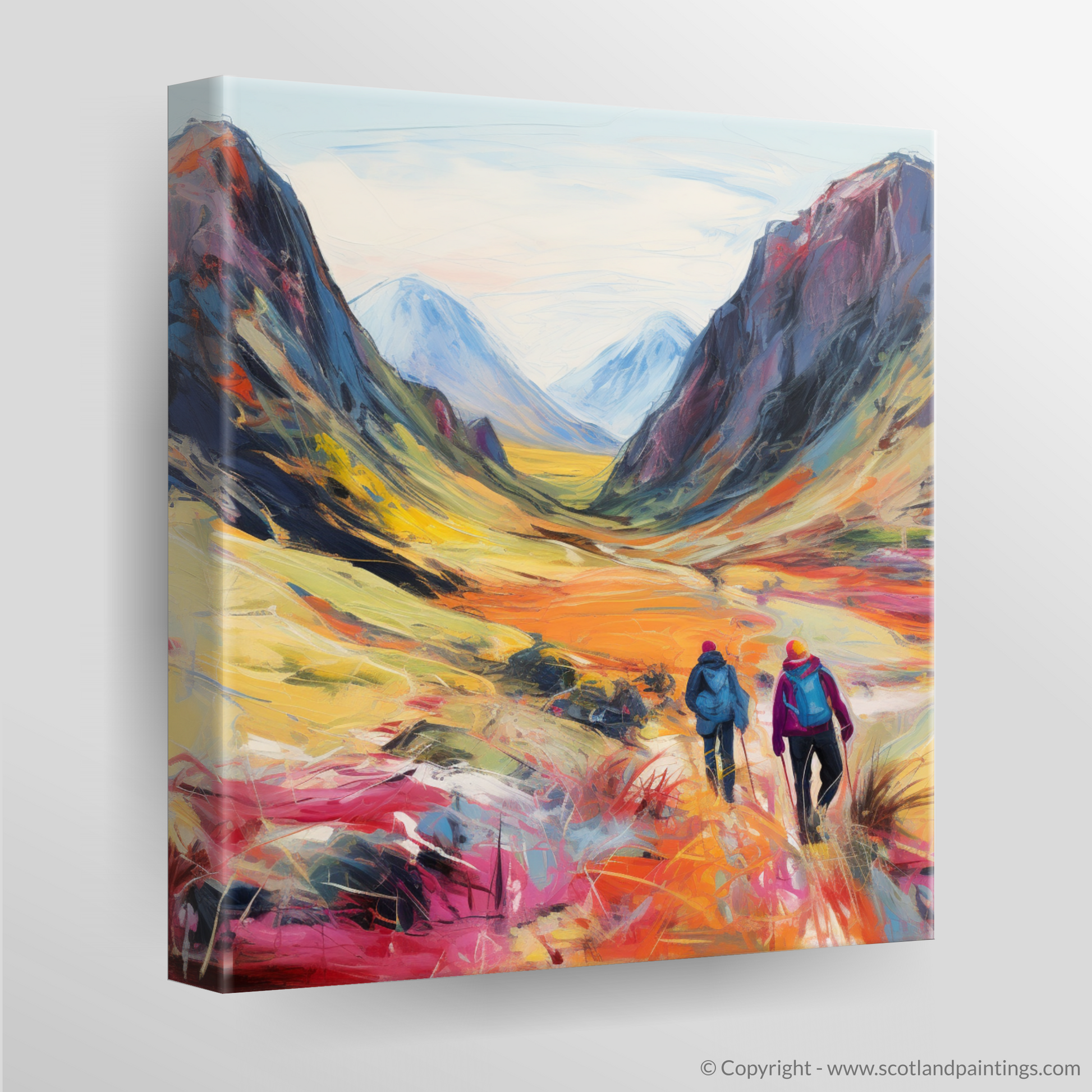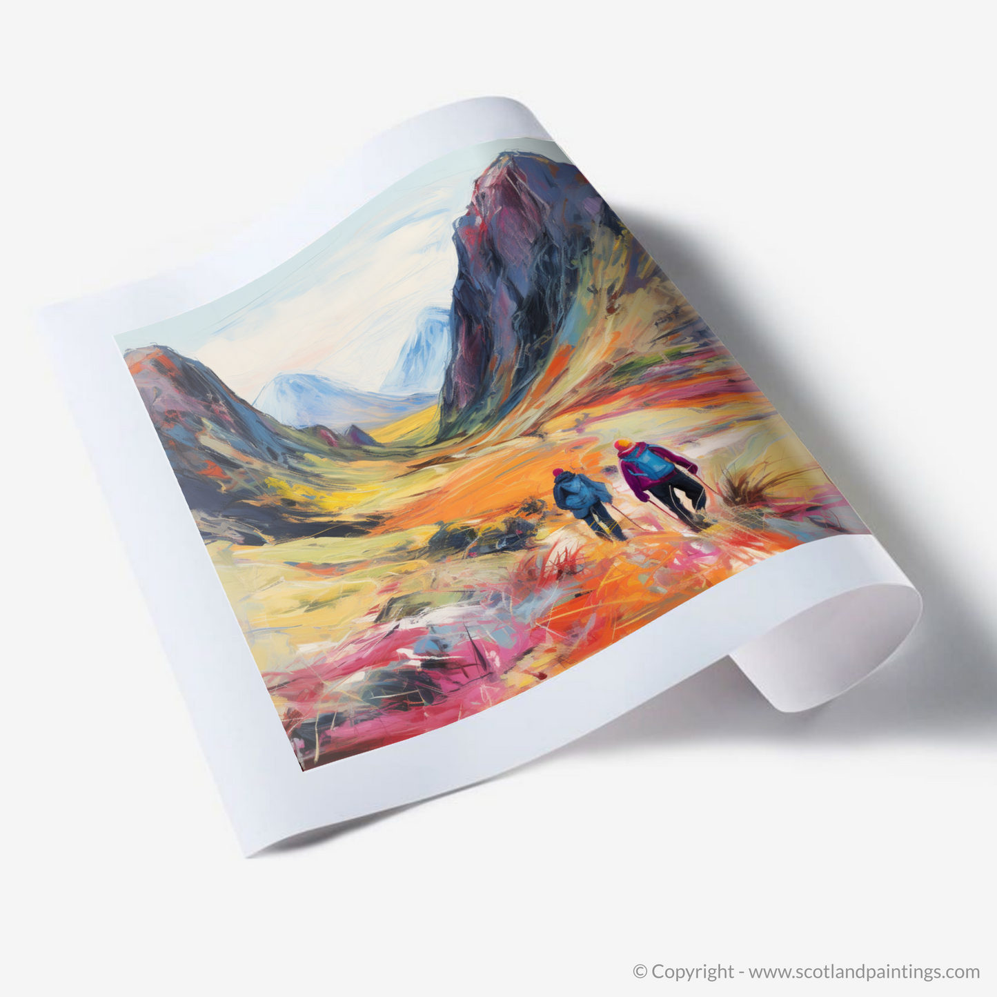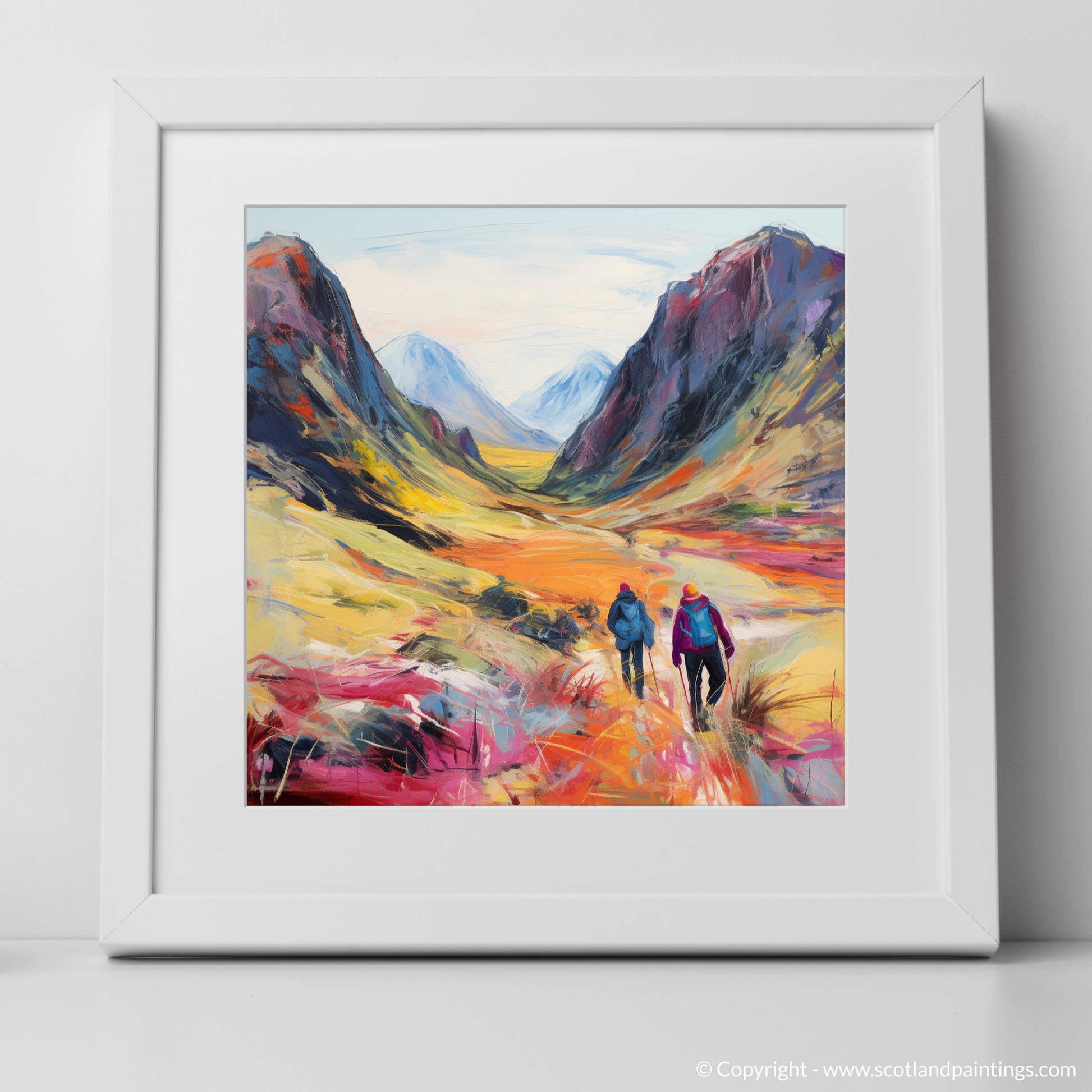 This vibrant print captures the essence of a Scottish adventure, featuring two hikers amidst the stunning landscape of Glencoe. With bold, expressive brushstrokes, the contemporary style breathes energy and movement into the scene. Vivid hues of orange, yellow, and pink infuse the valley floor with a warmth that contrasts the cool tones of the distant mountains. The imposing peaks rise steeply, rendered in shades of purple and grey, while a soft sky looms above, inviting the viewer to ponder the vastness of nature.