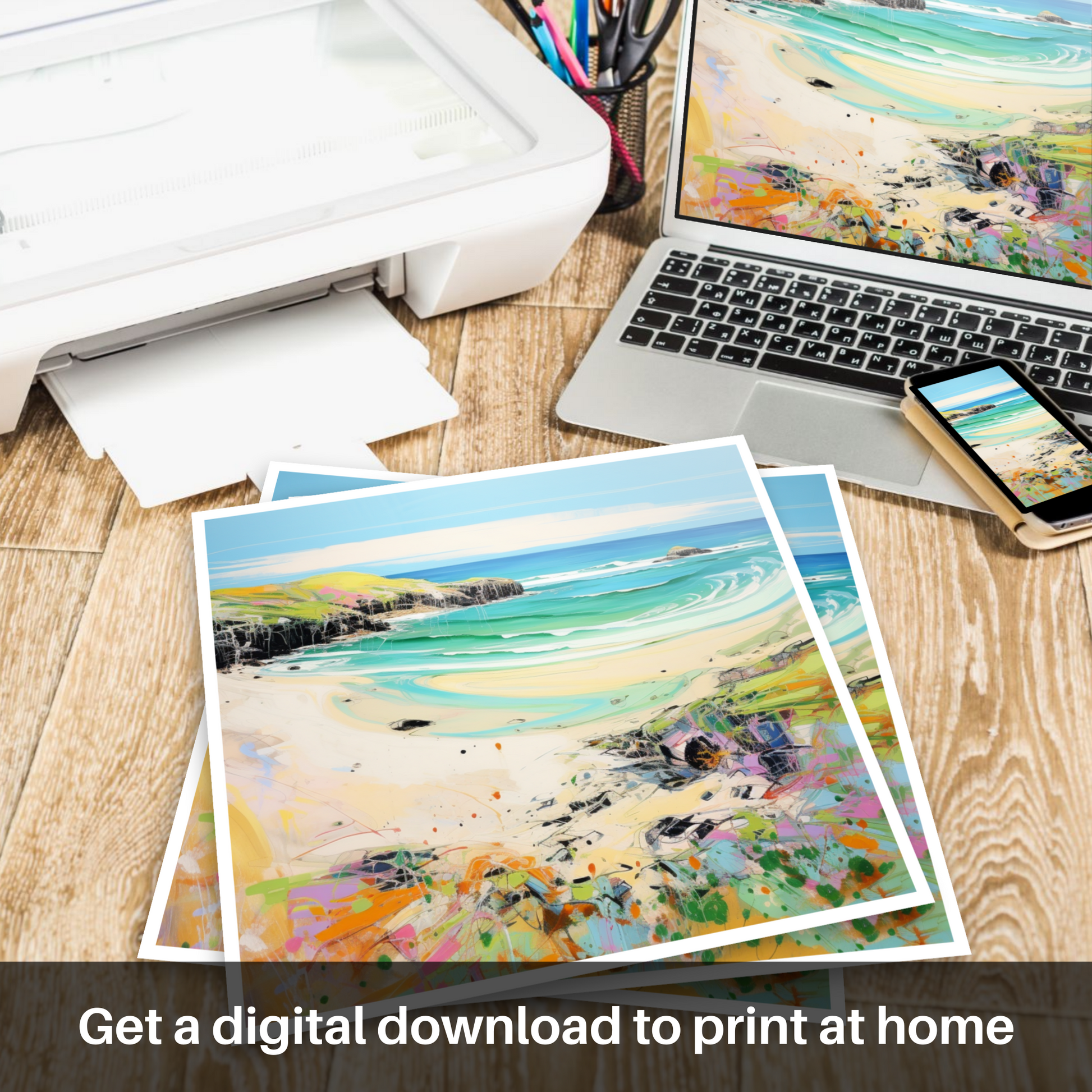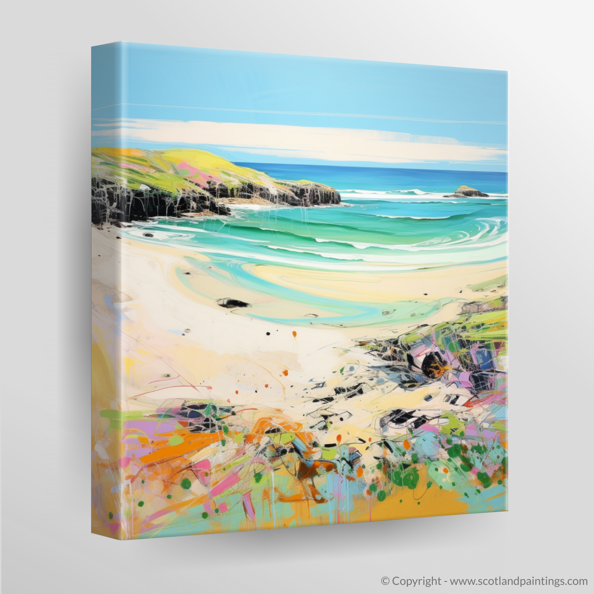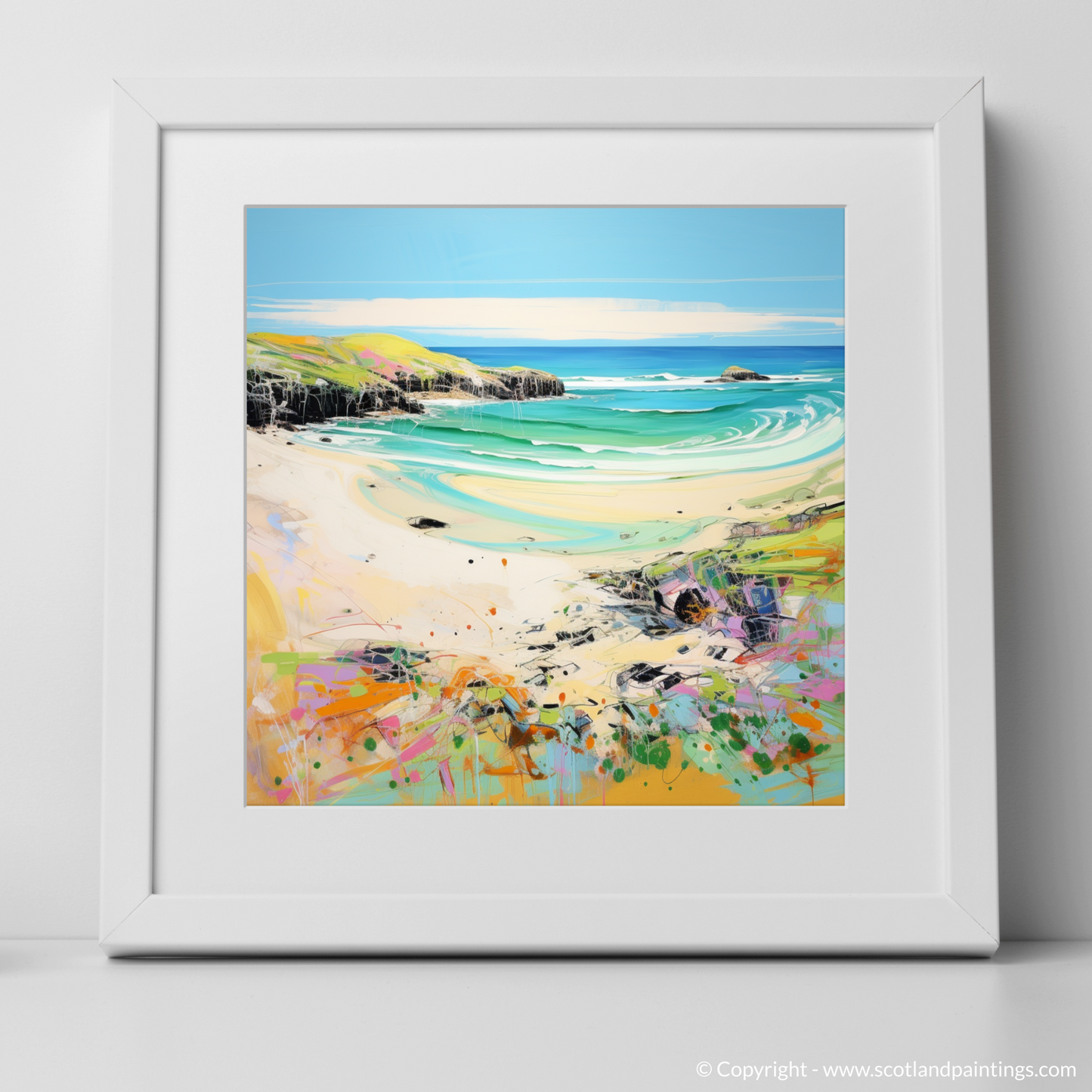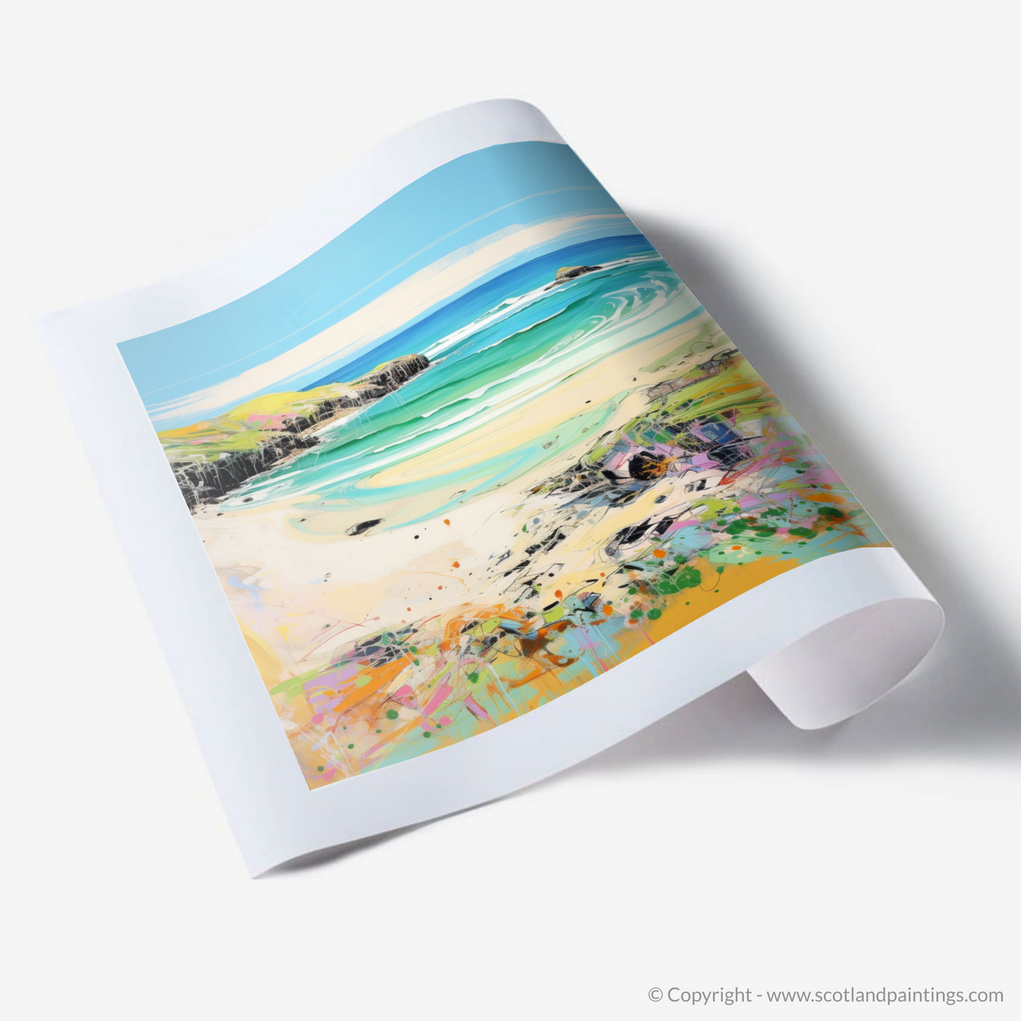 Capture the essence of a Scottish summer with this vibrant print inspired by the stunning Durness Beach in Sutherland. The piece radiates the lively energy of contemporary art, presenting a fresh and dynamic interpretation of the picturesque coastal landscape.