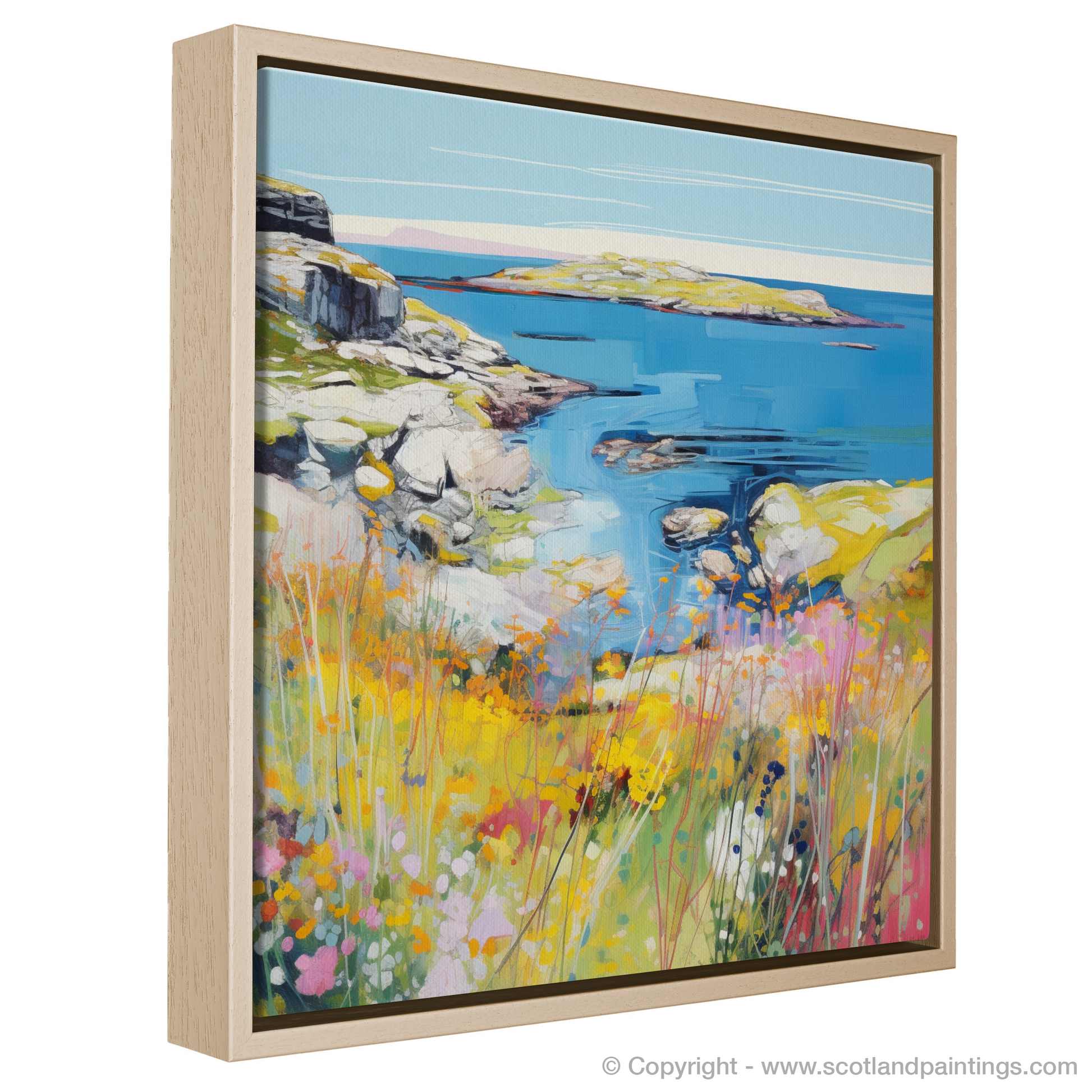 Capturing the vibrant essence of the Isle of Scalpay in the Outer Hebrides, this exquisite print presents a lively, contemporary rendition of summer's embrace on the Scottish landscape. The foreground teems with wildflowers; splashes of pink, yellow, and orange dance in the breeze, set against a canvas of lush greens. These floral elements lend an almost impressionistic feel, each brushstroke contributing to the dynamic texture that draws the eye.