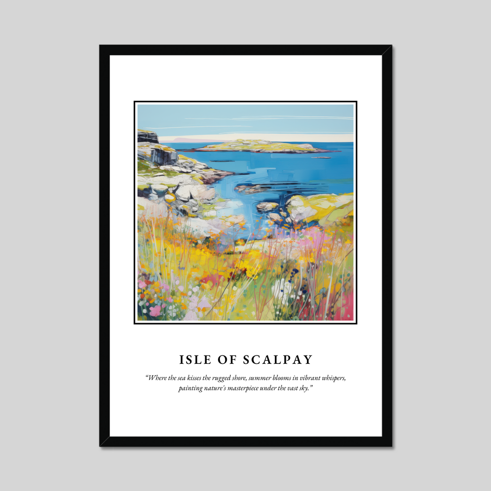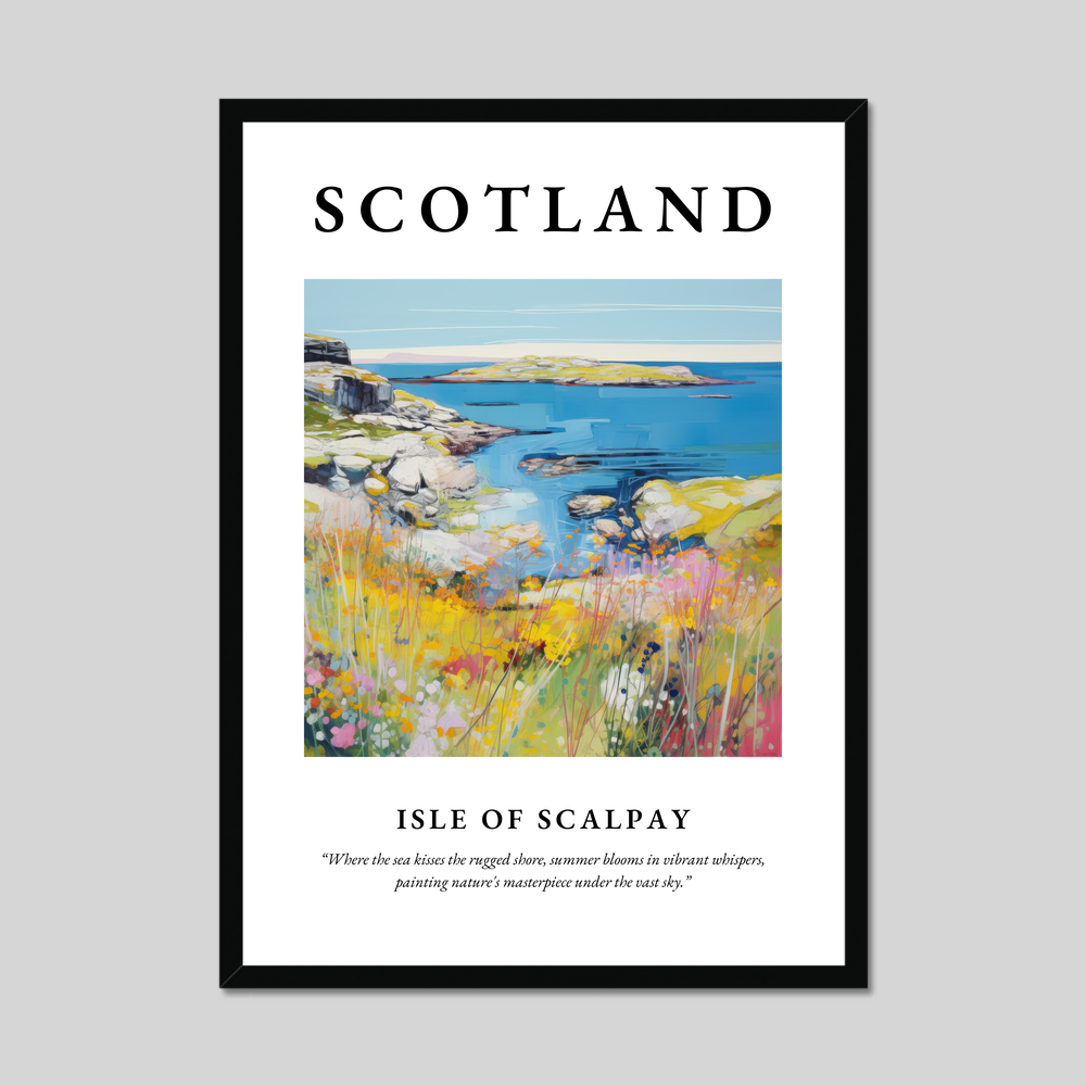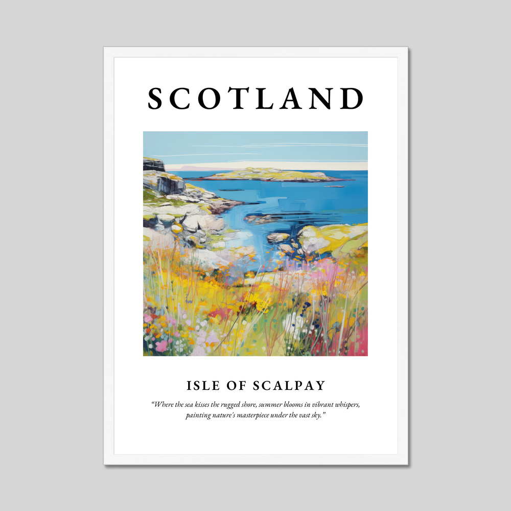 Discover the essence of the Scottish Isles with our stunning framed poster print, measuring an impressive 50cm x 70cm. This piece showcases the breathtaking Isle of Scalpay, beautifully rendered in a contemporary style that captures the vibrant hues and dynamic textures of a summer paradise. The bold “SCOTLAND” at the top commands attention, while the evocative quote beneath the artwork invites the viewer into a world where "the sea kisses the rugged shore, summer blooms in vibrant whispers, painting nature's masterpiece under the vast sky."