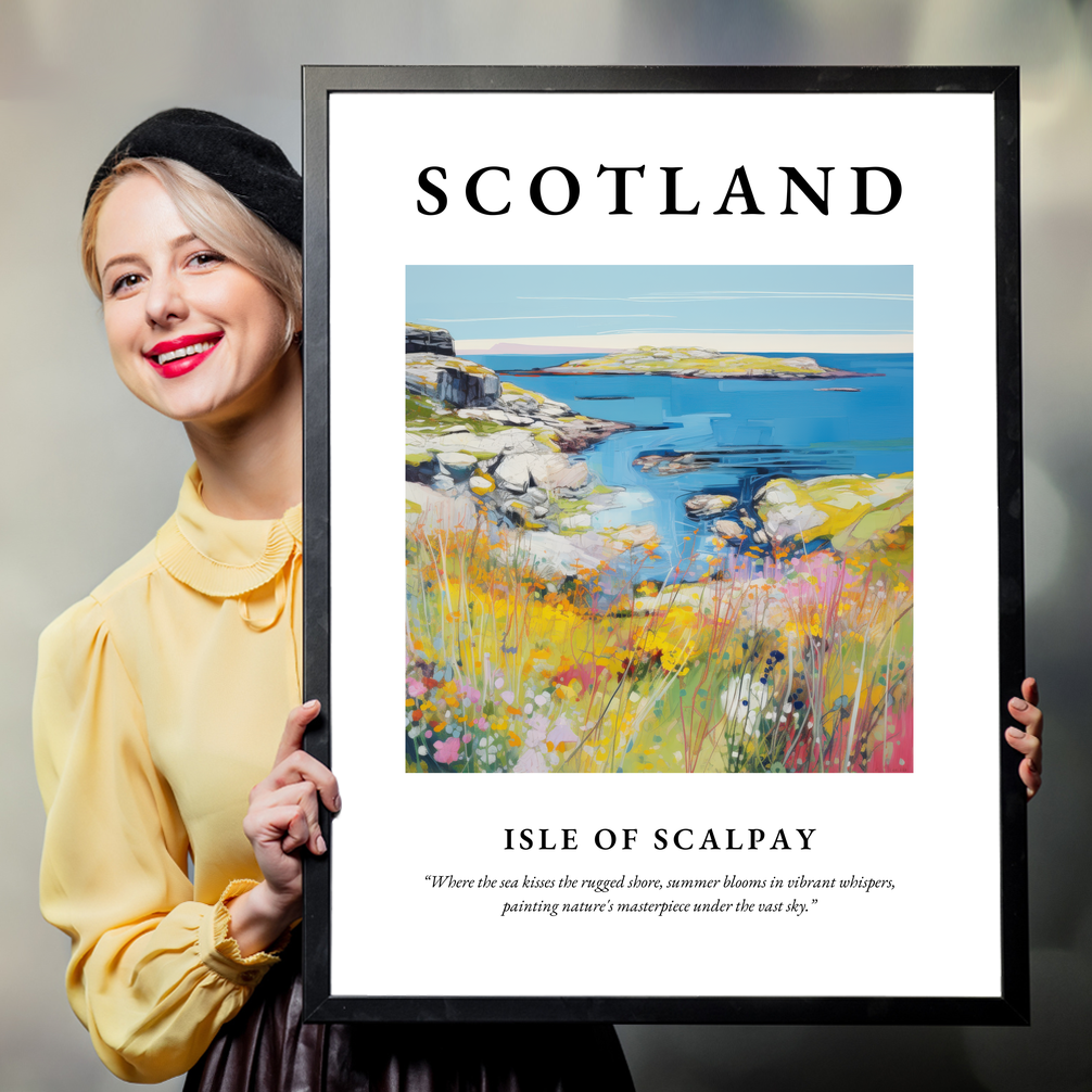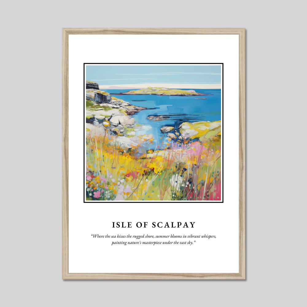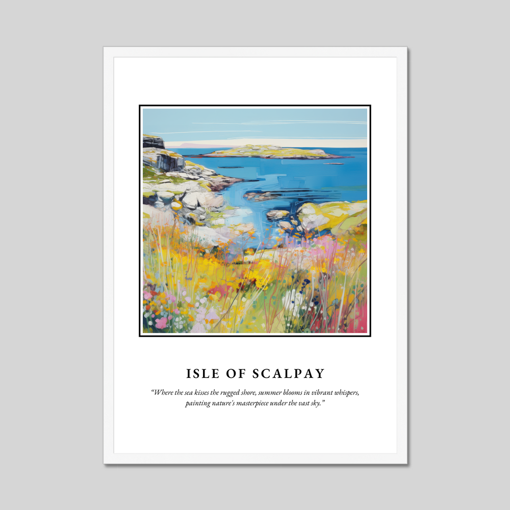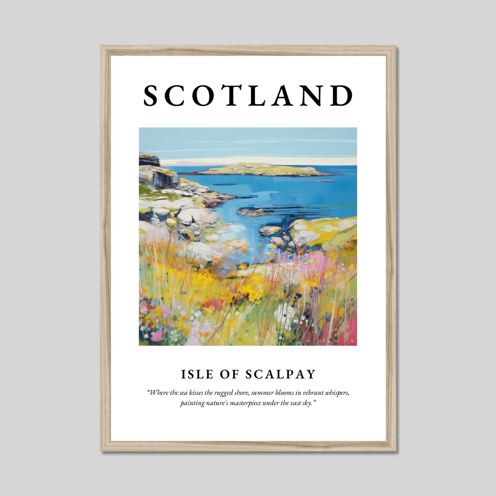 Discover the essence of the Scottish Isles with our stunning framed poster print, measuring an impressive 50cm x 70cm. This piece showcases the breathtaking Isle of Scalpay, beautifully rendered in a contemporary style that captures the vibrant hues and dynamic textures of a summer paradise. The bold “SCOTLAND” at the top commands attention, while the evocative quote beneath the artwork invites the viewer into a world where "the sea kisses the rugged shore, summer blooms in vibrant whispers, painting nature's masterpiece under the vast sky."