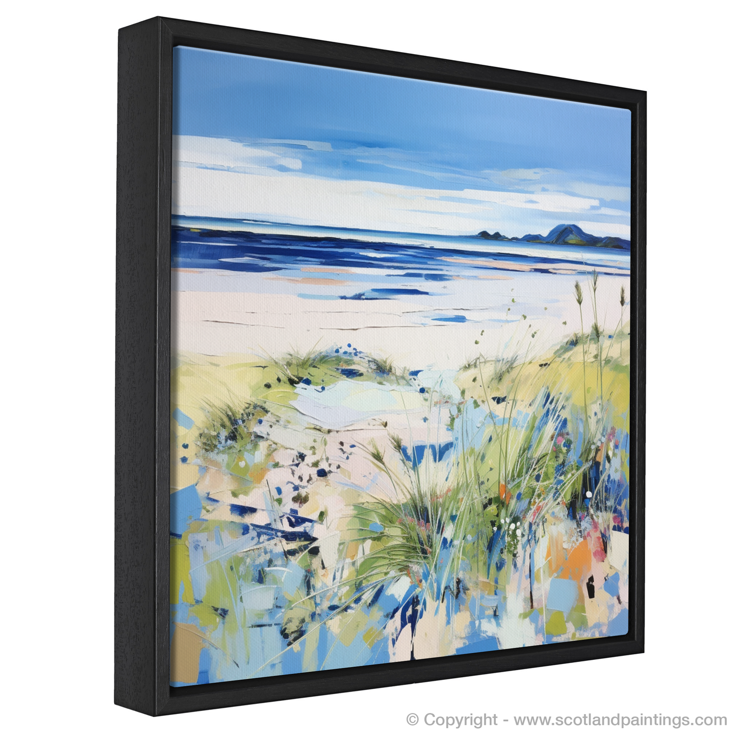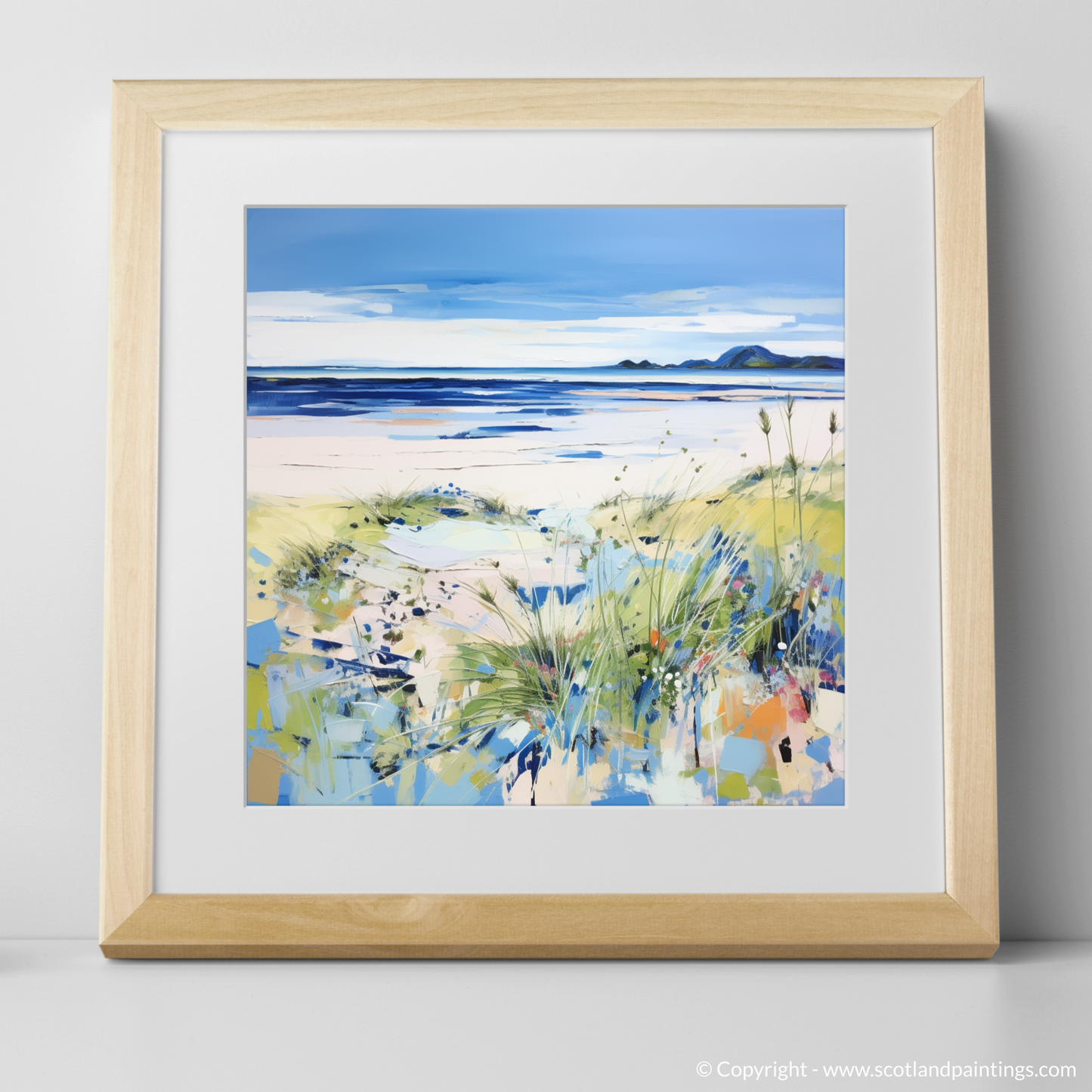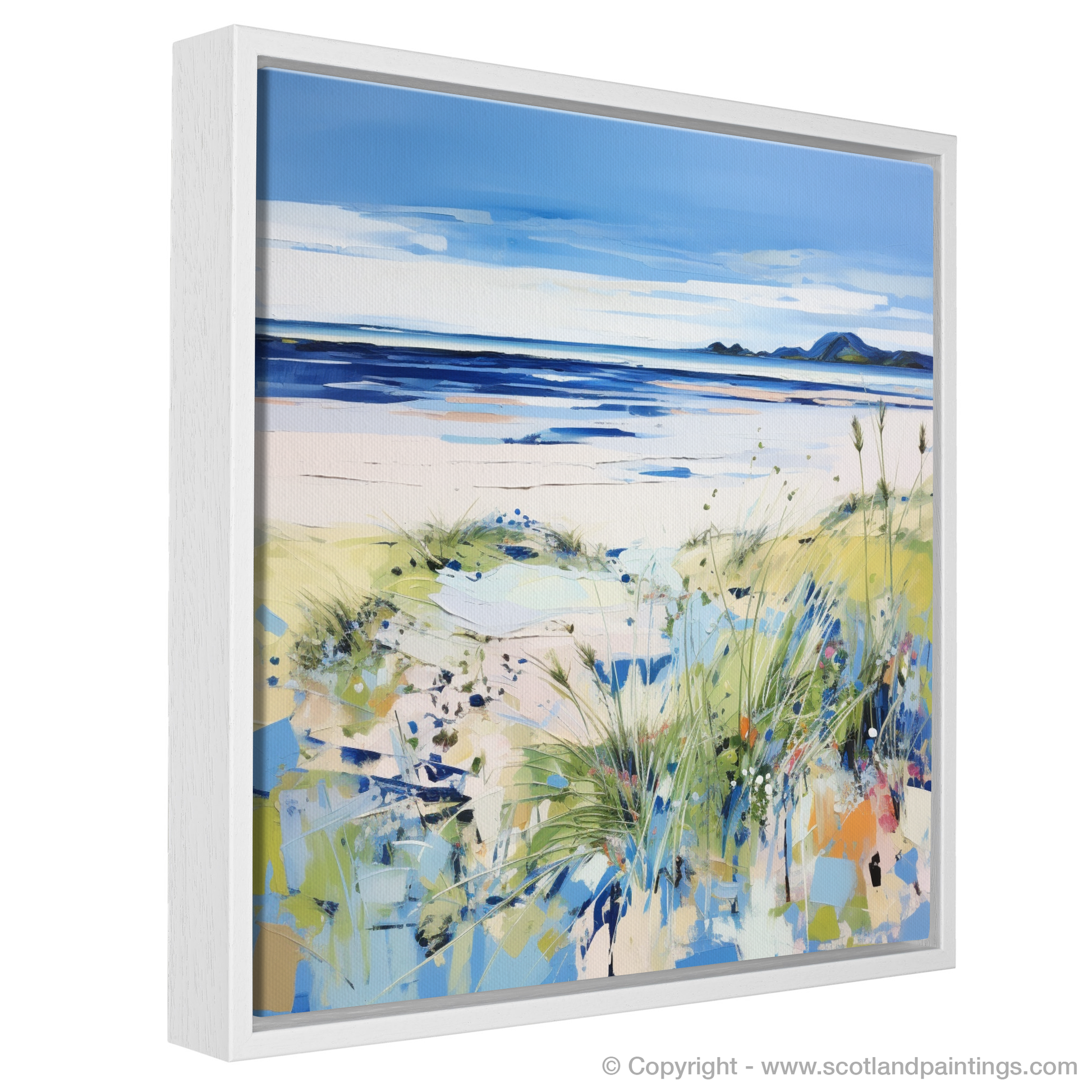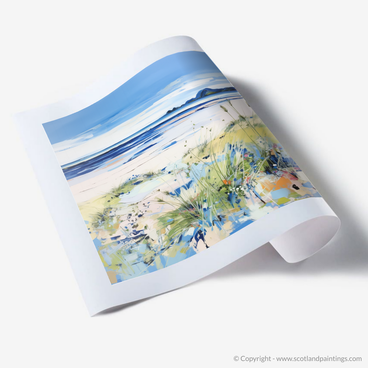 Capture the essence of a Scottish summer with this vibrant contemporary print, showcasing the serene beauty of Longniddry Beach in East Lothian. The artwork presents an idyllic coastal scene where land meets sea under a spacious sky, suffused with soft summer light. A dynamic foreground of lush, textured grasses adds depth and interest, painted in lively strokes of green with flecks of wildflowers adding pops of colour. The middle ground reveals a stretch of pristine sand, its warm tones gently transitioning into the cool blues and purples of shallow waters, inviting the viewer to wade in. In the distance, the tranquil sea mirrors the sky with deeper shades of blue, while the horizon is graced by the subtle outlines of rolling hills, defining the tranquil landscape. The expansive sky, painted in broad, expressive strokes of blue and white, crowns the composition, suggesting the boundless possibilities of a day at the beach. This print is a celebration of Scottish summers, evoking the peaceful and invigorating atmosphere of Longniddry's cherished seaside.