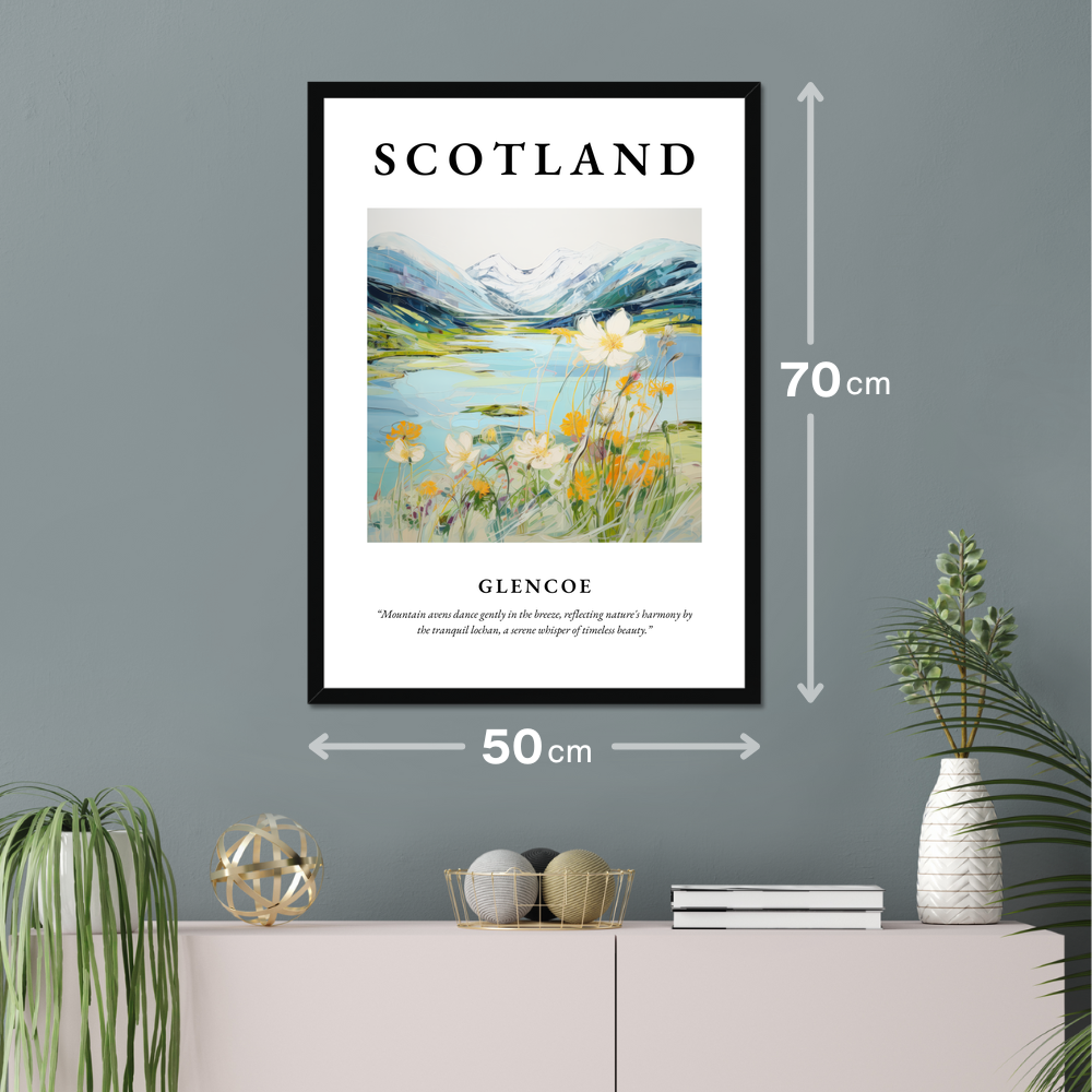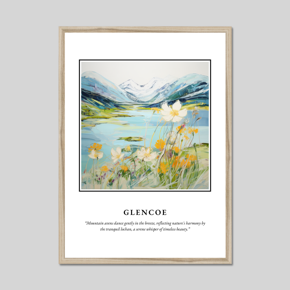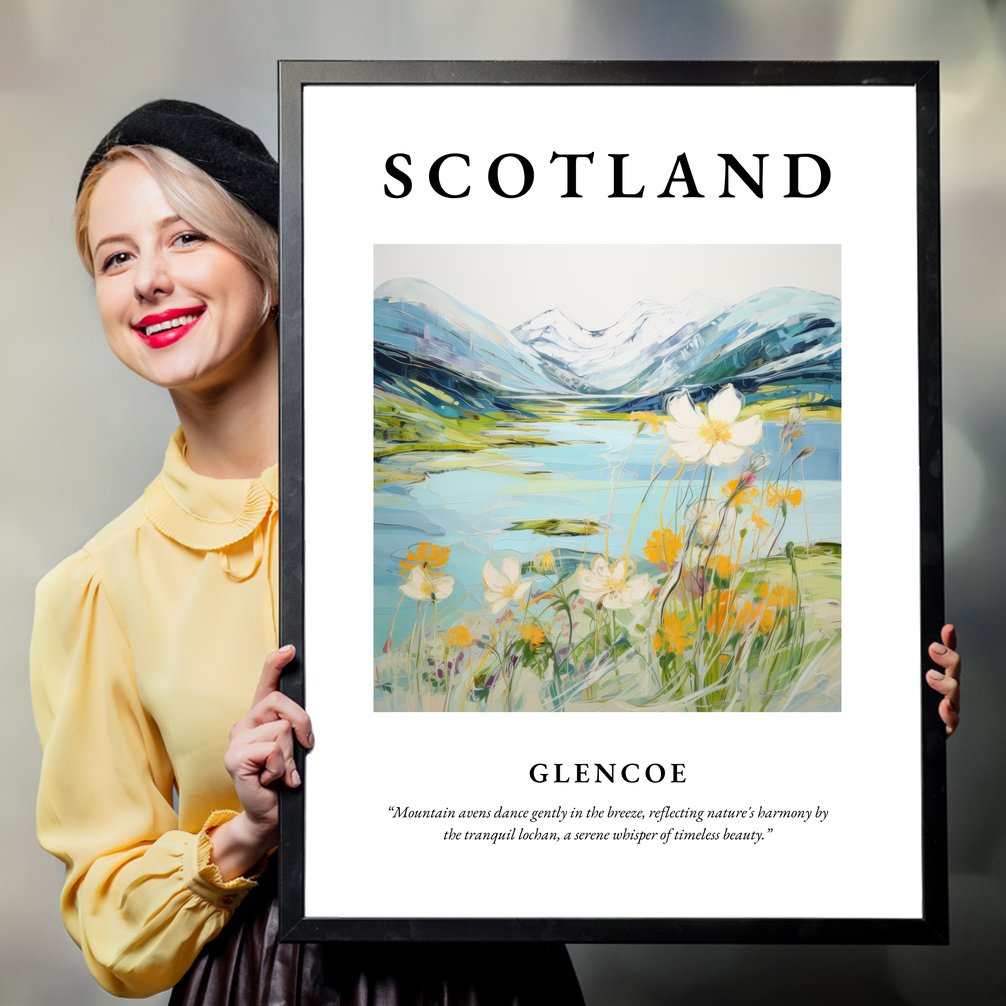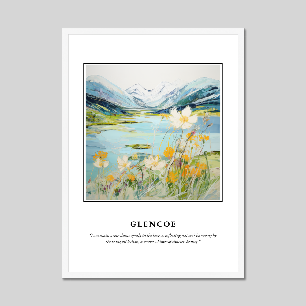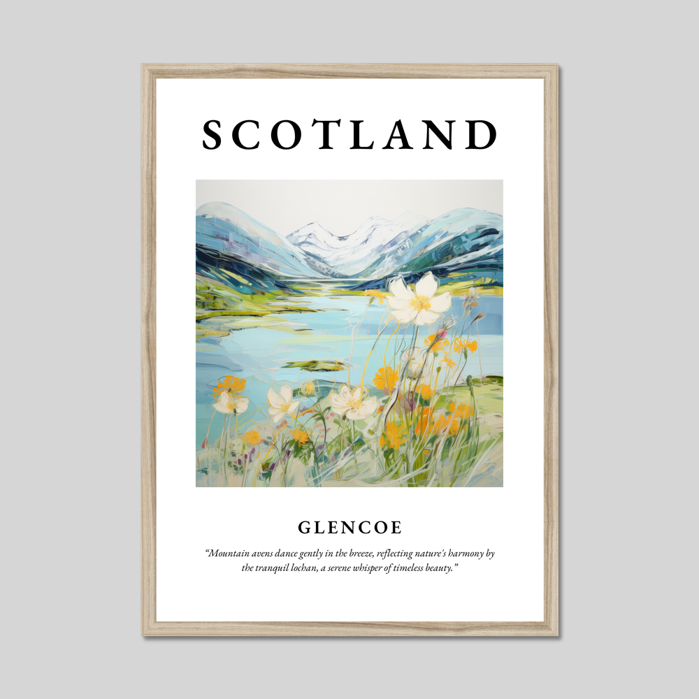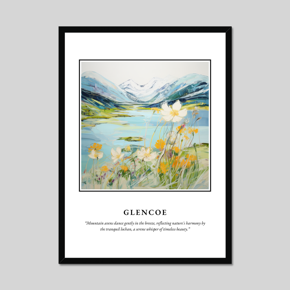 Available in your choice of a sleek black, crisp white, or natural wood-effect frame, this piece offers versatility to complement any décor. The top of the poster boldly features the word "SCOTLAND," drawing the eye to the mesmerising painting of Glencoe. Embodying the "Contemporary" style, the painting is a vibrant dance of colour and emotion, capturing the essence of this iconic landscape. Beneath the striking scene, the quote “Mountain avens dance gently in the breeze, reflecting nature's harmony by the tranquil lochan, a serene whisper of timeless beauty,” invites you to immerse yourself in the serene atmosphere.