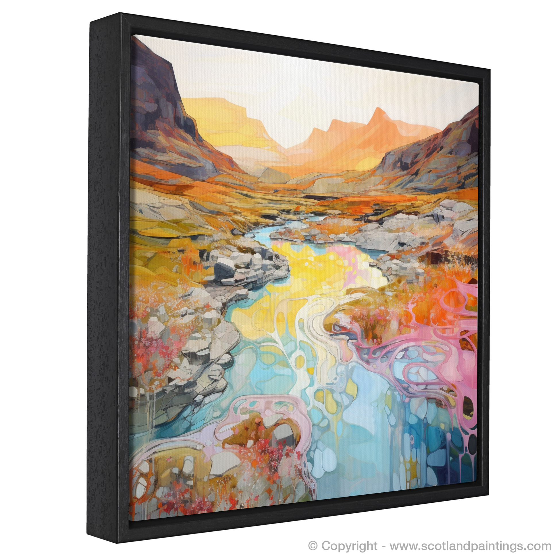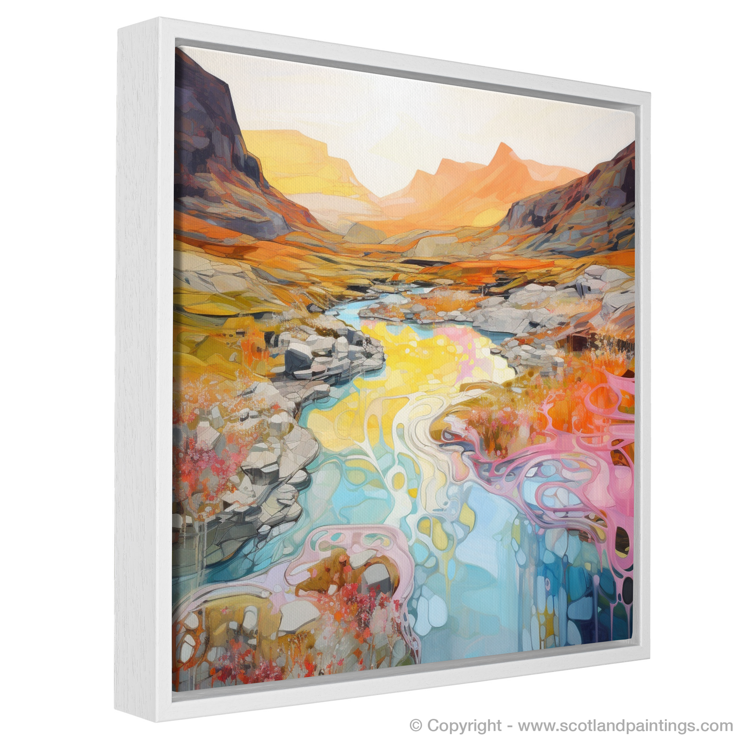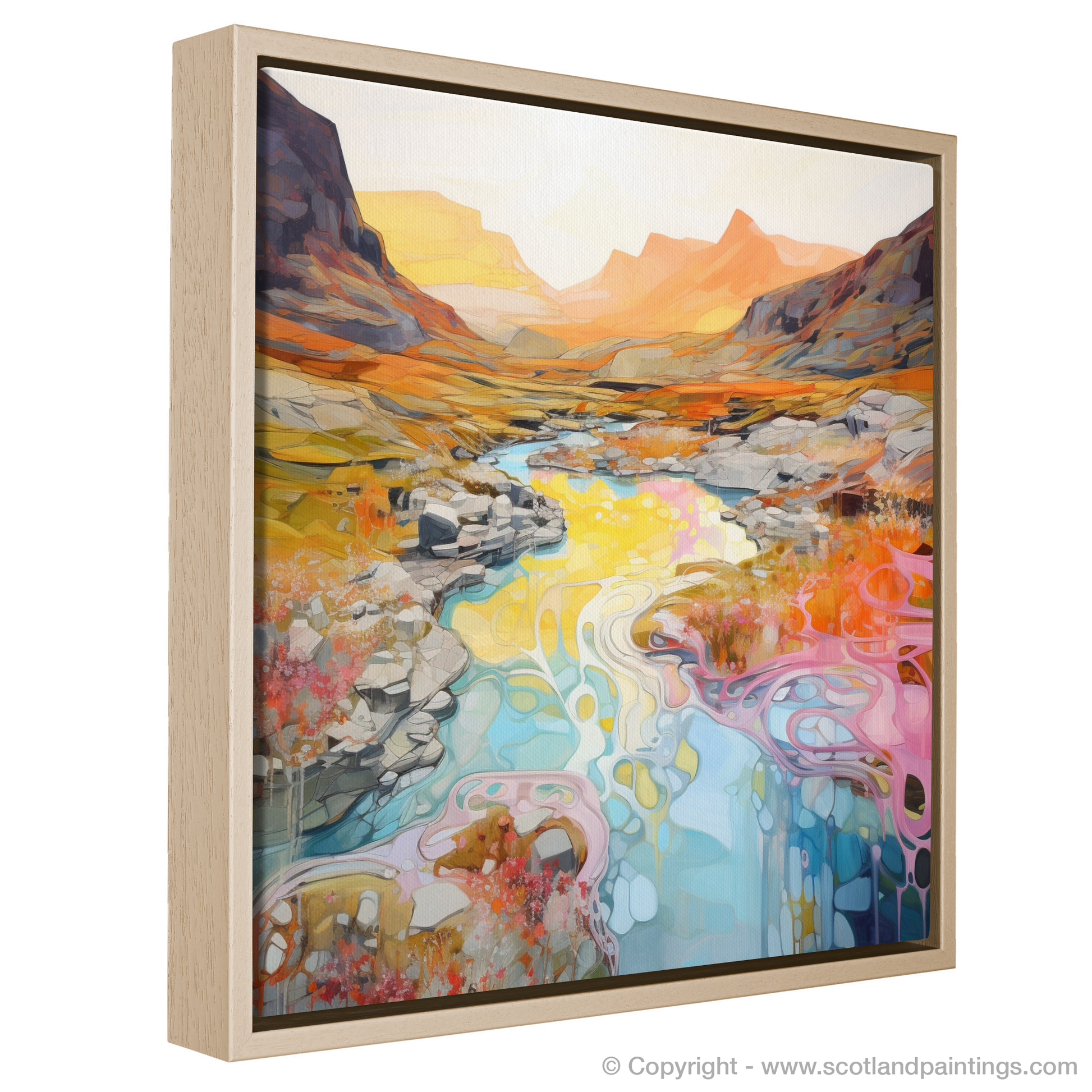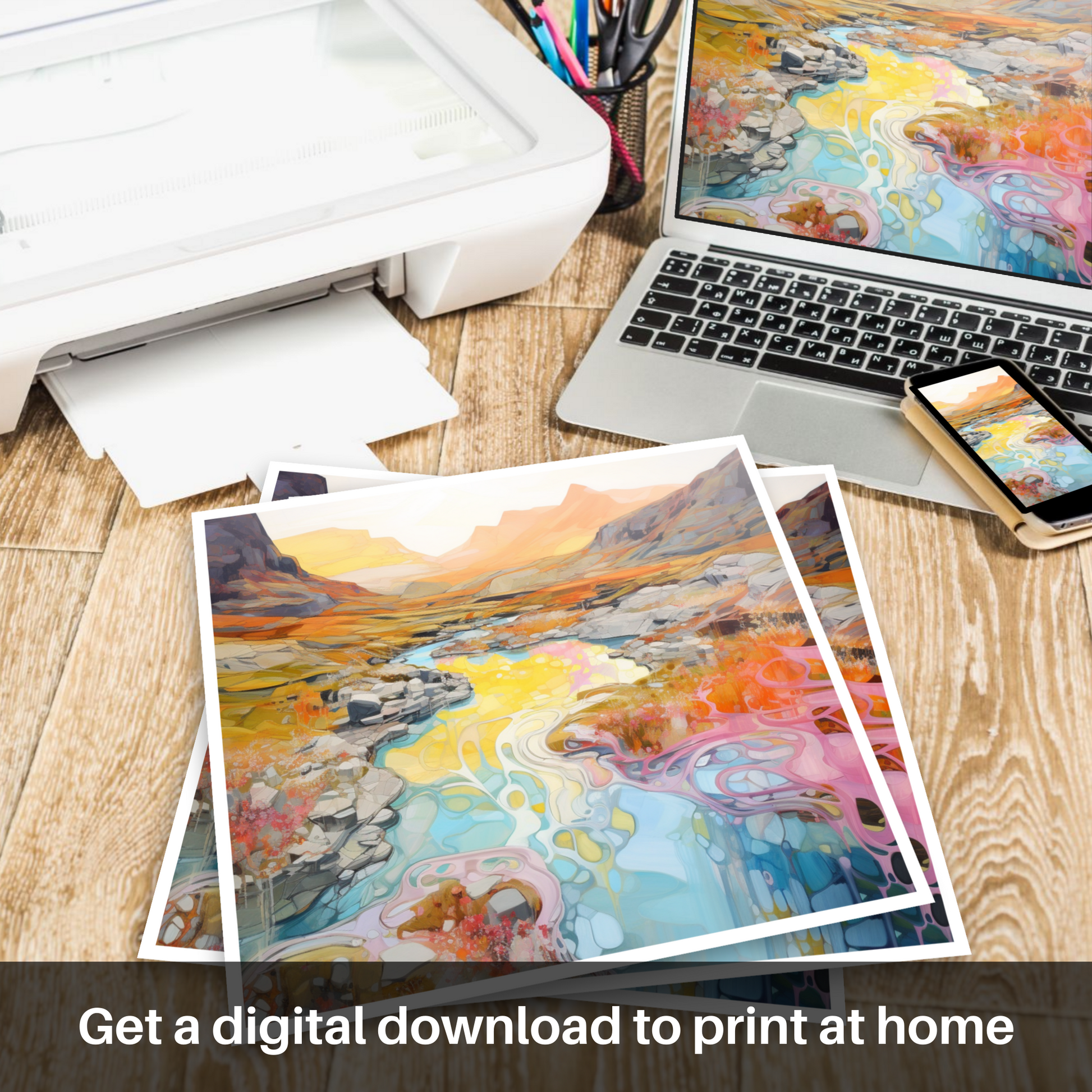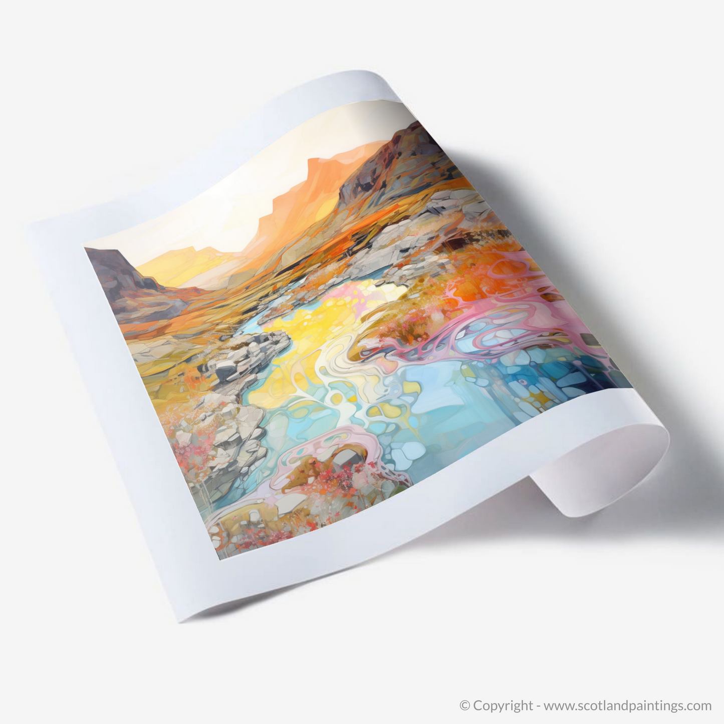This exquisite piece captures the breathtaking beauty of the Fairy Pools located on the Isle of Skye, illuminated by the warm glow of the golden hour. The vivid colours in the composition evoke the reflective serenity of the pools, with their crystal-clear waters that mirror the radiant summer sky. The vibrant hues are a testament to the allure of summer in Scotland, as rich orange tones dance across the rugged landscape, blending seamlessly with cool blues and soft lavenders.