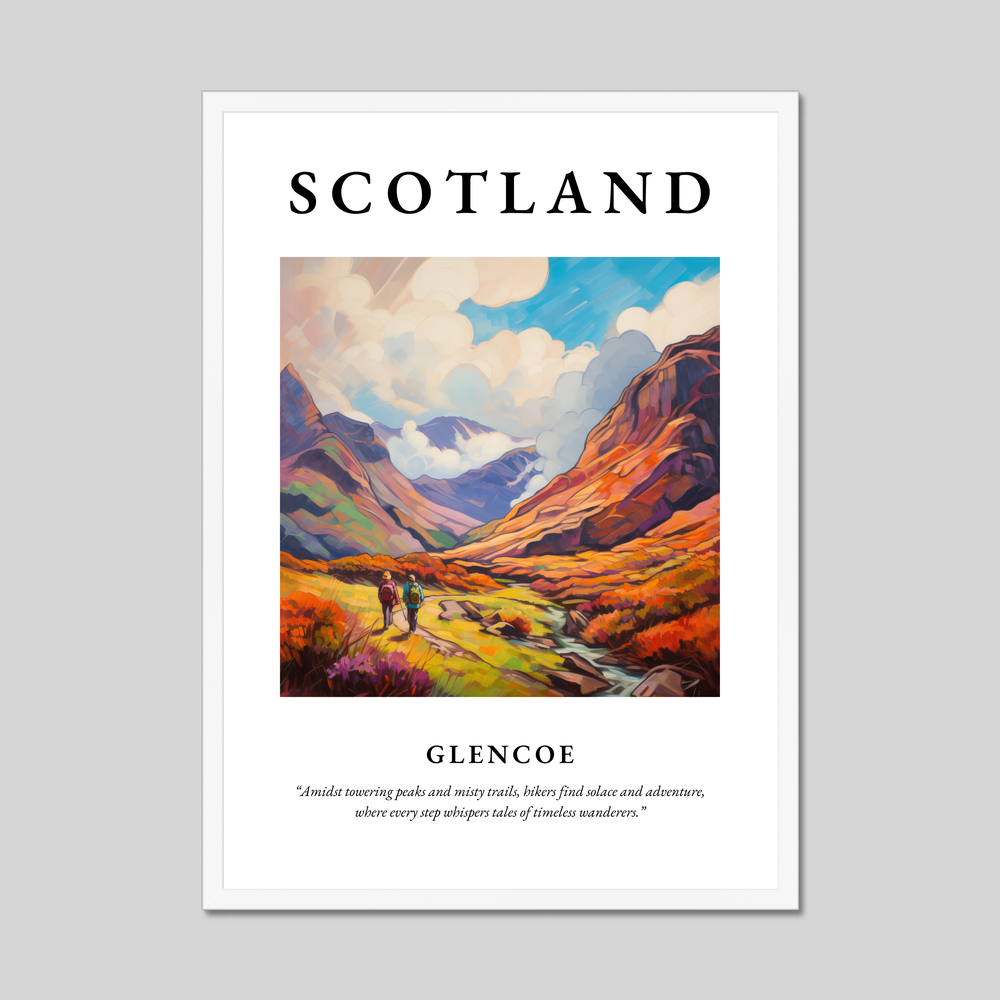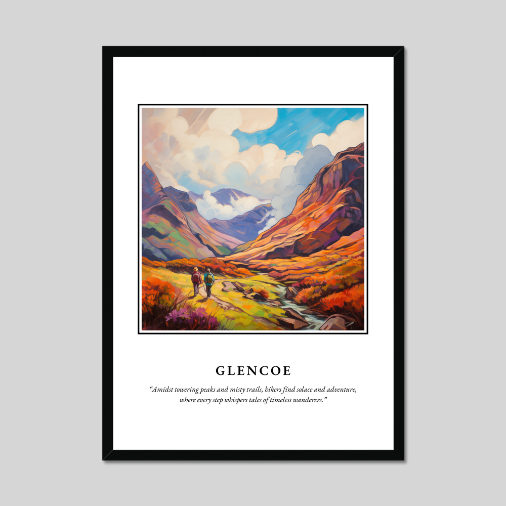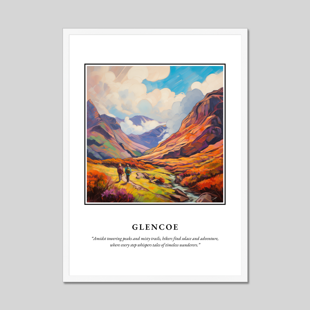 At the heart of this exquisite poster is a vivid Impressionist painting that captures the rugged yet enchanting allure of Glencoe. The canvas bursts with rich, swirling colours, suggesting movement and life as hikers traverse the vibrant landscape. This journey is further echoed in the eloquent quote accompanying the artwork: “Amidst towering peaks and misty trails, hikers find solace and adventure, where every step whispers tales of timeless wanderers.” It's a piece that not only decorates your space but invites a moment of contemplation and connection, perfect for anyone who cherishes art or has a sentimental tie to this iconic Scottish landmark.