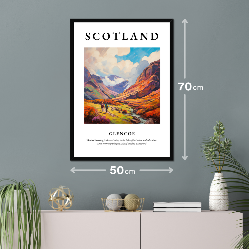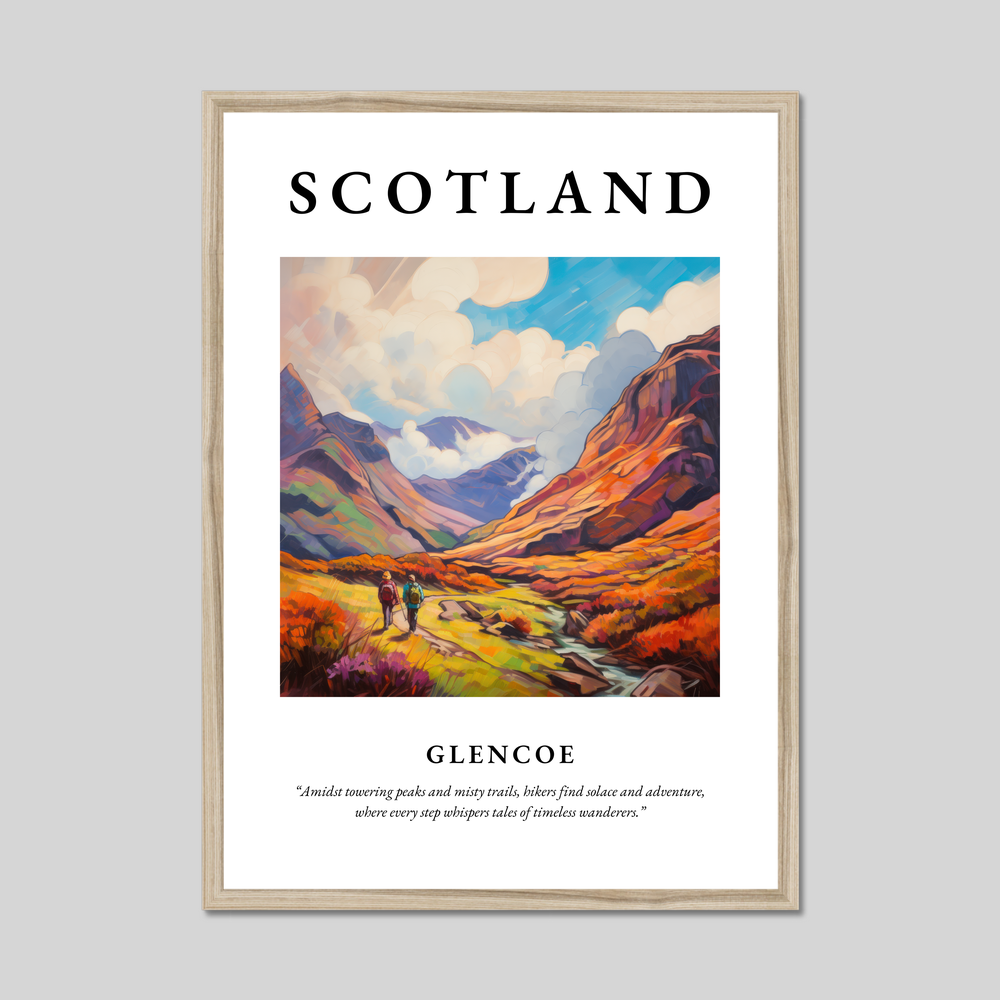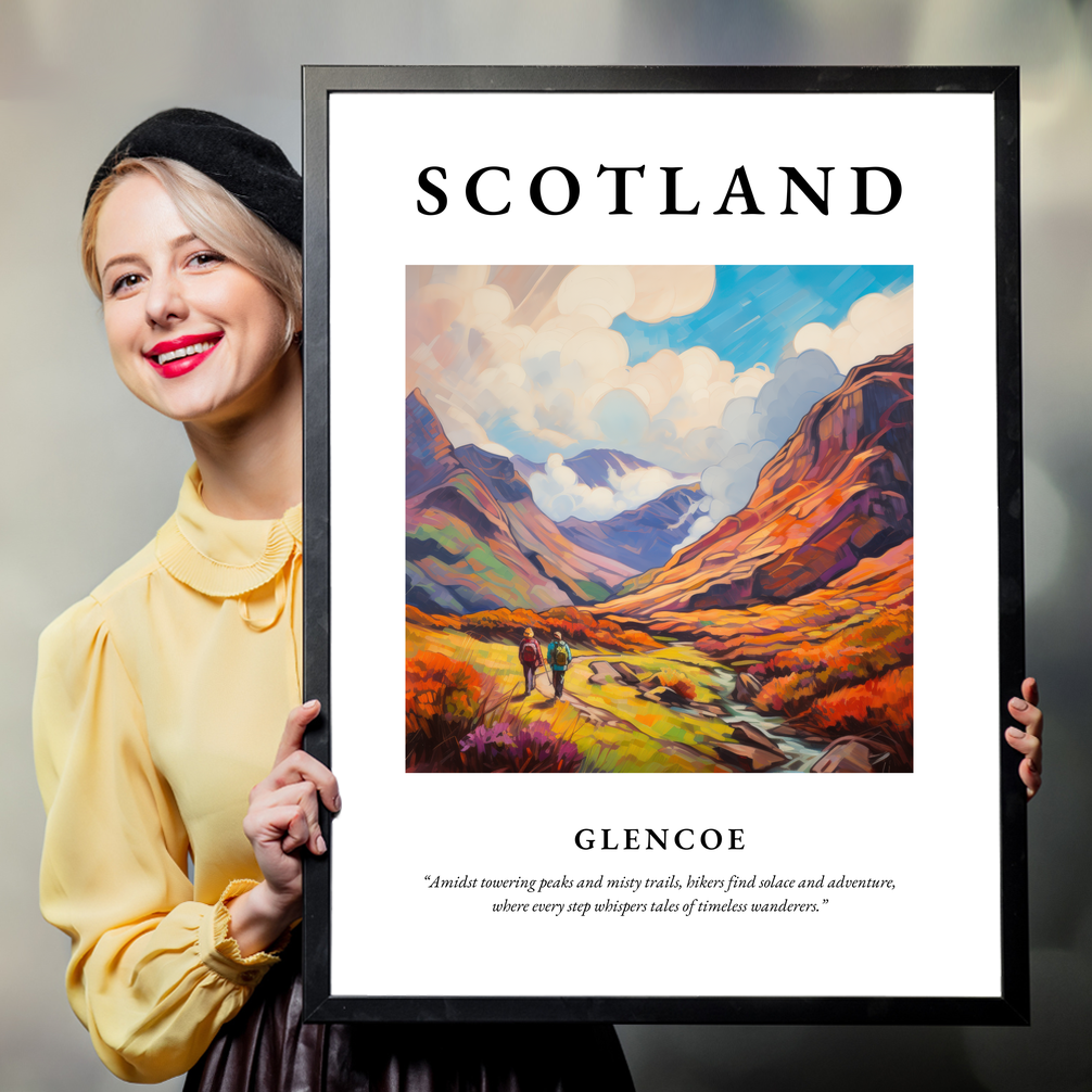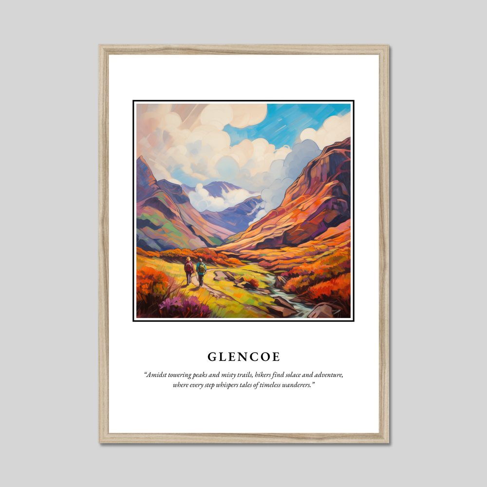 At the heart of this exquisite poster is a vivid Impressionist painting that captures the rugged yet enchanting allure of Glencoe. The canvas bursts with rich, swirling colours, suggesting movement and life as hikers traverse the vibrant landscape. This journey is further echoed in the eloquent quote accompanying the artwork: “Amidst towering peaks and misty trails, hikers find solace and adventure, where every step whispers tales of timeless wanderers.” It's a piece that not only decorates your space but invites a moment of contemplation and connection, perfect for anyone who cherishes art or has a sentimental tie to this iconic Scottish landmark.
