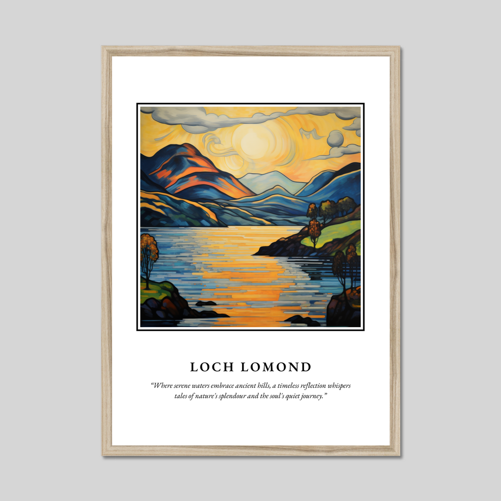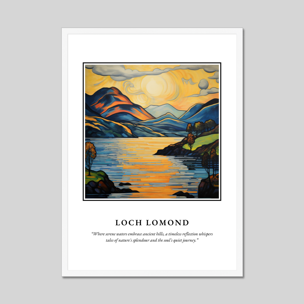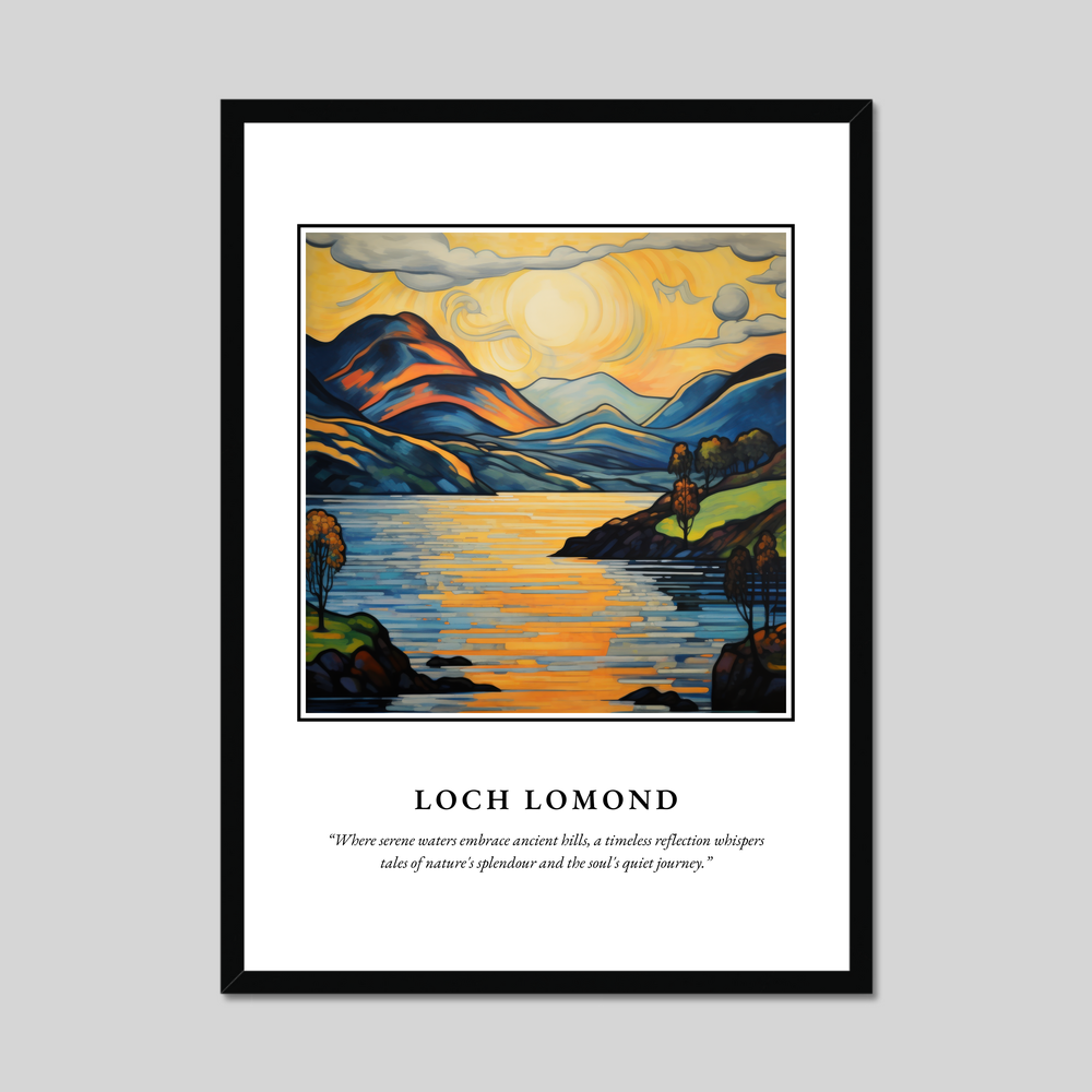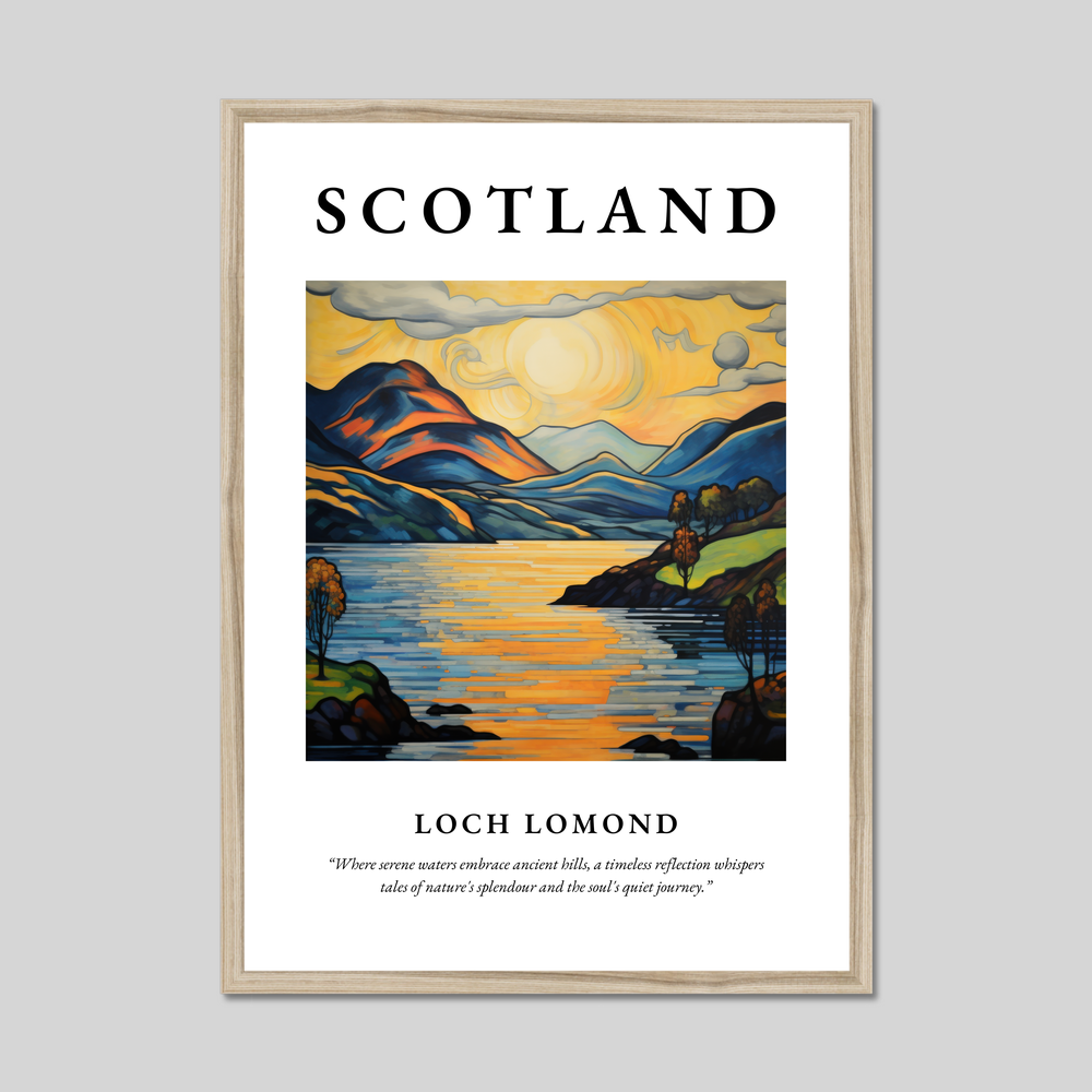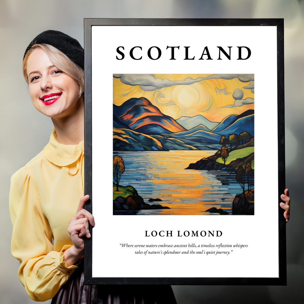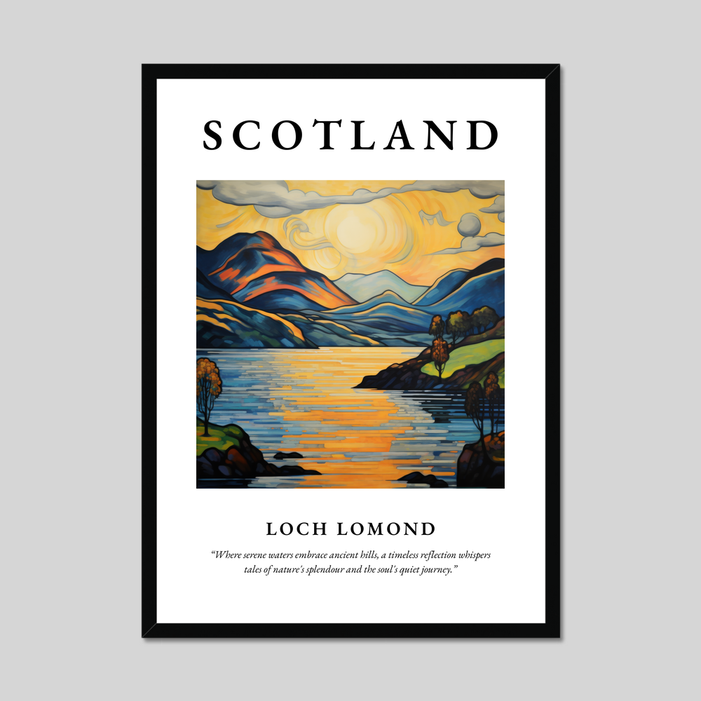 Available in three exquisite frame options—sleek black, classic white, or a natural wood-effect—this poster melds modern design with natural charm, enhancing any room it graces. At the top, bold lettering spells “SCOTLAND,” setting the stage for the enchanting scene below. The intricate Art Nouveau painting beautifully depicts Loch Lomond, where serene waters dance under the golden glow of sunlit hills, and lush trees stand in timeless reflection. Beneath, the evocative quote deftly whispers, “Where serene waters embrace ancient hills, a timeless reflection whispers tales of nature's splendour and the soul's quiet journey.”