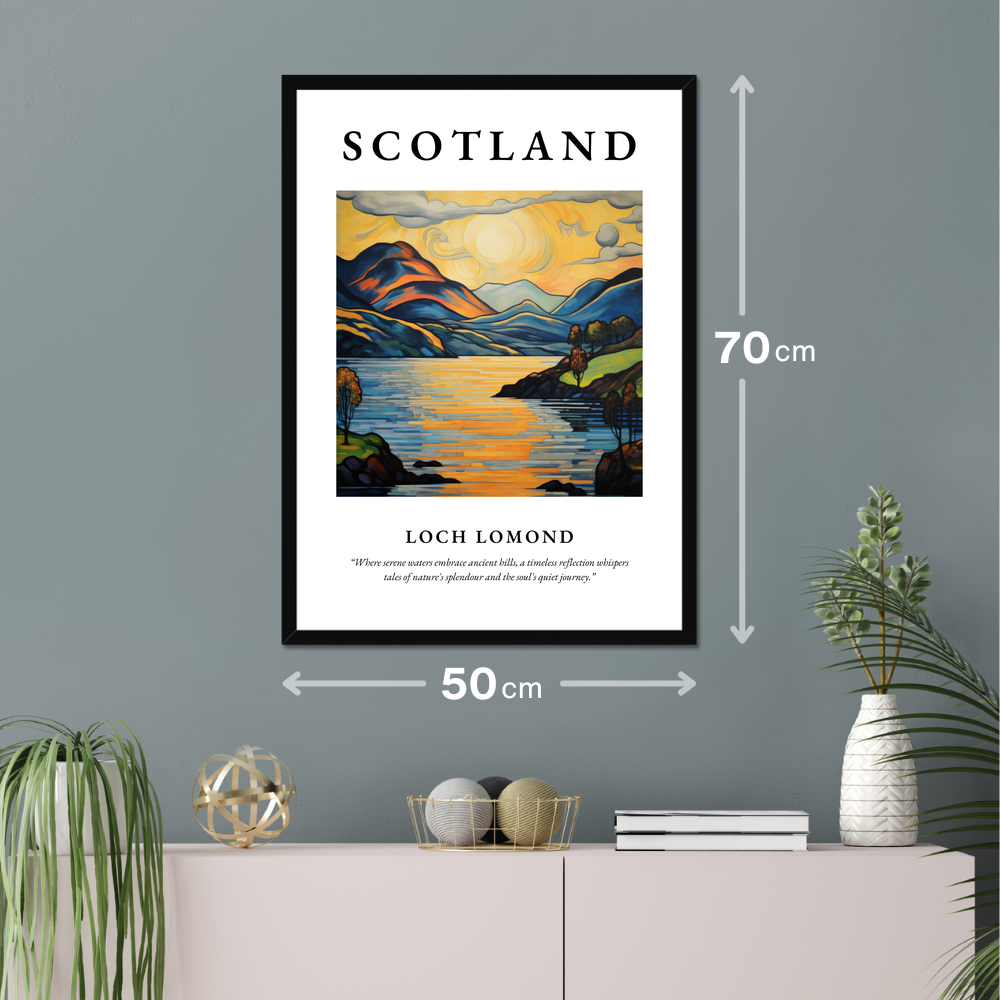 Transform your living space with this stunning, framed poster print from our “Scotland Favourites” collection, capturing the ethereal beauty of Loch Lomond in a captivating Art Nouveau style. Measuring a generous 50cm x 70cm, this piece is designed to make an impactful statement, elegantly covering a large wall area without the need for a hefty investment.