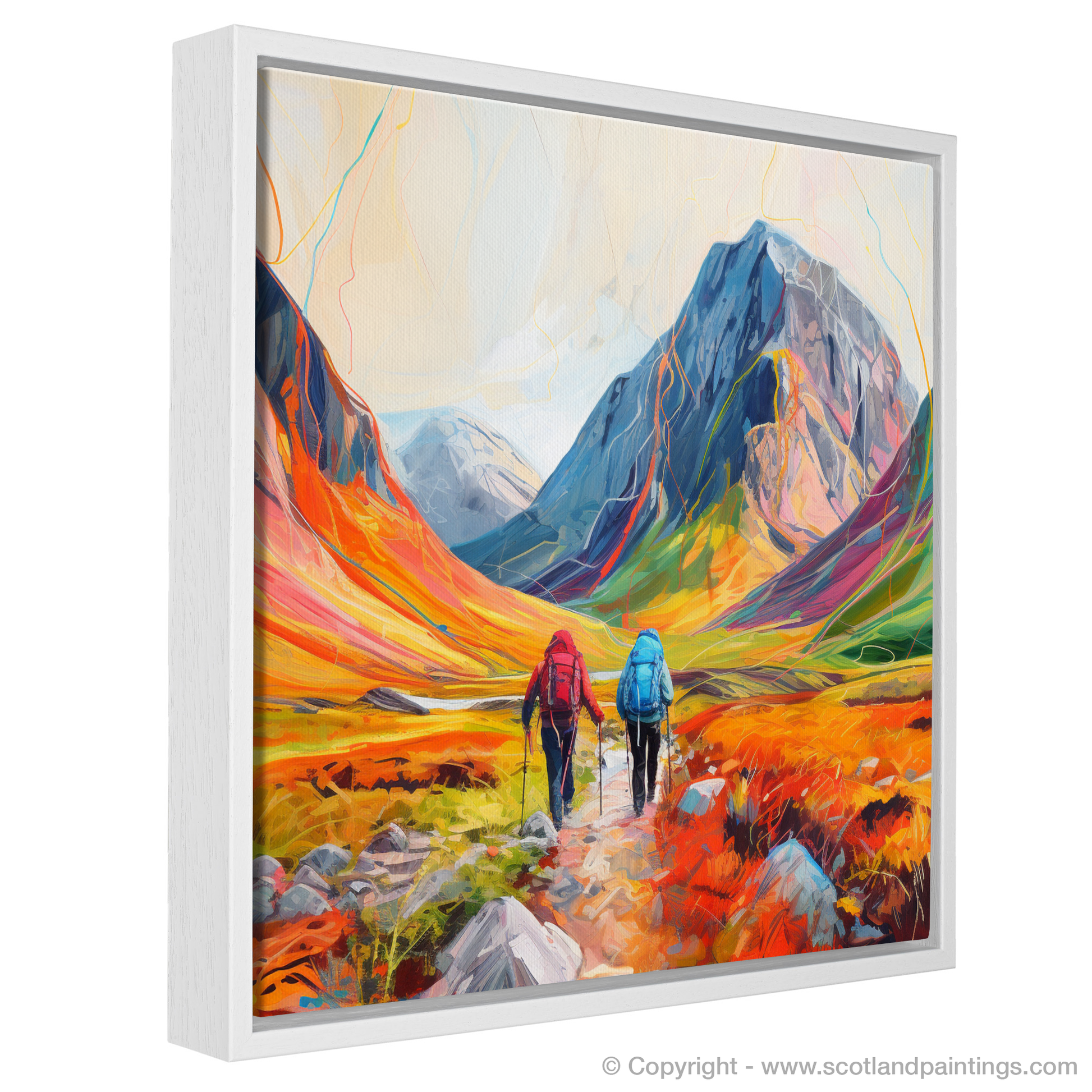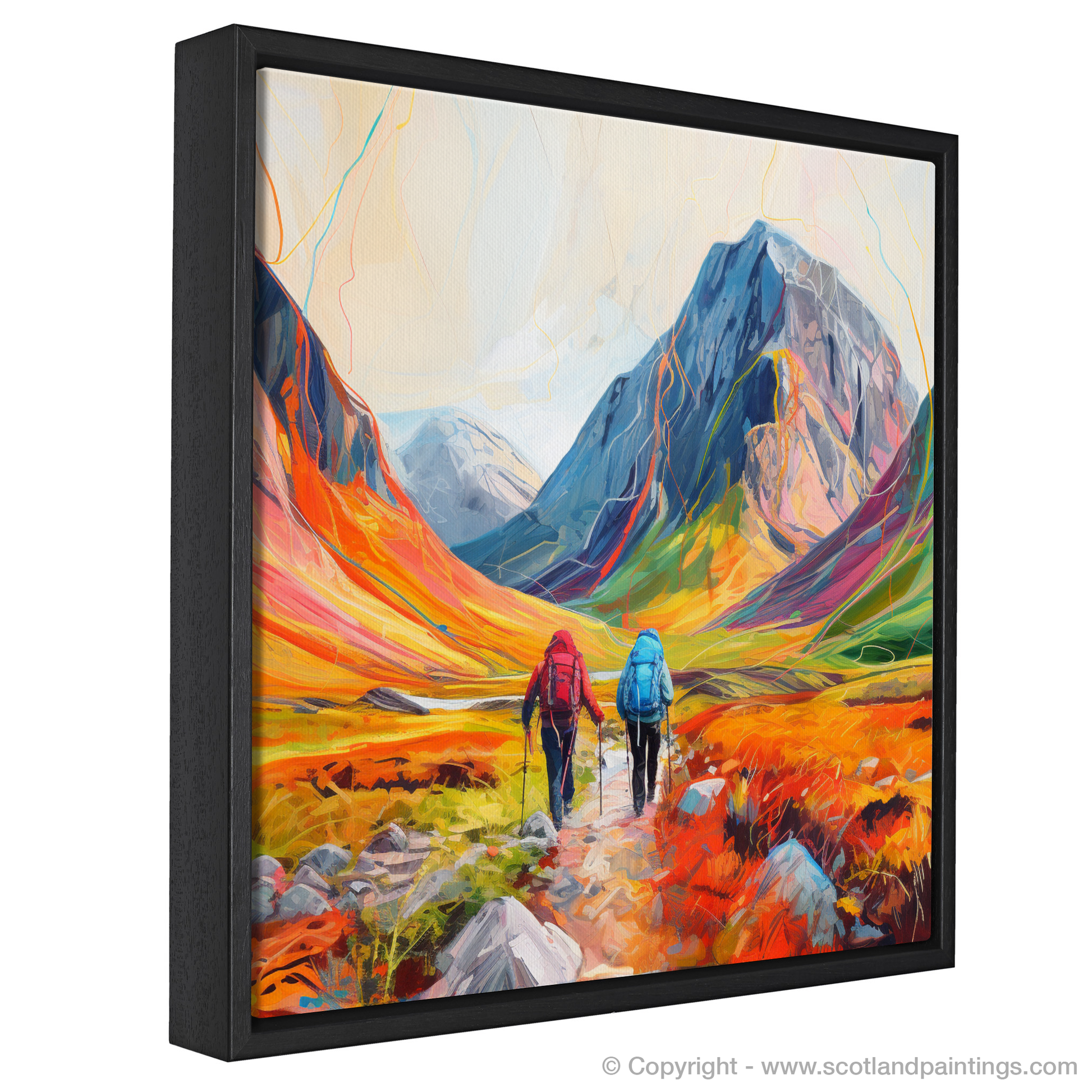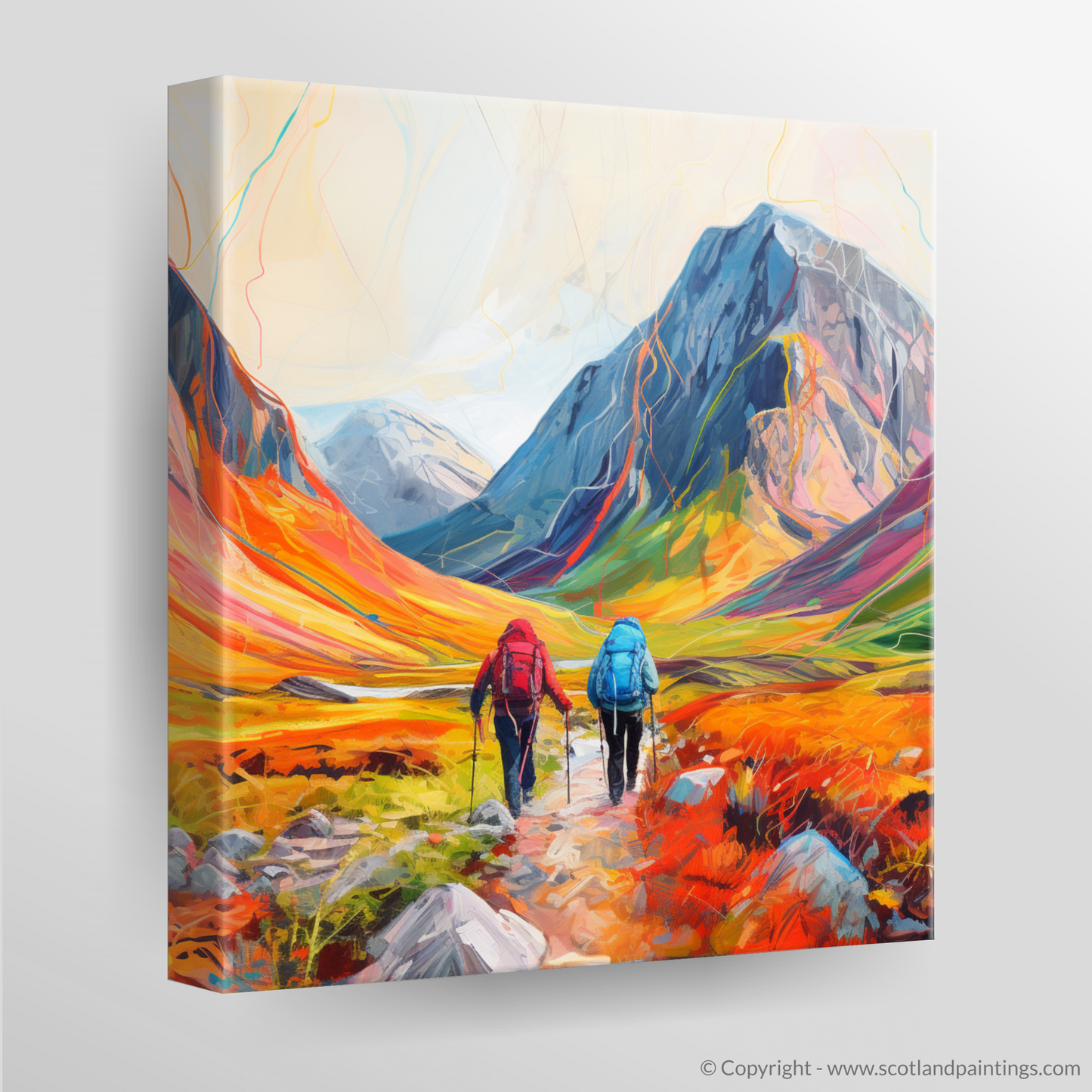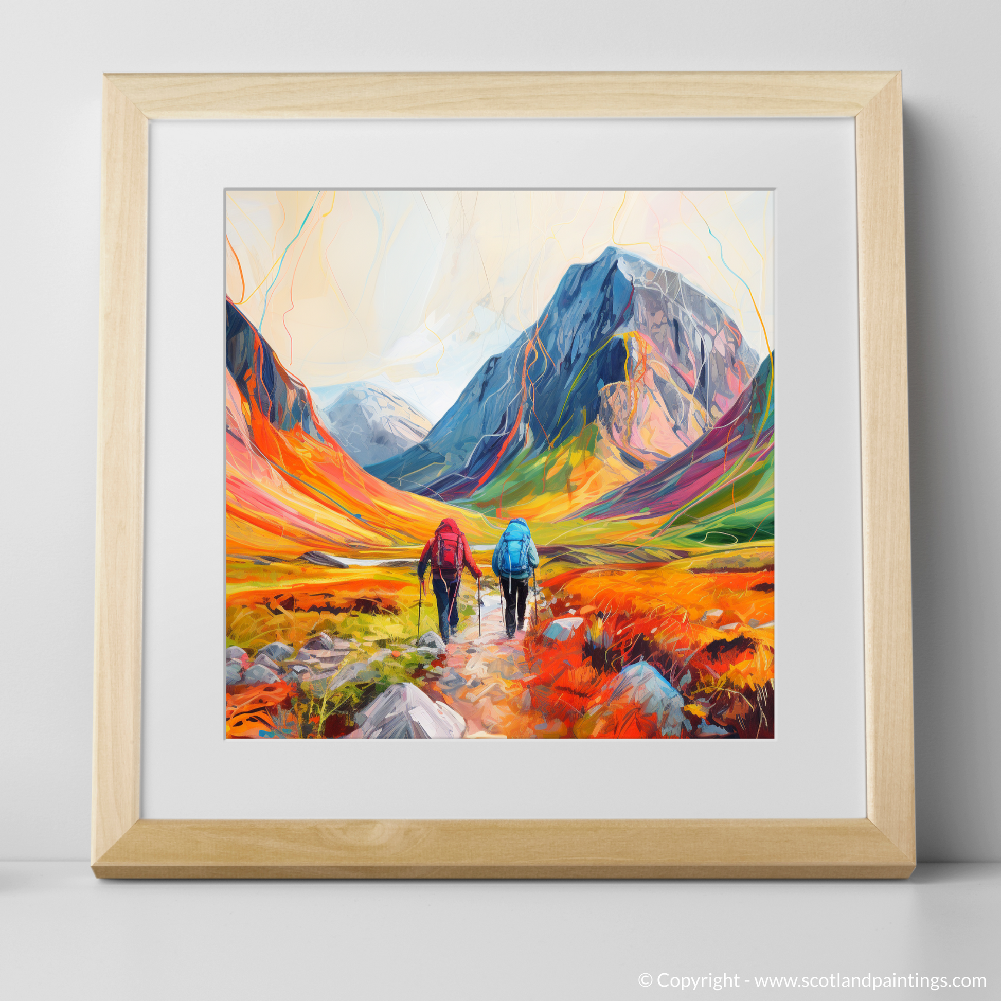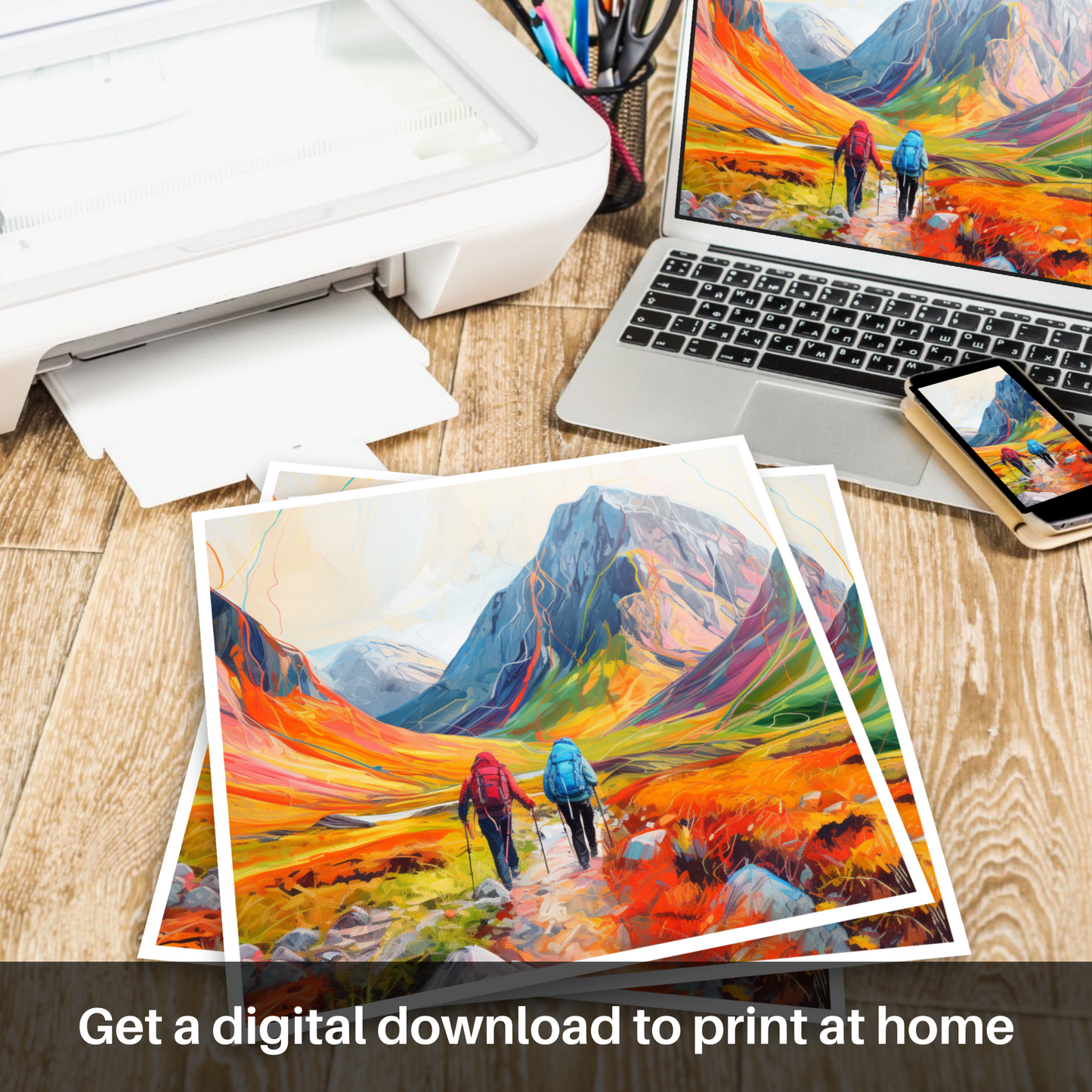 Immerse yourself in the vivid tapestry of the Scottish Highlands with this captivating print, alive with the spirit of adventure and the tranquillity of nature. The scene unfolds in the rugged heart of Glencoe, where two hikers embark on a journey framed by the majesty of soaring peaks and sweeping valleys. Evoking a sense of contemporary flair, the landscape is rendered with an expressive color palette that energises the soul.