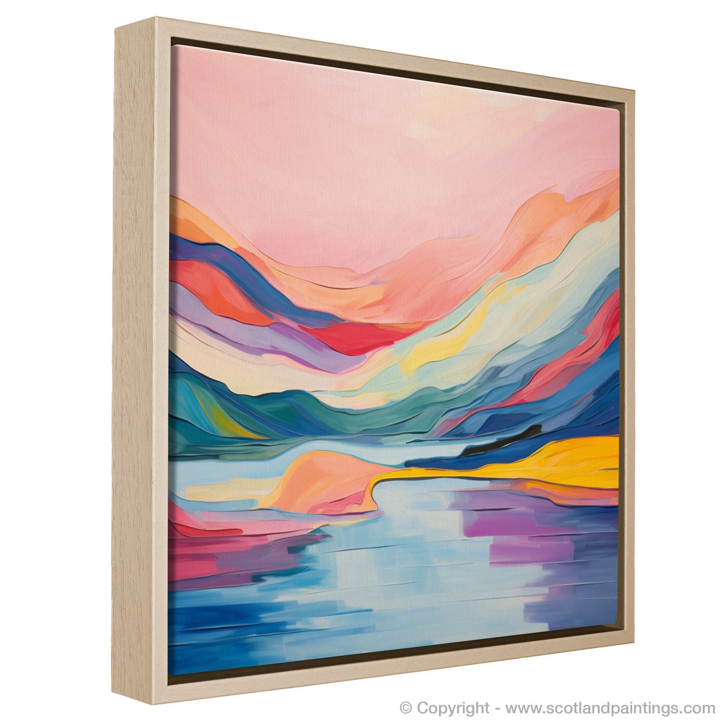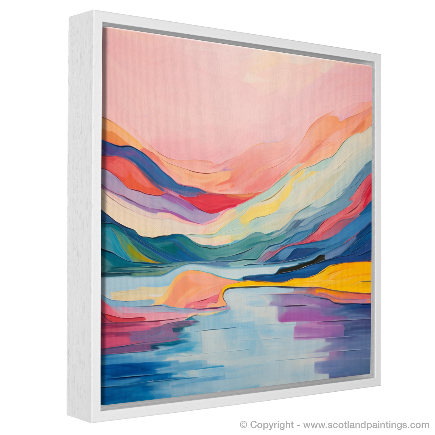 Vibrant strokes of cerulean and azure suggest the rippling surface of the loch, while blushes of pink and coral infuse the sky with a luminous glow reminiscent of a tranquil sunset. The mountains ripple with undulating shapes drenched in deep purples, fiery reds, and sunny yellows, meeting the mirrored water with a harmonious dance of reflection.