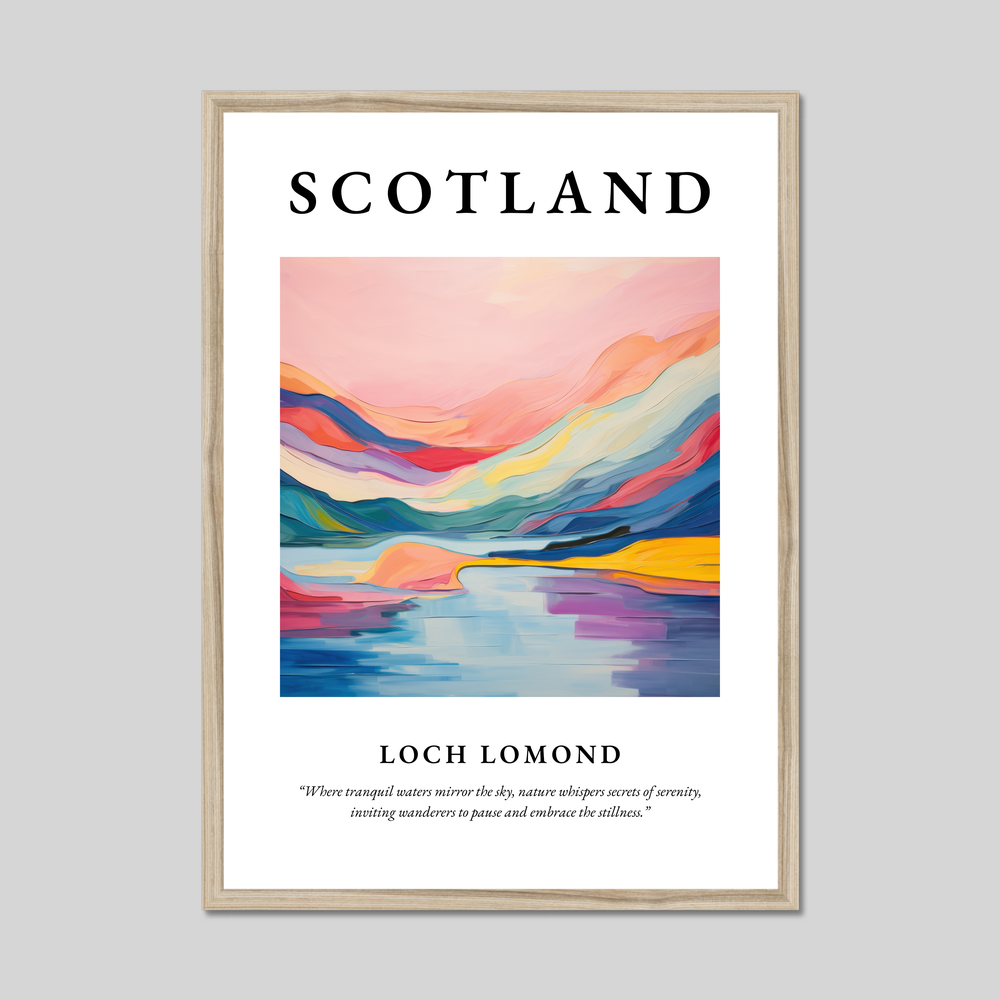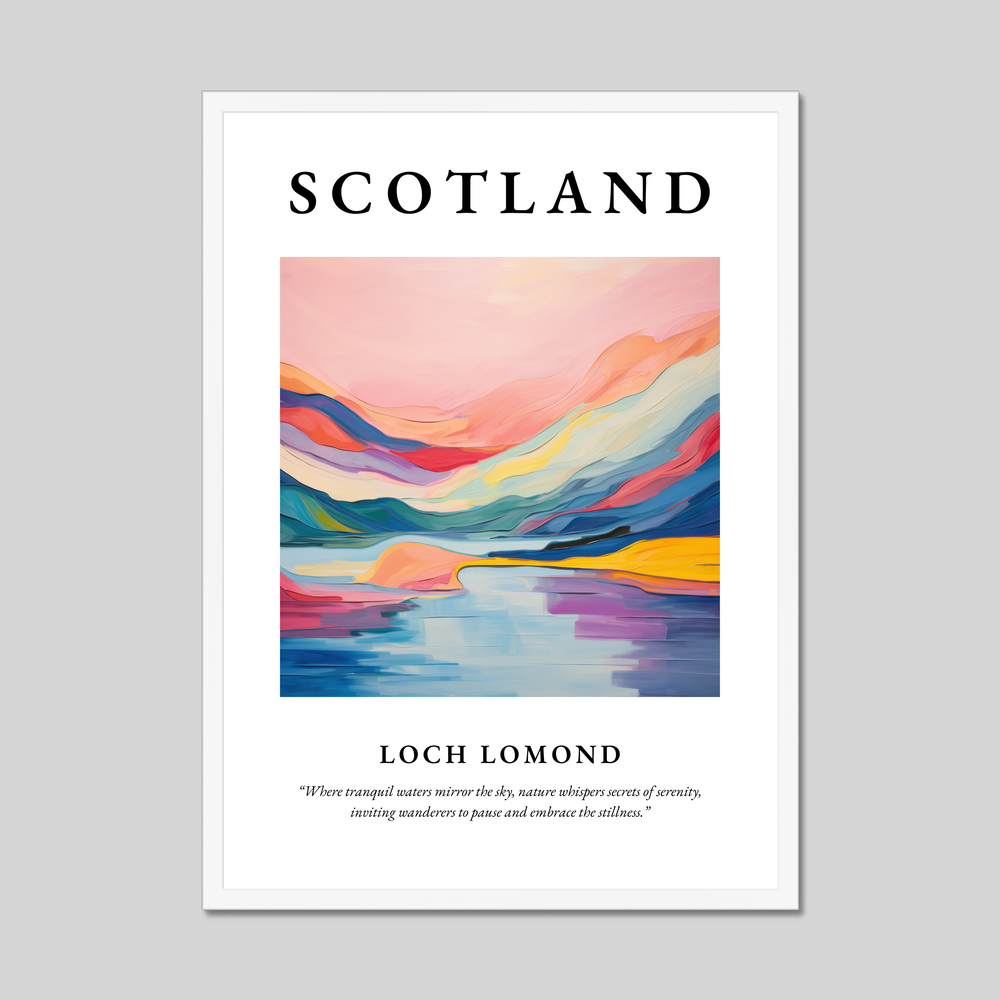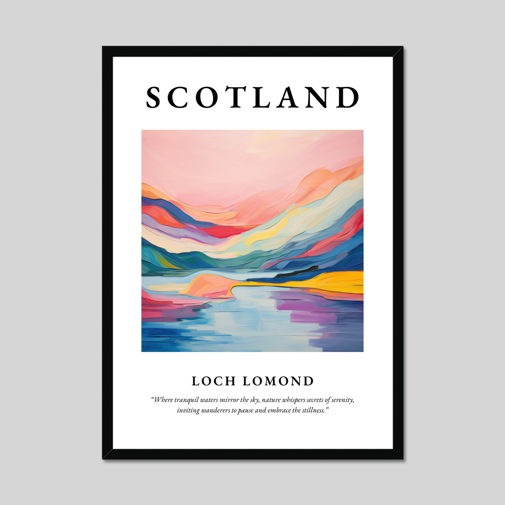 Discover the captivating charm of Scotland with our exquisitely framed poster print, perfect for adorning your walls and immersing yourself in the mystical allure of the Highlands. This stunning 50cm x 70cm piece showcases the word “SCOTLAND” boldly emblazoned at the top, drawing immediate attention to this majestic scene. Below, a breathtaking depiction of Loch Lomond unfolds in a mesmerising “Color Field” style, with sweeping bands of vibrant hues invoking the tranquil harmony of the landscape. Beneath the painting, the evocative quote, “Where tranquil waters mirror the sky, nature whispers secrets of serenity, inviting wanderers to pause and embrace the stillness,” invites reflection and serenity.