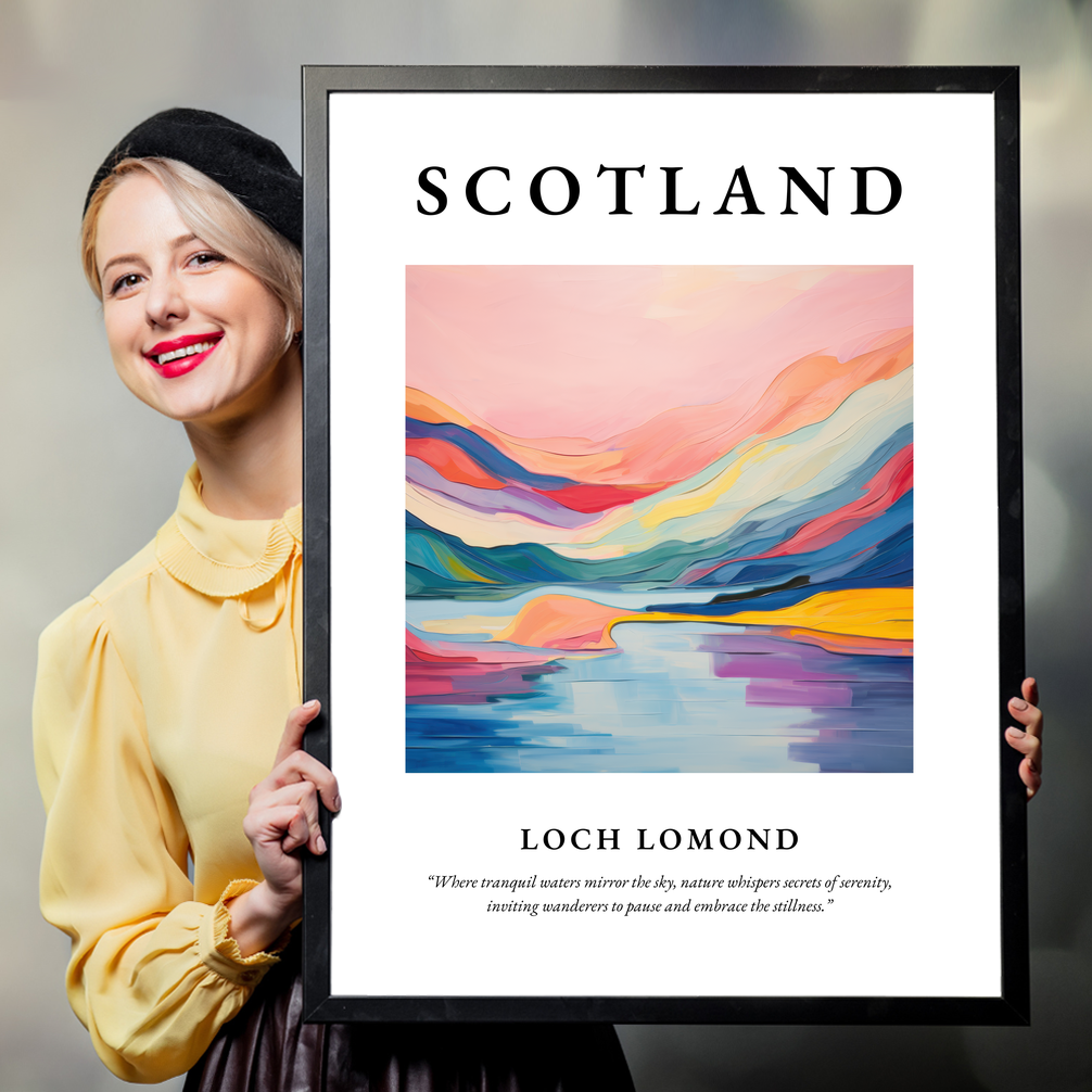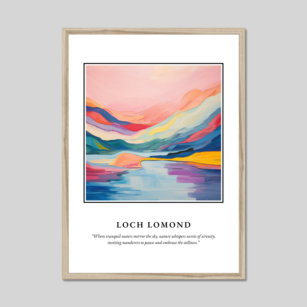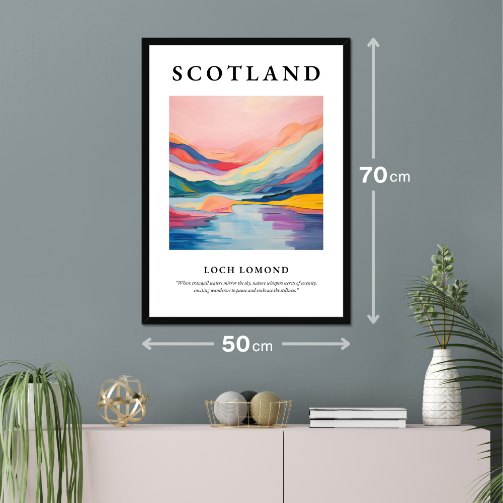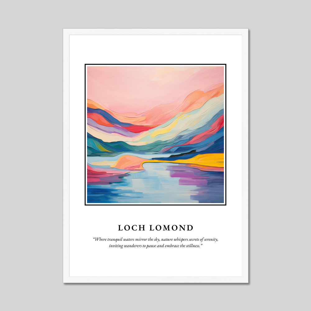 Discover the captivating charm of Scotland with our exquisitely framed poster print, perfect for adorning your walls and immersing yourself in the mystical allure of the Highlands. This stunning 50cm x 70cm piece showcases the word “SCOTLAND” boldly emblazoned at the top, drawing immediate attention to this majestic scene. Below, a breathtaking depiction of Loch Lomond unfolds in a mesmerising “Color Field” style, with sweeping bands of vibrant hues invoking the tranquil harmony of the landscape. Beneath the painting, the evocative quote, “Where tranquil waters mirror the sky, nature whispers secrets of serenity, inviting wanderers to pause and embrace the stillness,” invites reflection and serenity.